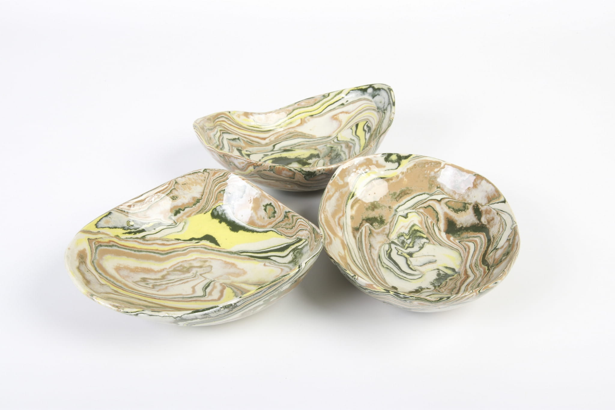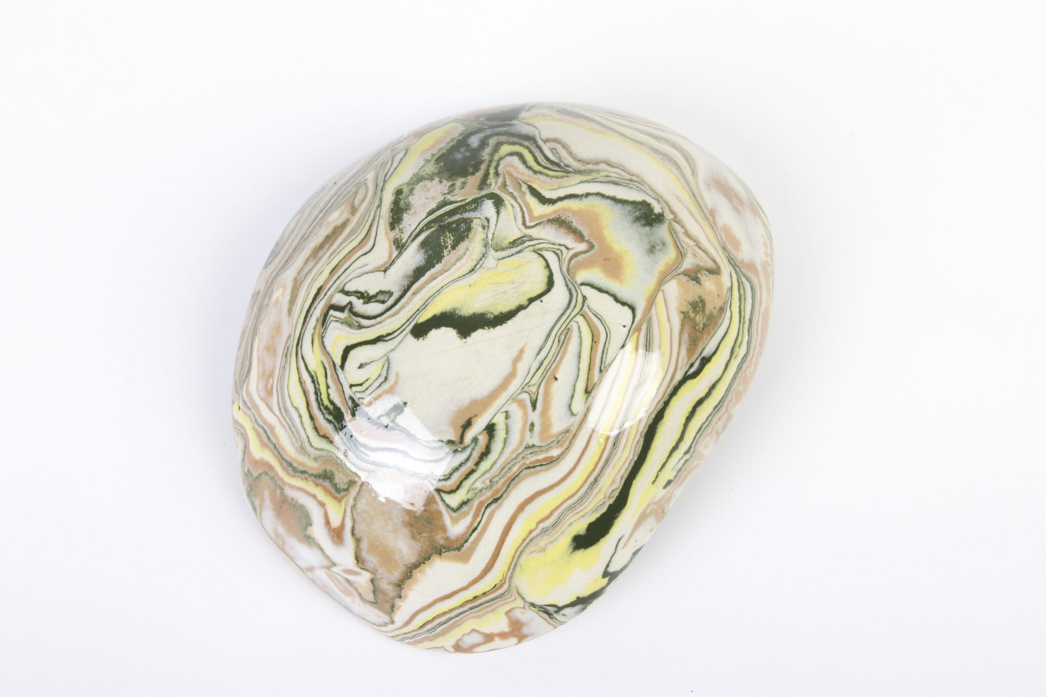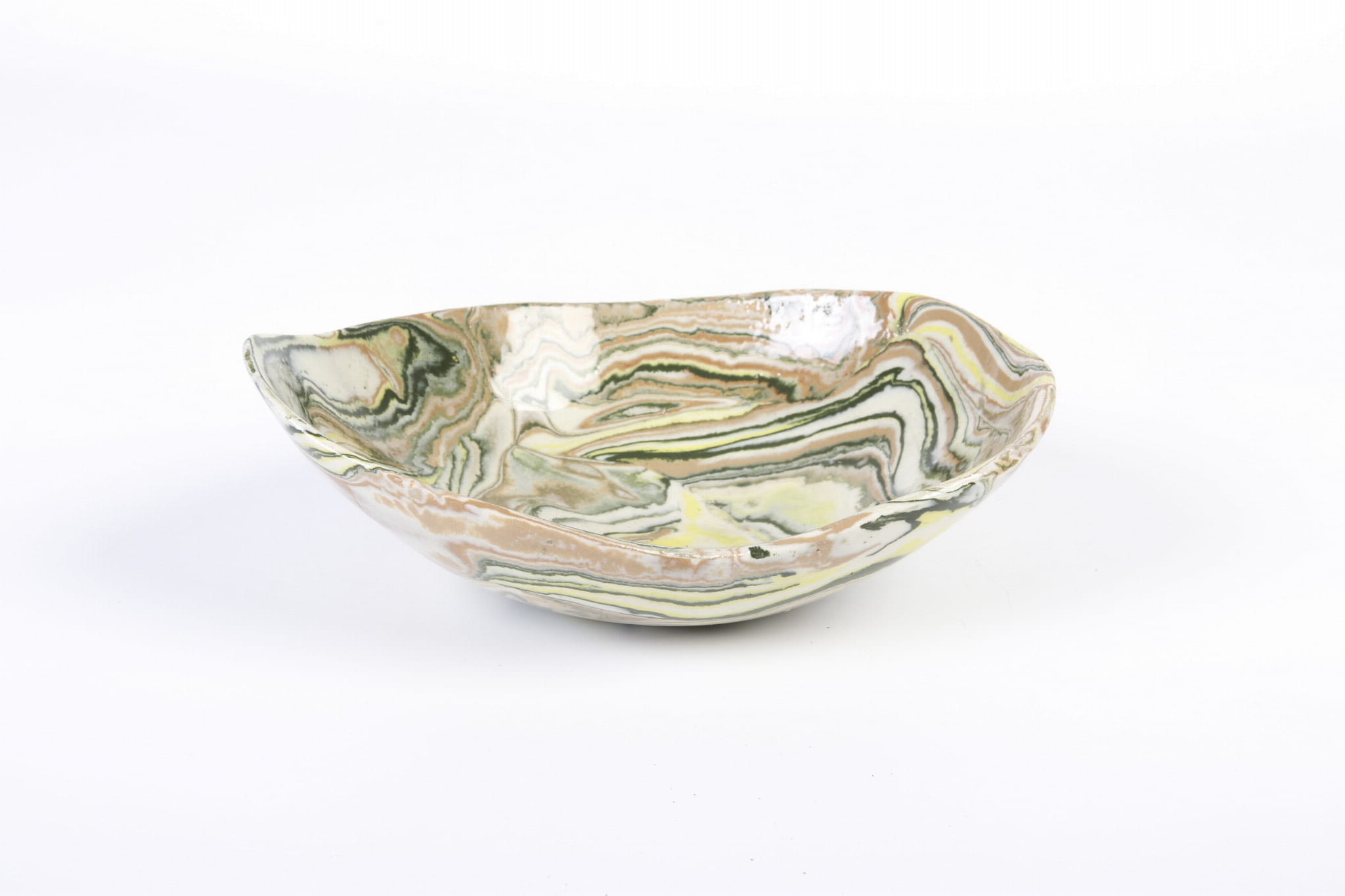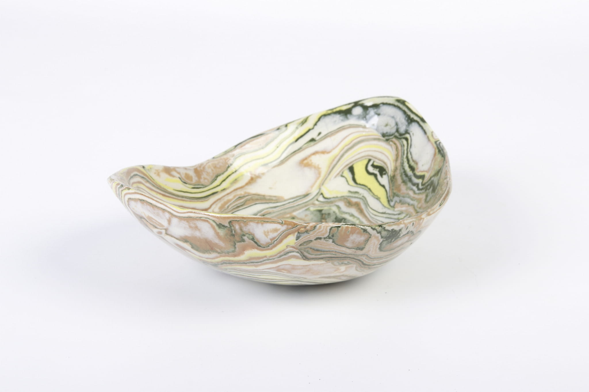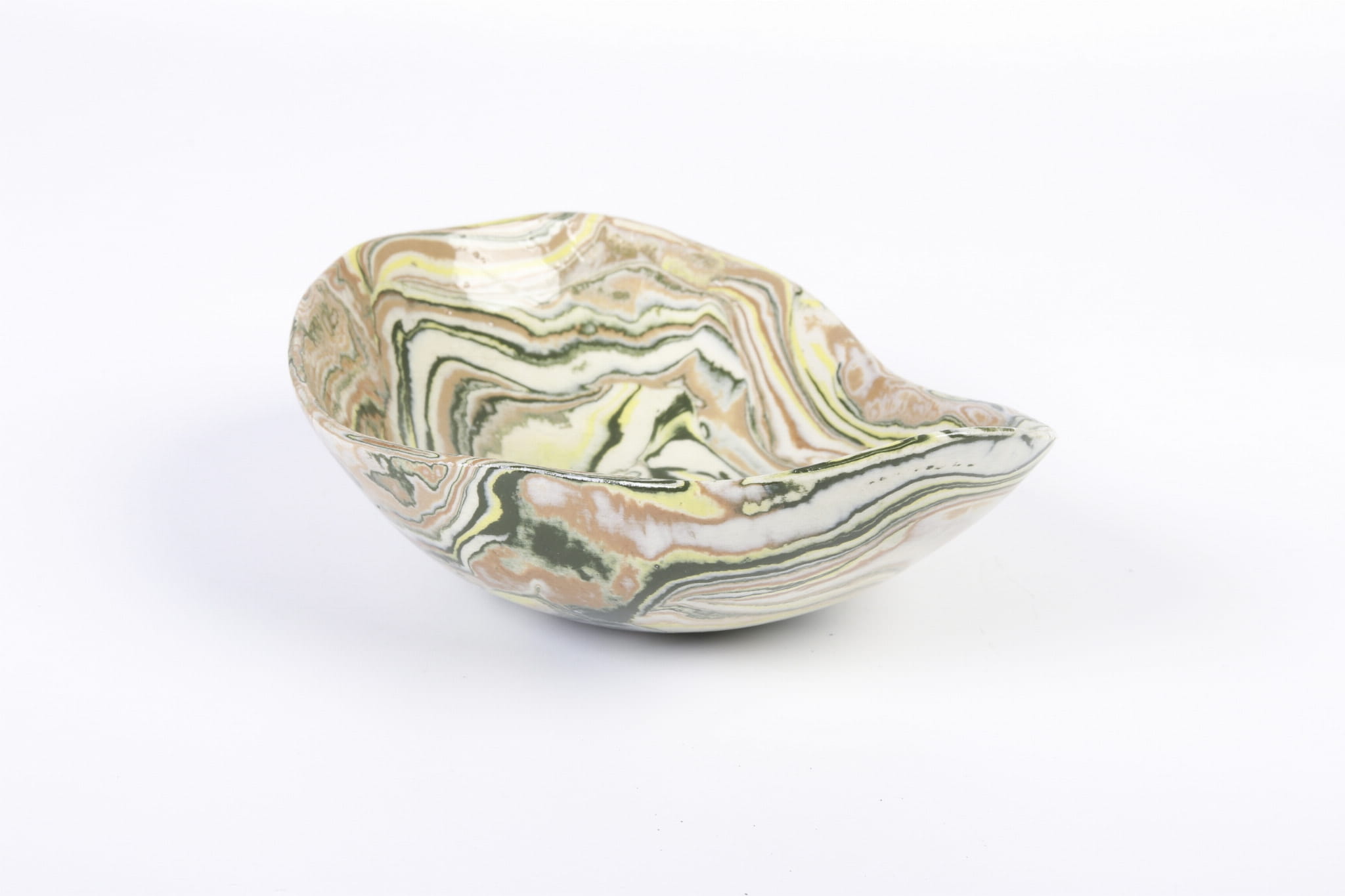 Ta miseczka została ręcznie ukształtowana z kompozycji zabarwionych pigmentami pasów gliny. Efekt końcowy przypomina marmur lub agat. Doskonale prezentuje się we wnętrzach zaprojektowanych w stylu wabi sabi, ale nie tylko. Każda z misek jest wyjątkowa. Kolory: biały, żółty, ciemnozielony i ochra.