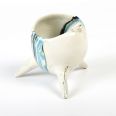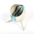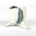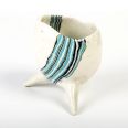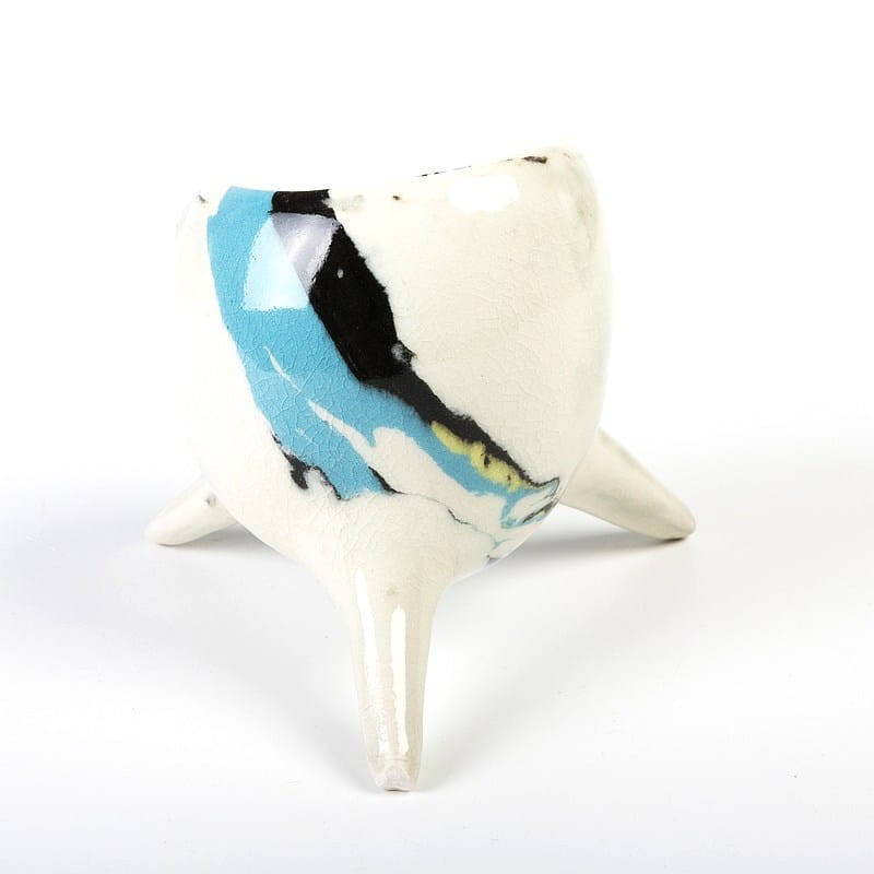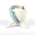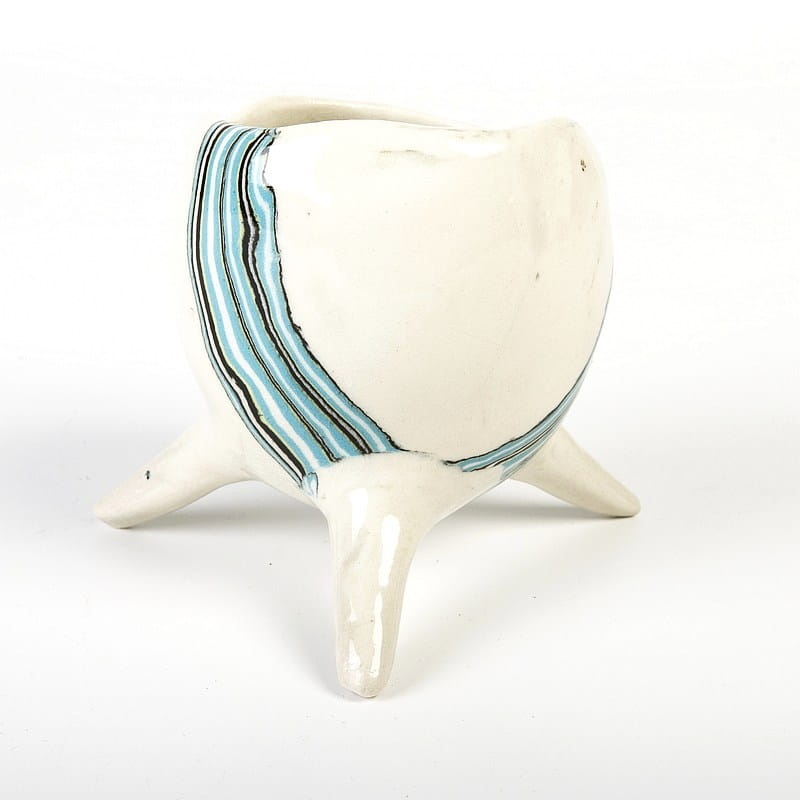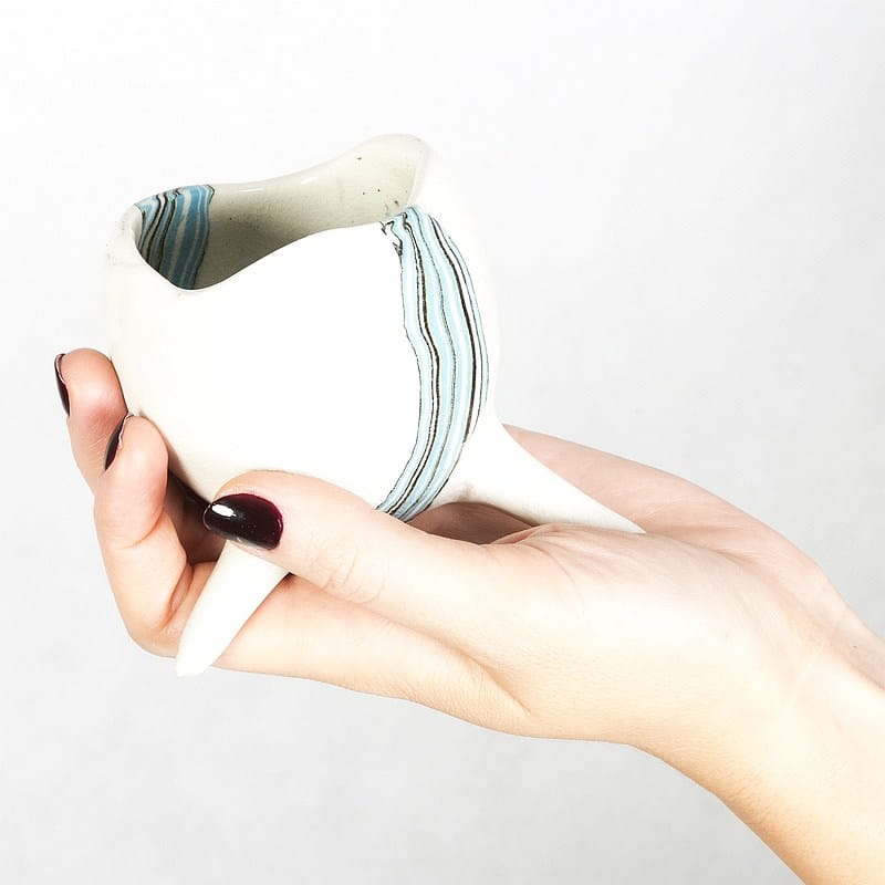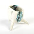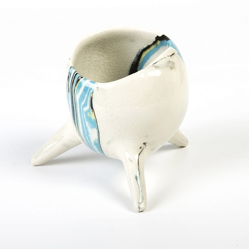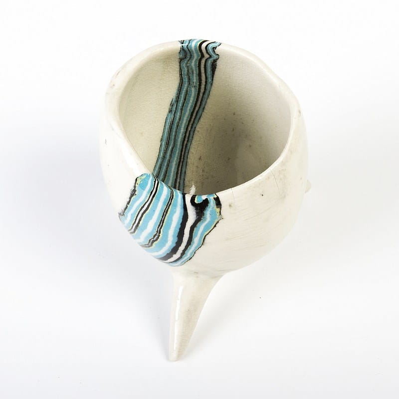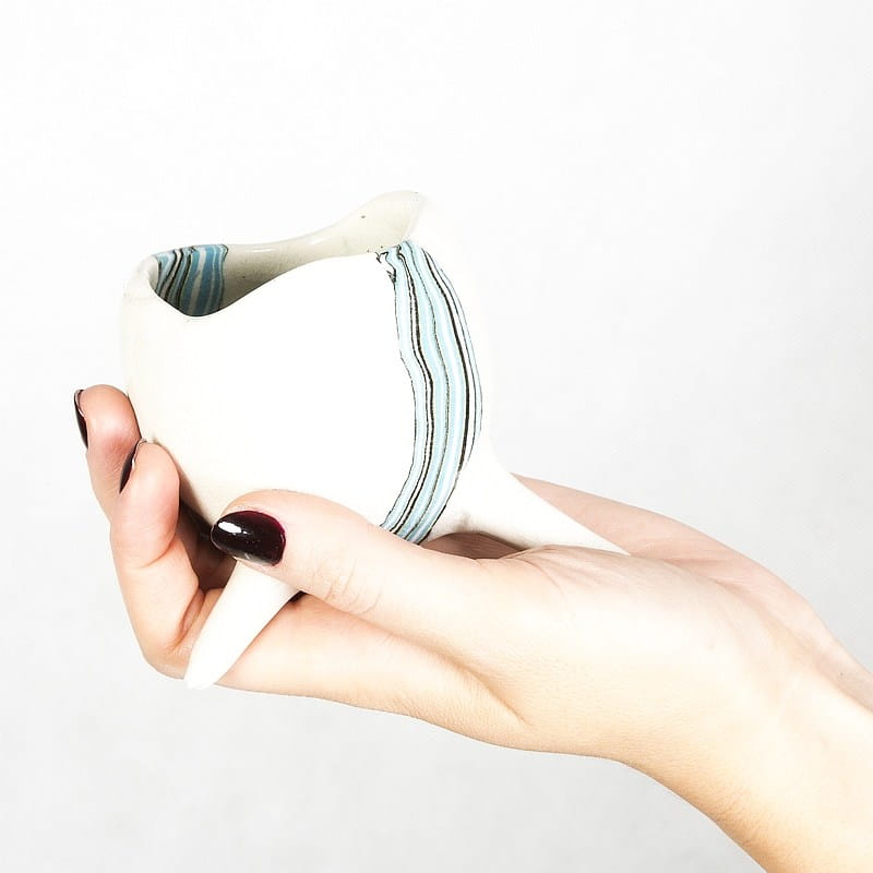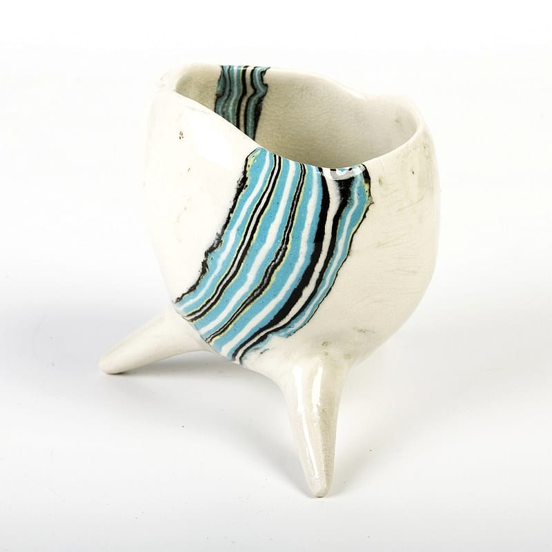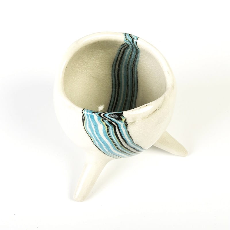 Białe naczynko z ceramiki ozdobione wielokolorowym pasem wykonanym techniką ceramiki agatowej (neriage, nerikomi, ceramika marmurkowa). Naczynko wsparte na trzech cienkich nóżkach, formowane na balonie. Osłonka wypalona w wysokiej temperaturze, pokryta szkliwem spożywczym. Spękania szkliwa nie są wadą produktu. Ceramika artystyczna, ceramika handmade. Produkt wykonany od podstaw ręcznie w małej pracowni na południu Polski.