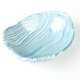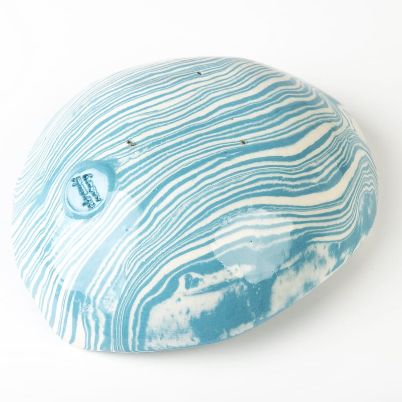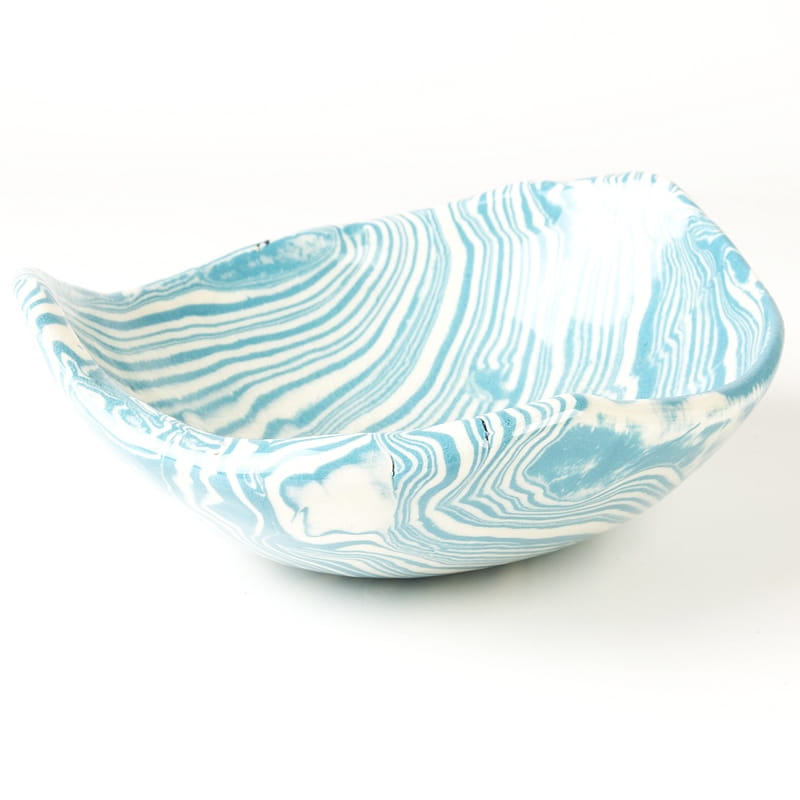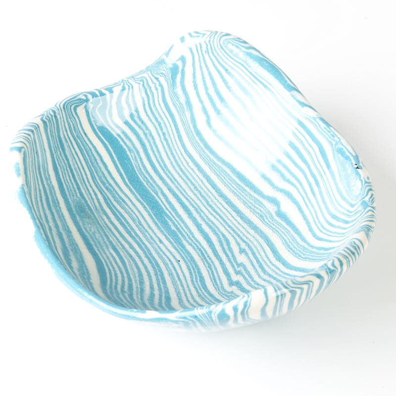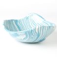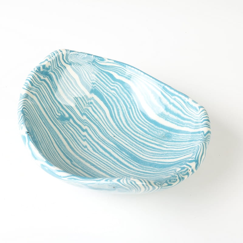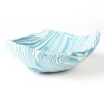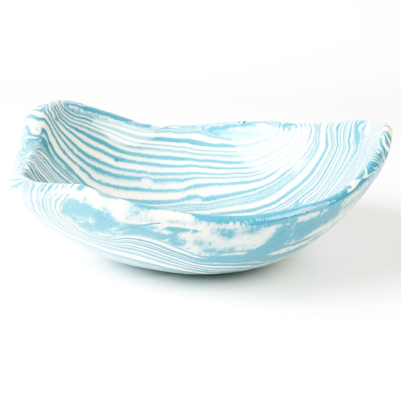 Biało-niebieska misa w średnim rozmiarze, o nieregularnym kształcie, wykonana ręcznie techniką ceramiki agatowej. Naczynie może być wykorzystywane w celach spożywczych, można je też zastosować jako podstawkę na drobiazgi lub ozdobę samą w sobie.