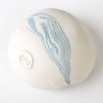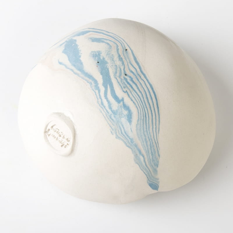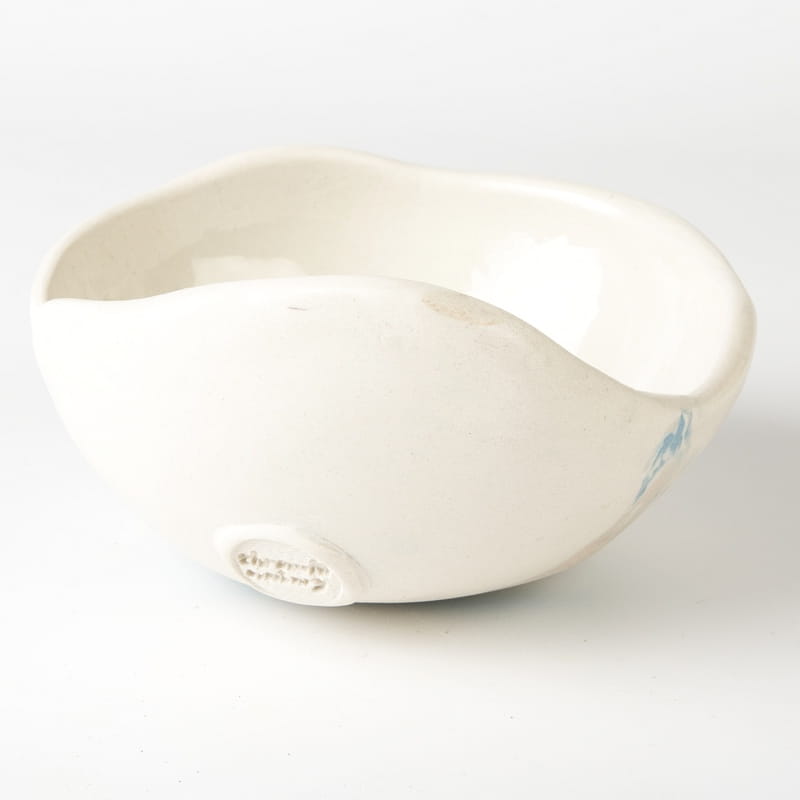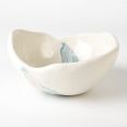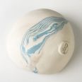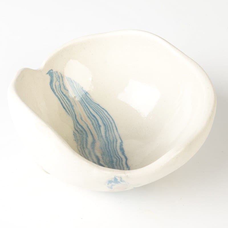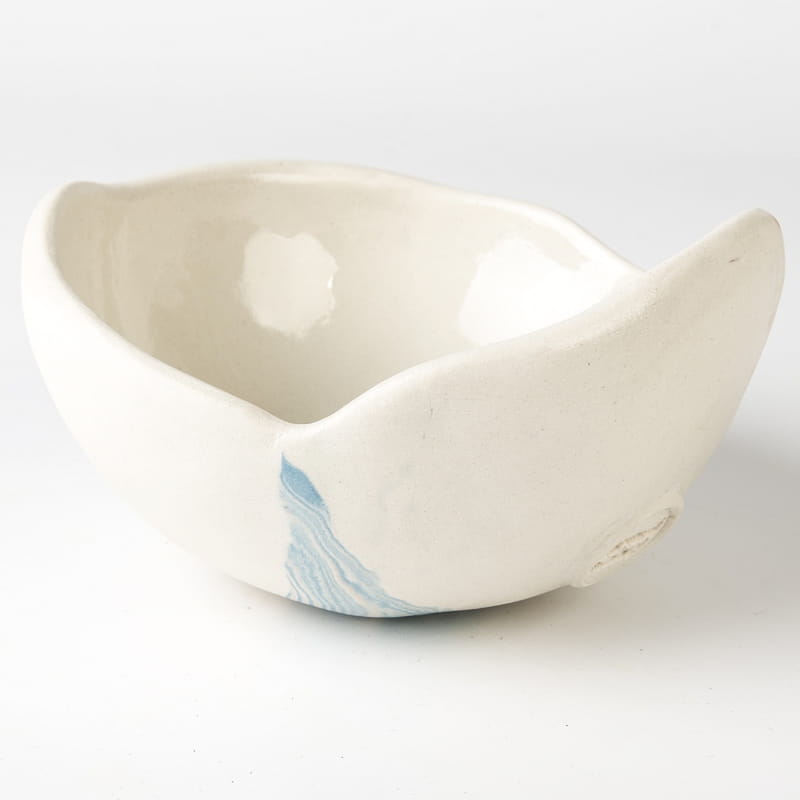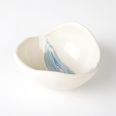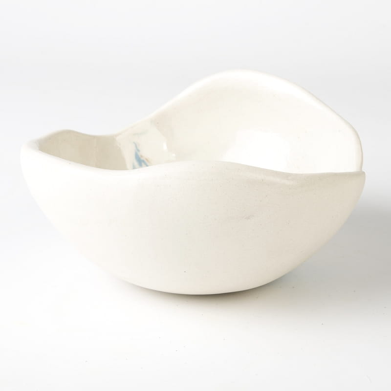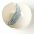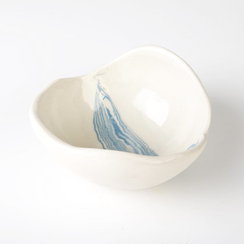 Biało-niebieska, głęboka miska w średnim rozmiarze, o nieregularnym kształcie, wykonana ręcznie techniką ceramiki agatowej. Naczynie może być wykorzystywane w celach spożywczych, można je też zastosować jako podstawkę na drobiazgi lub ozdobę samą w sobie.