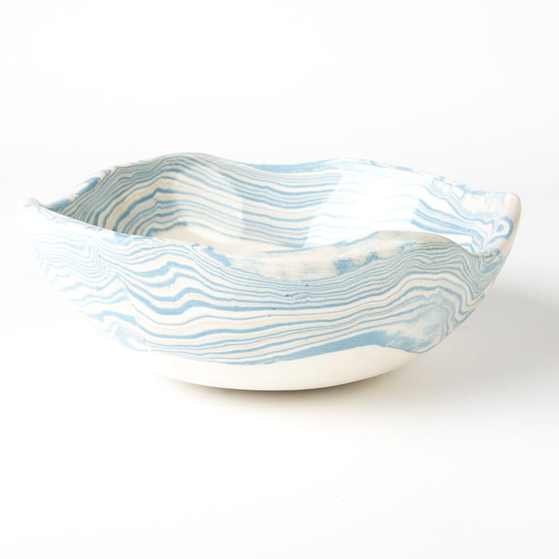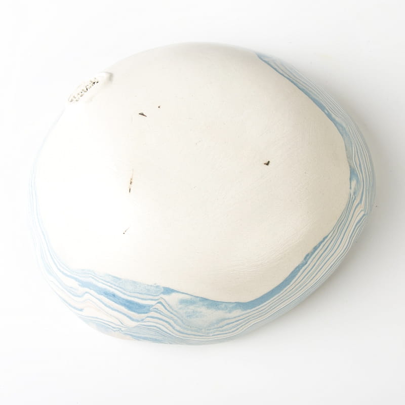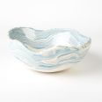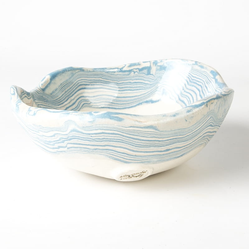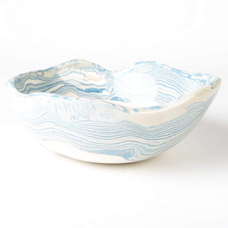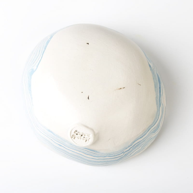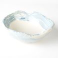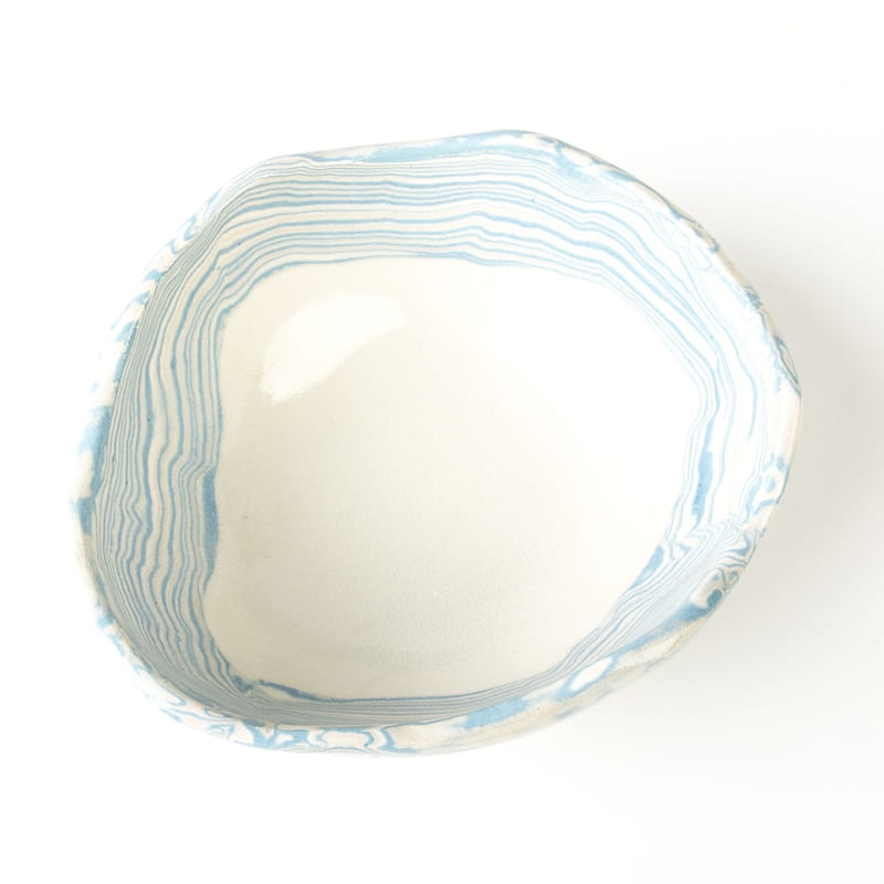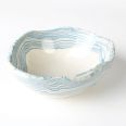 Biało-niebieska, głęboka miska w średnim rozmiarze, o nieregularnym kształcie, wykonana ręcznie techniką ceramiki agatowej. Naczynie może być wykorzystywane w celach spożywczych, można je też zastosować jako podstawkę na drobiazgi lub ozdobę samą w sobie.
