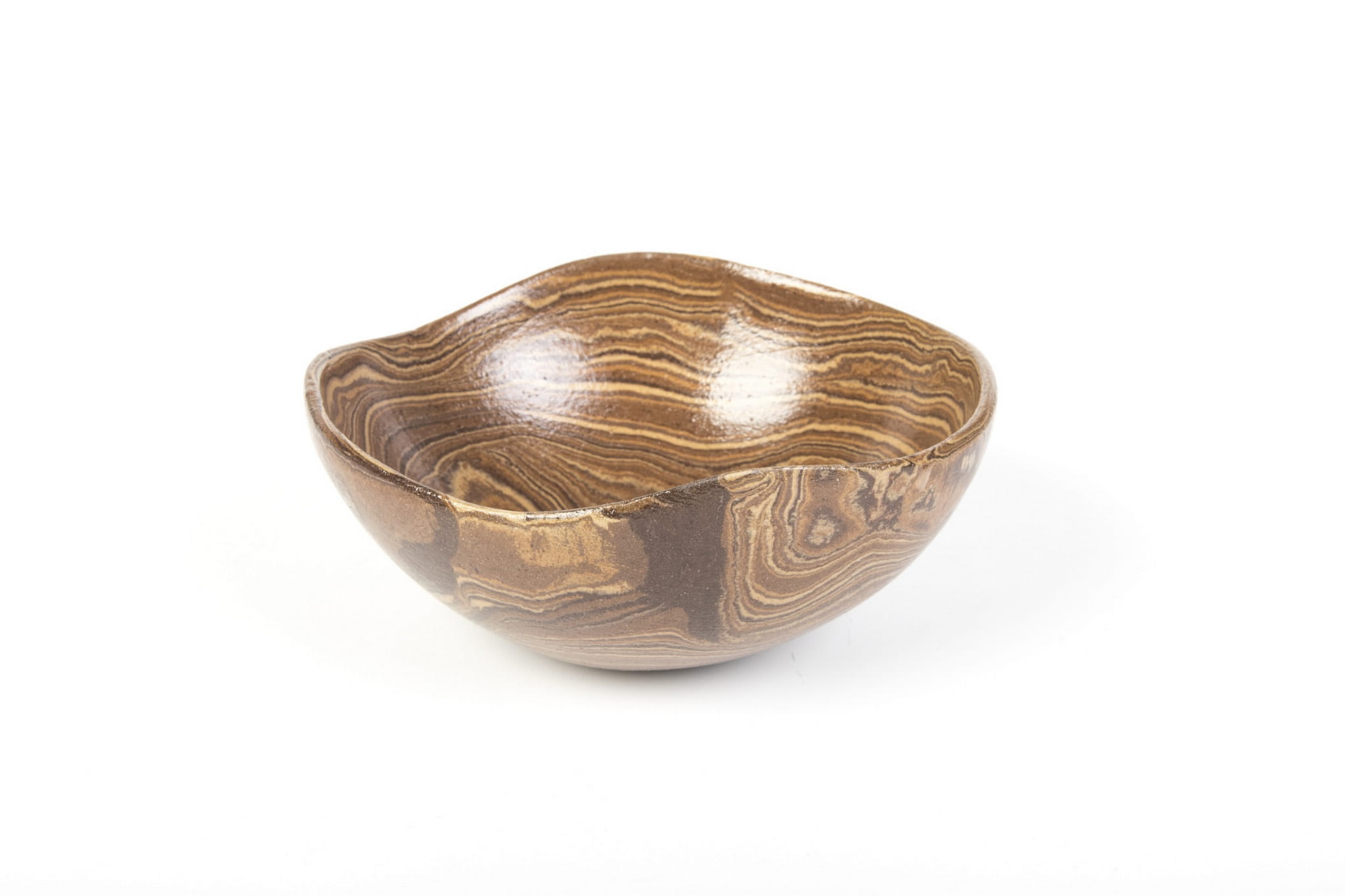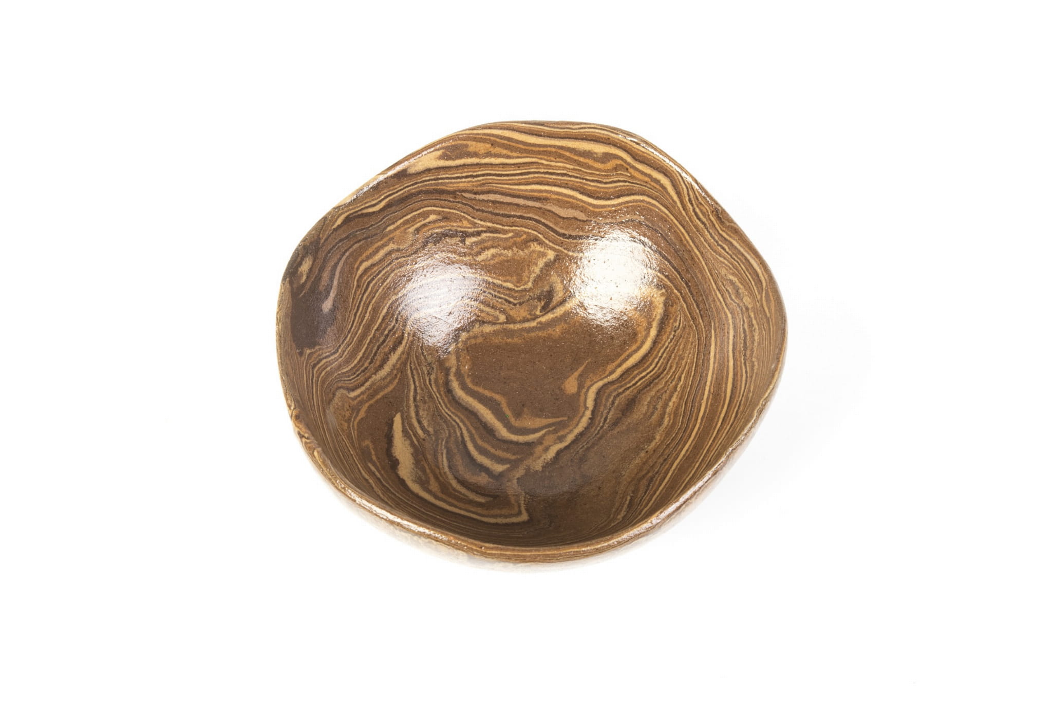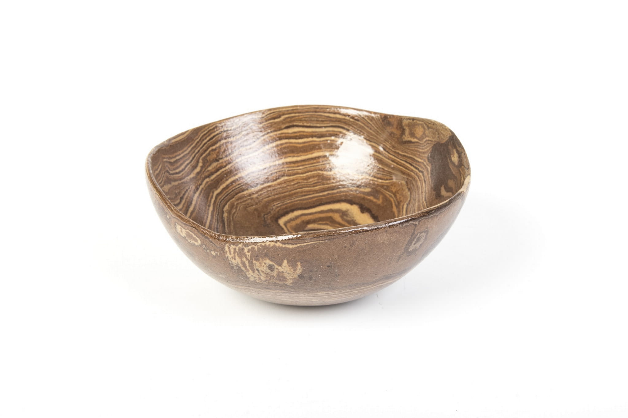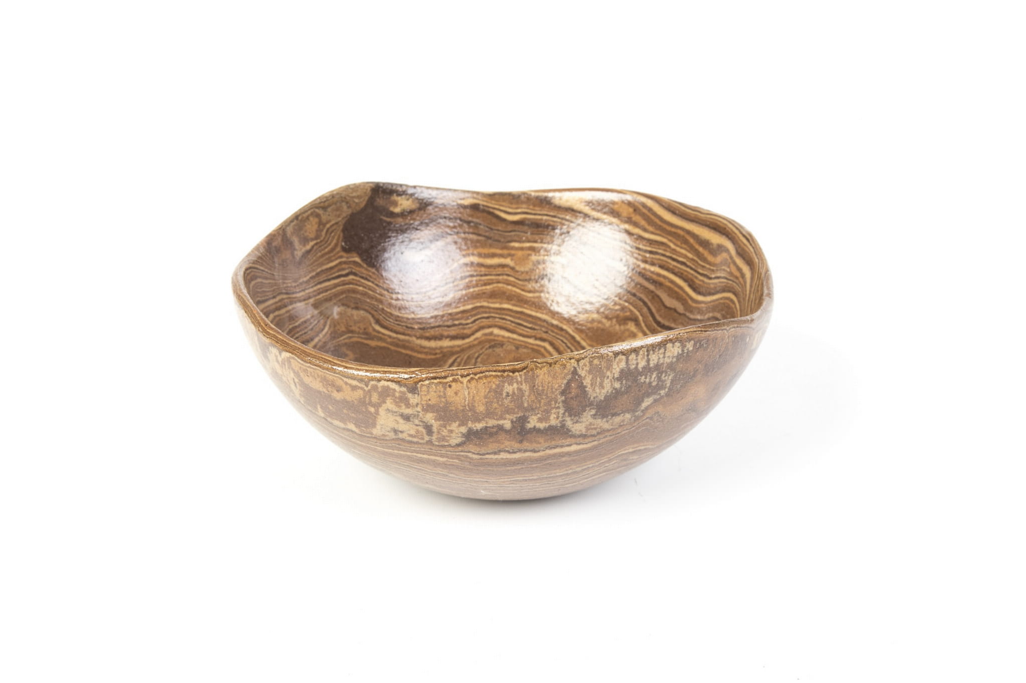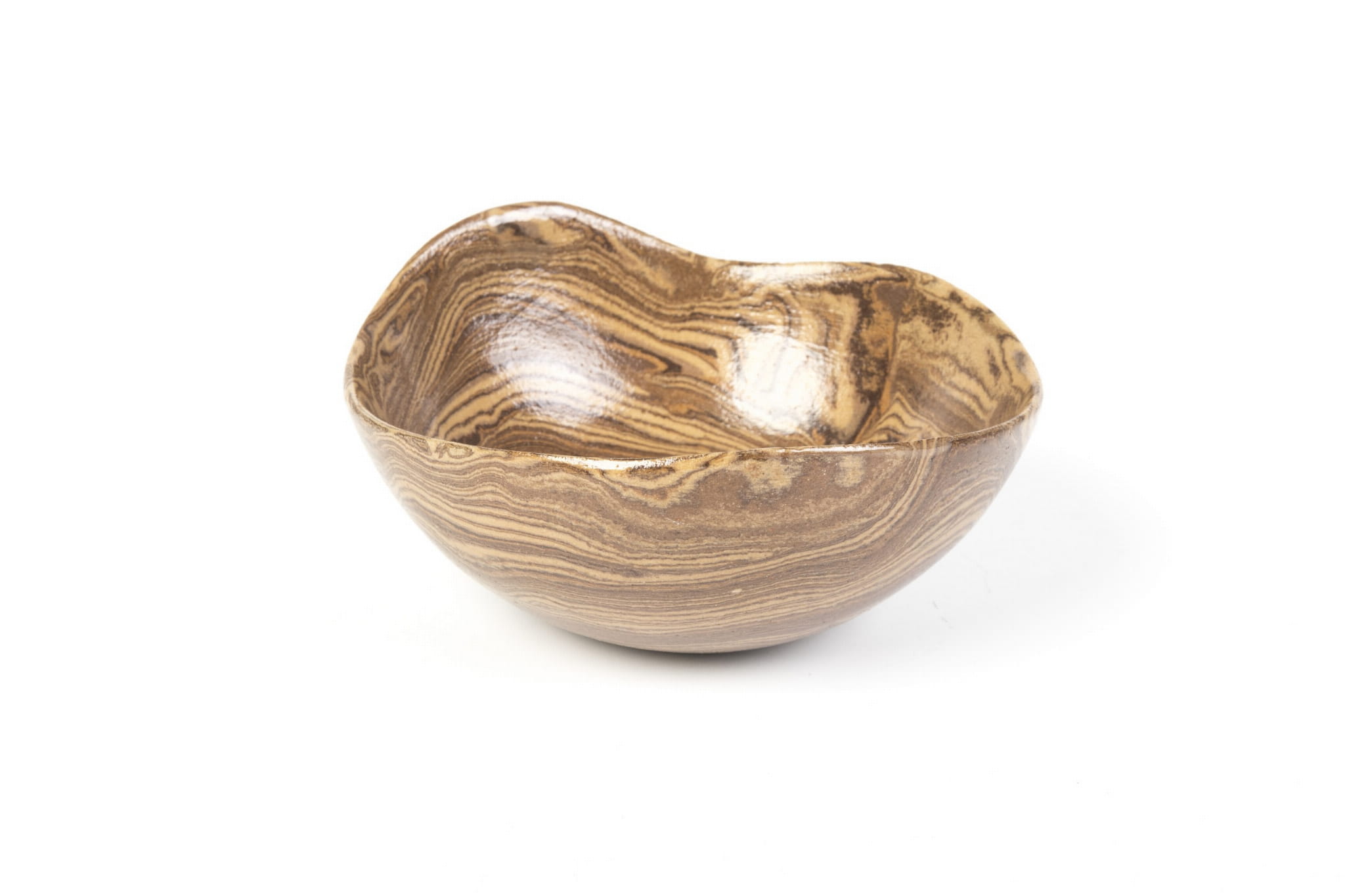 Średnich rozmiarów (szer. 12,5 cm; wys. 6 cm) ceramiczna miseczka wykonana techniką ceramiki agatowej. Dzięki zabarwieniu gliny brązowymi pigmentem uzyskano efekt wizualny imitujący słoje drewna. Miseczka dodatkowo została pokryta matowym szkliwem spożywczym.