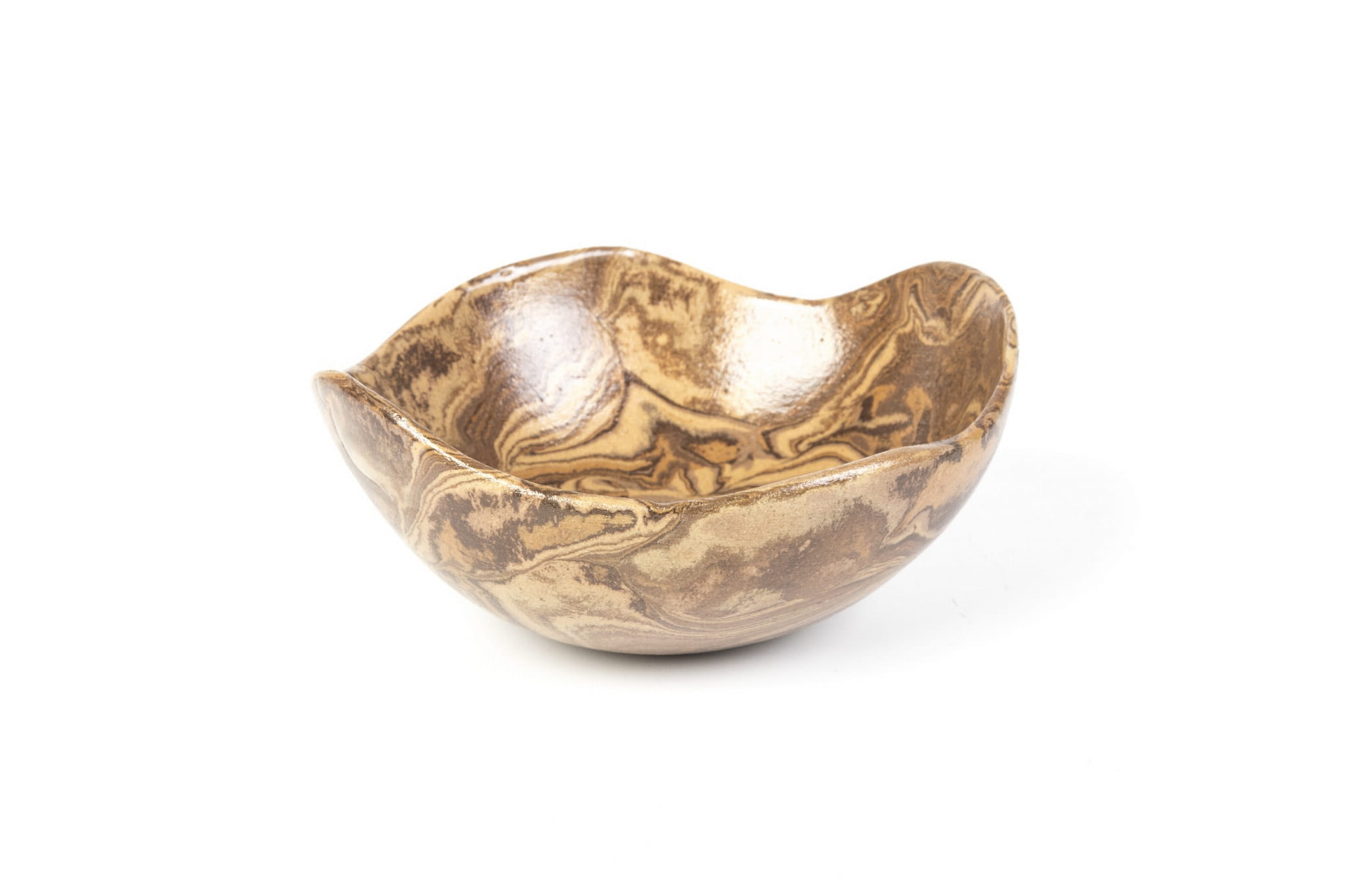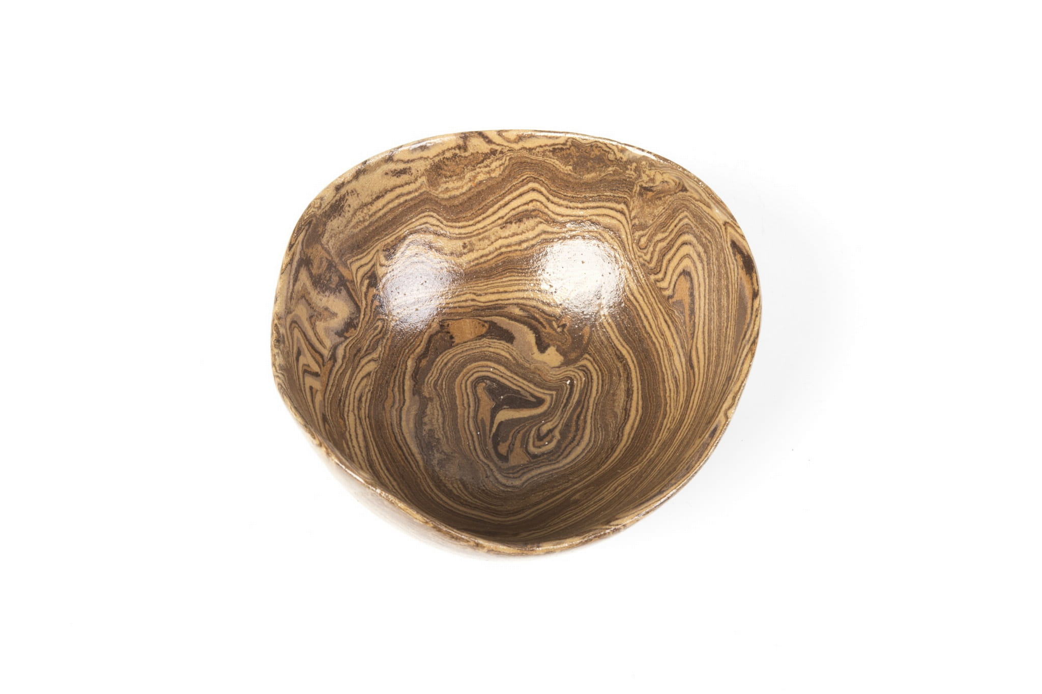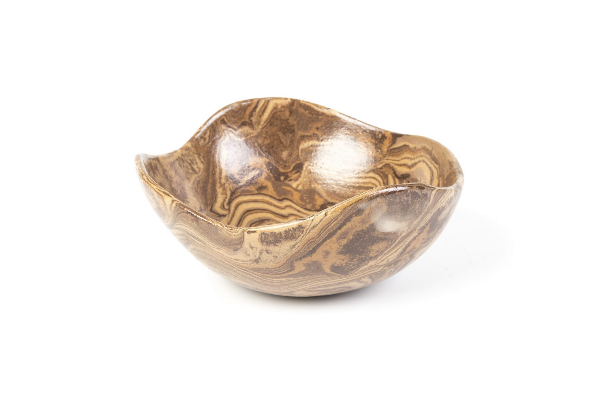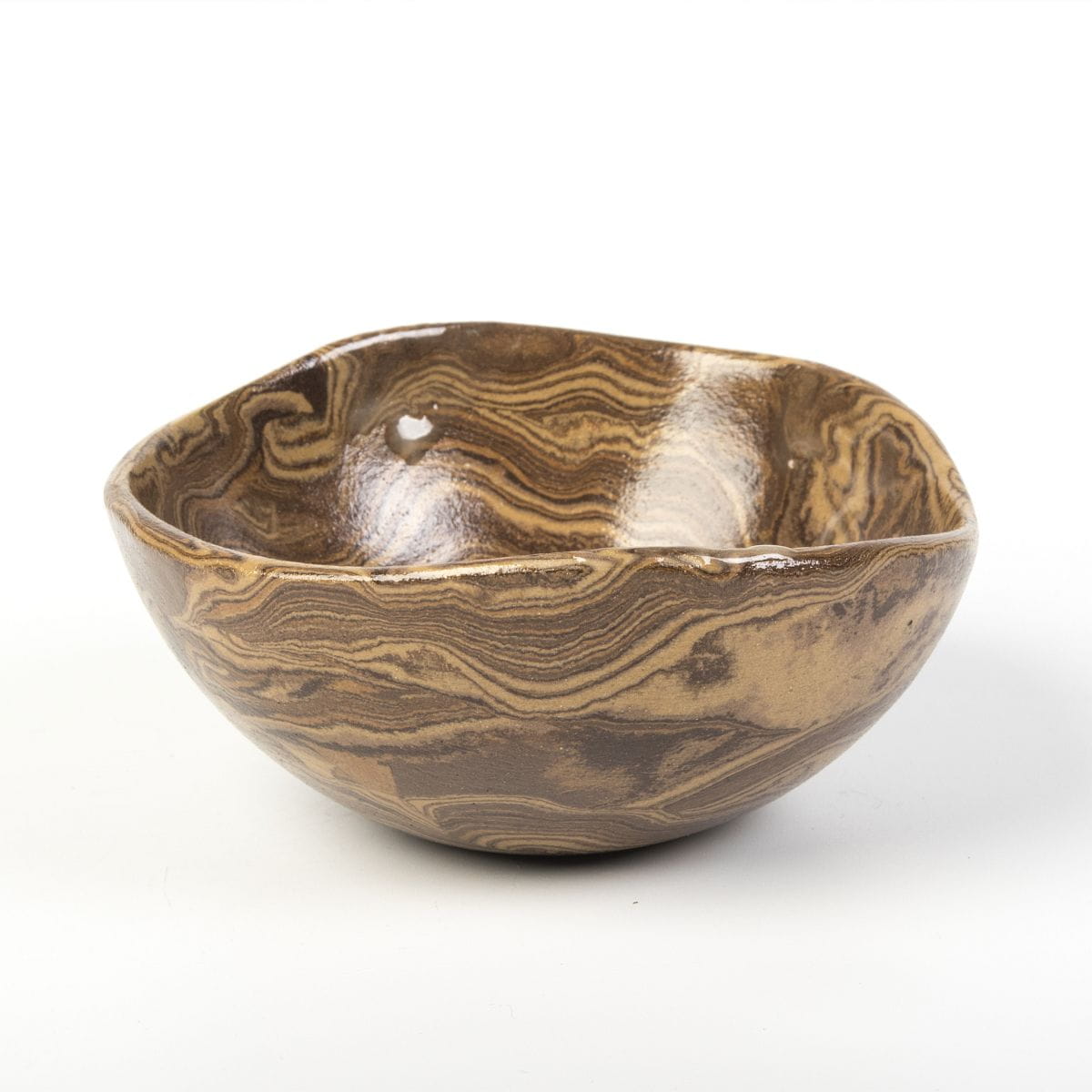 Średnich rozmiarów (szer. 12,5 cm; wys. 6 cm) ceramiczna miseczka wykonana techniką ceramiki agatowej. Dzięki zabarwieniu gliny brązowymi pigmentem uzyskano efekt wizualny imitujący słoje drewna. Miseczka dodatkowo została pokryta matowym szkliwem spożywczym.
