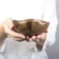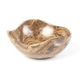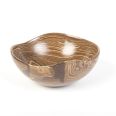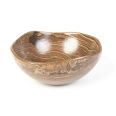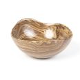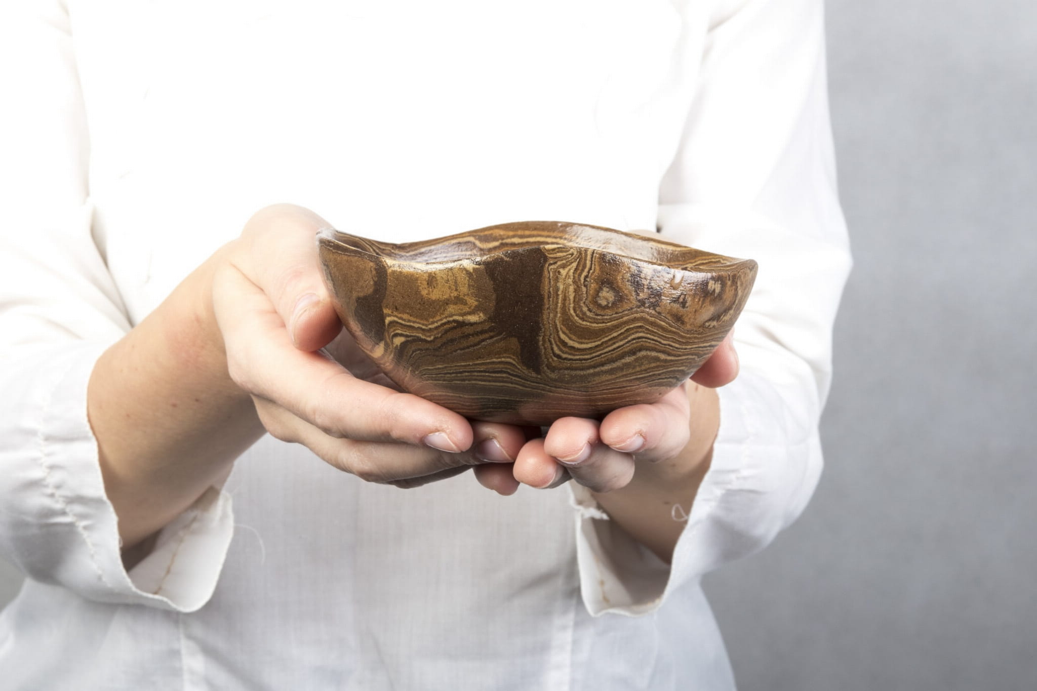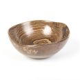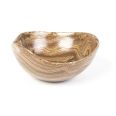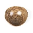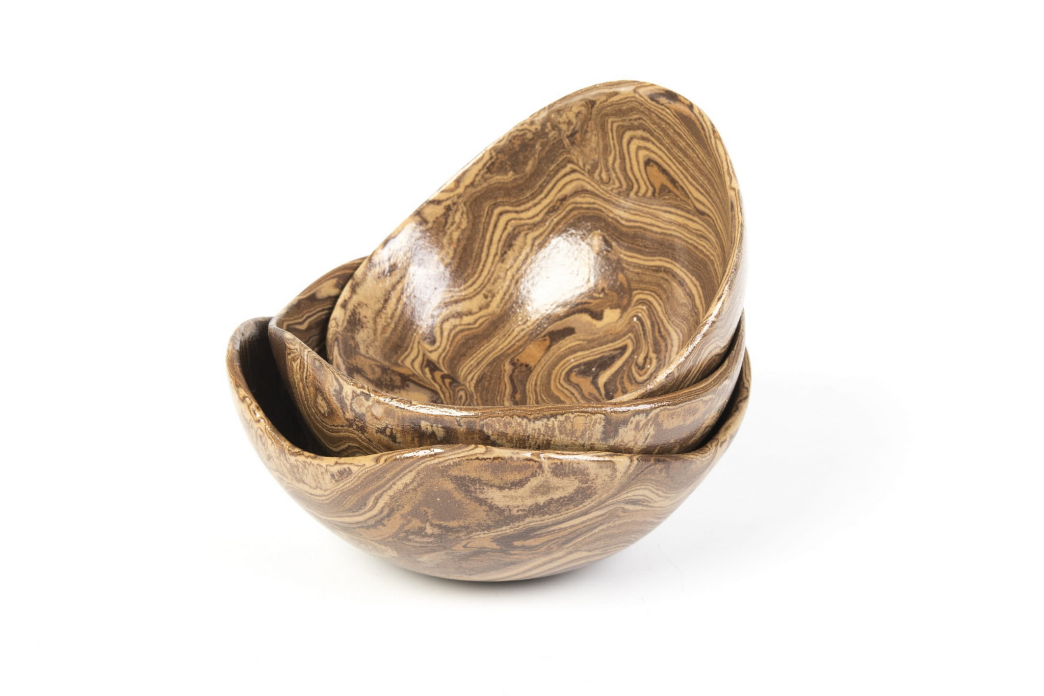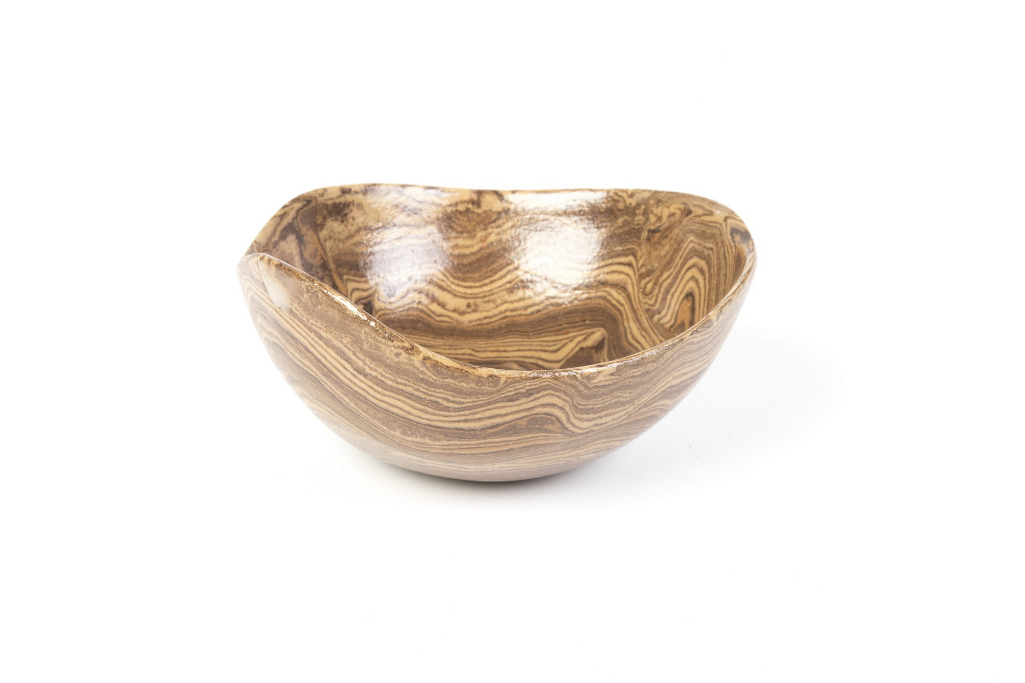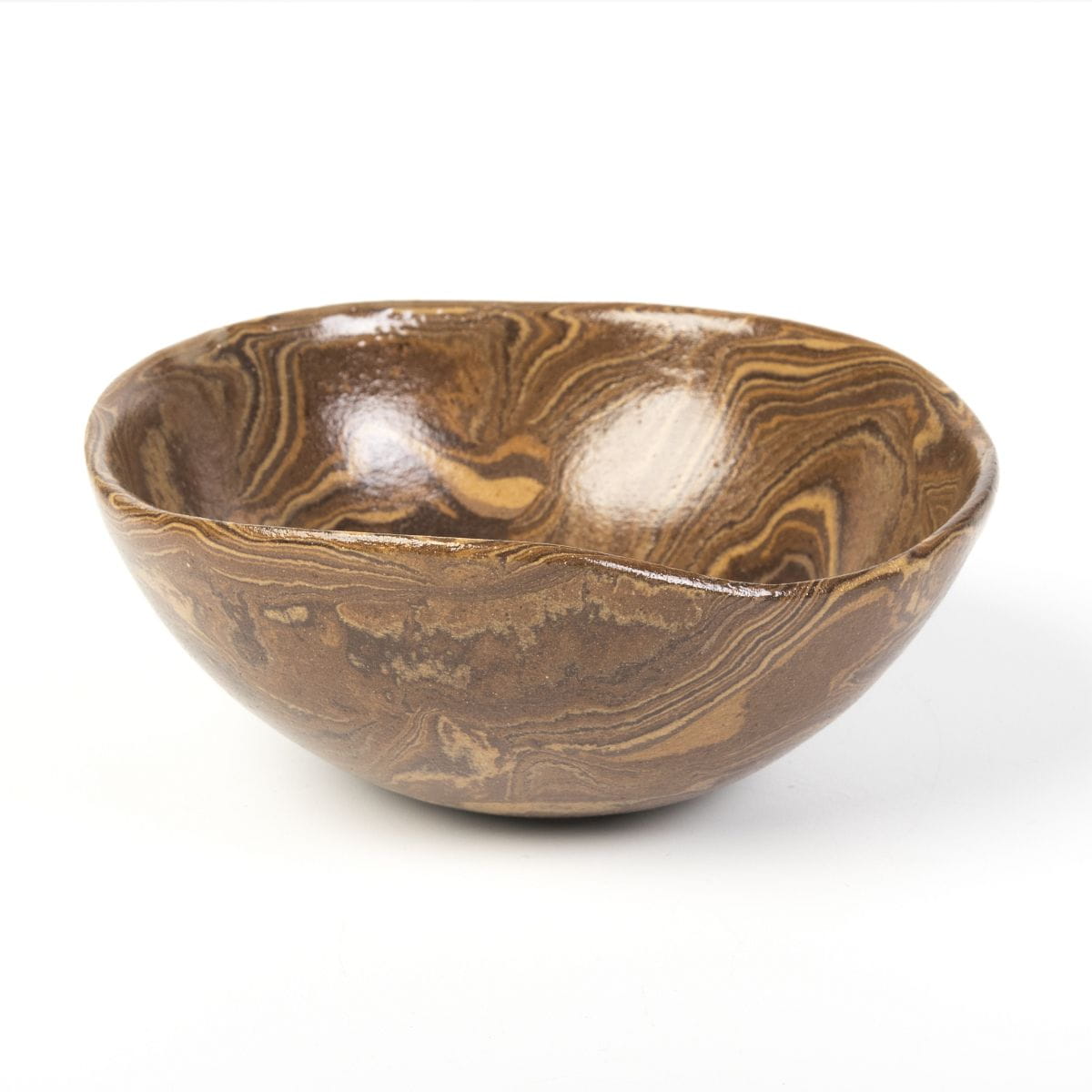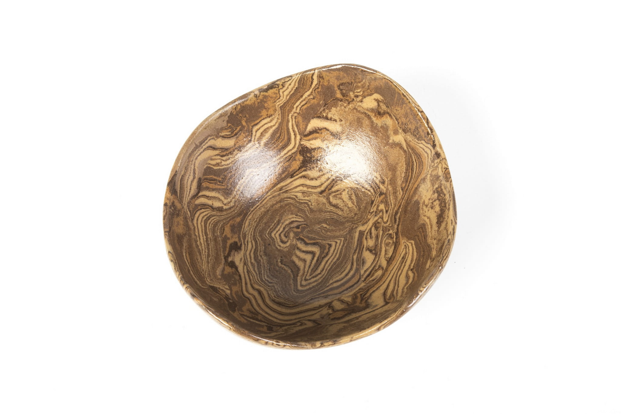 Średnich rozmiarów (szer. 12,5 cm; wys. 6 cm) ceramiczna miseczka wykonana techniką ceramiki agatowej. Dzięki zabarwieniu gliny brązowymi pigmentem uzyskano efekt wizualny imitujący słoje drewna. Miseczka dodatkowo została pokryta matowym szkliwem spożywczym.