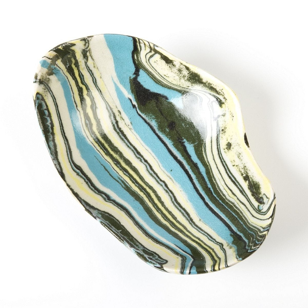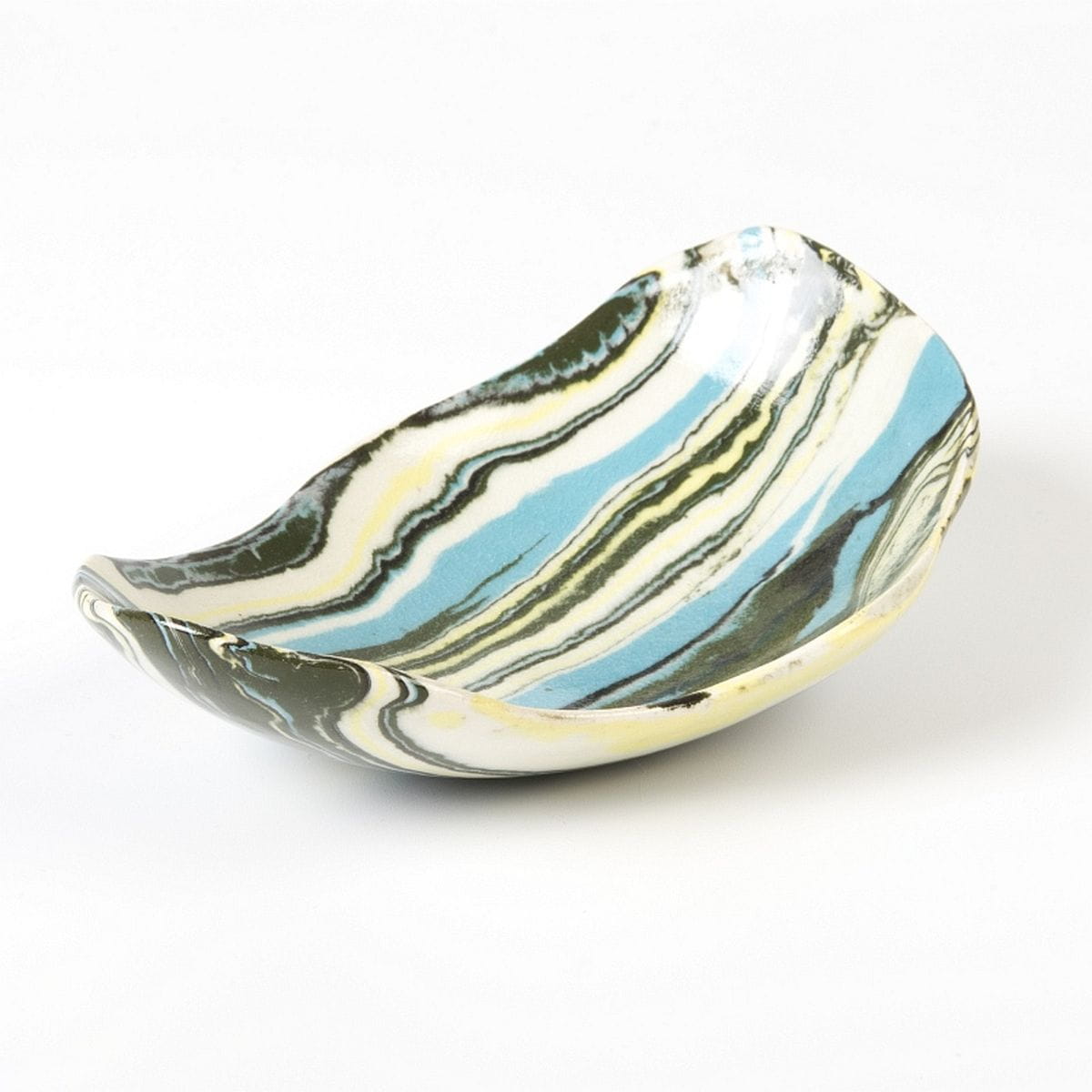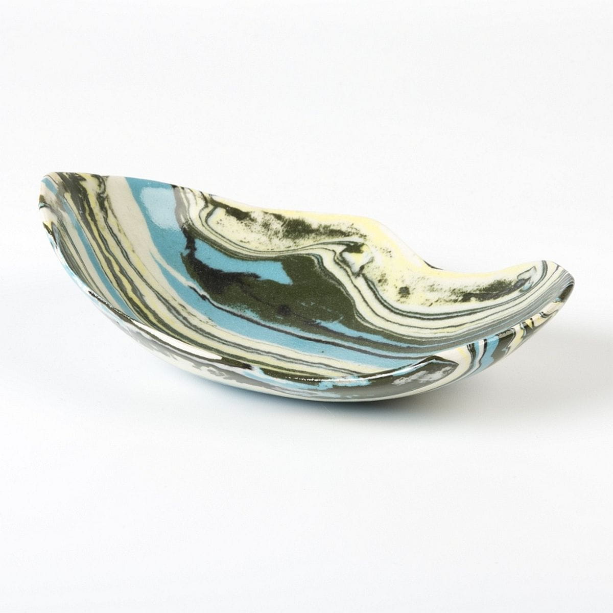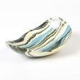 Ceramiczna miseczka wykonana techniką ceramiki agatowej o zbliżonych wymiarach: długość 15 cm, szerokość 10,5 cm, wysokość 5 cm.