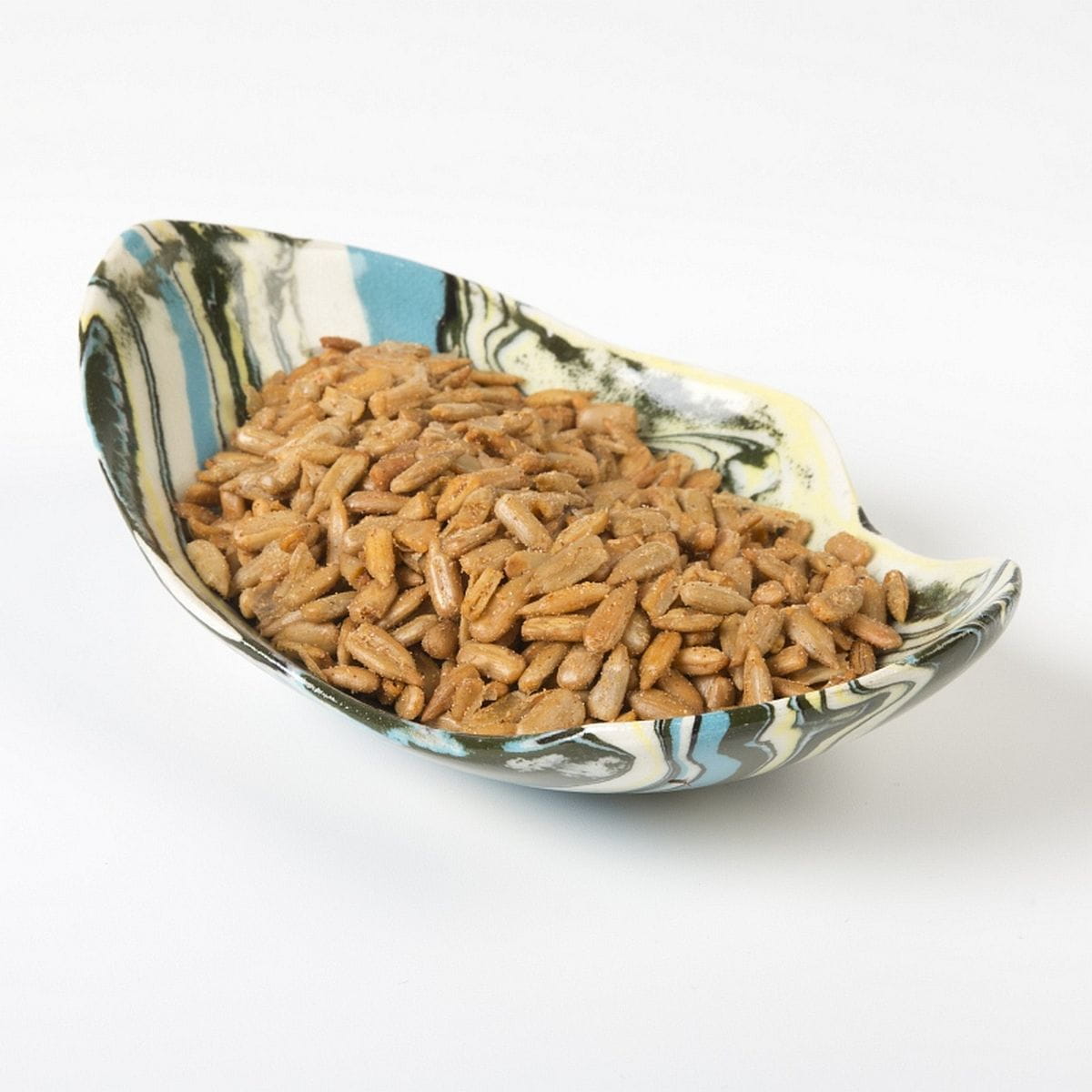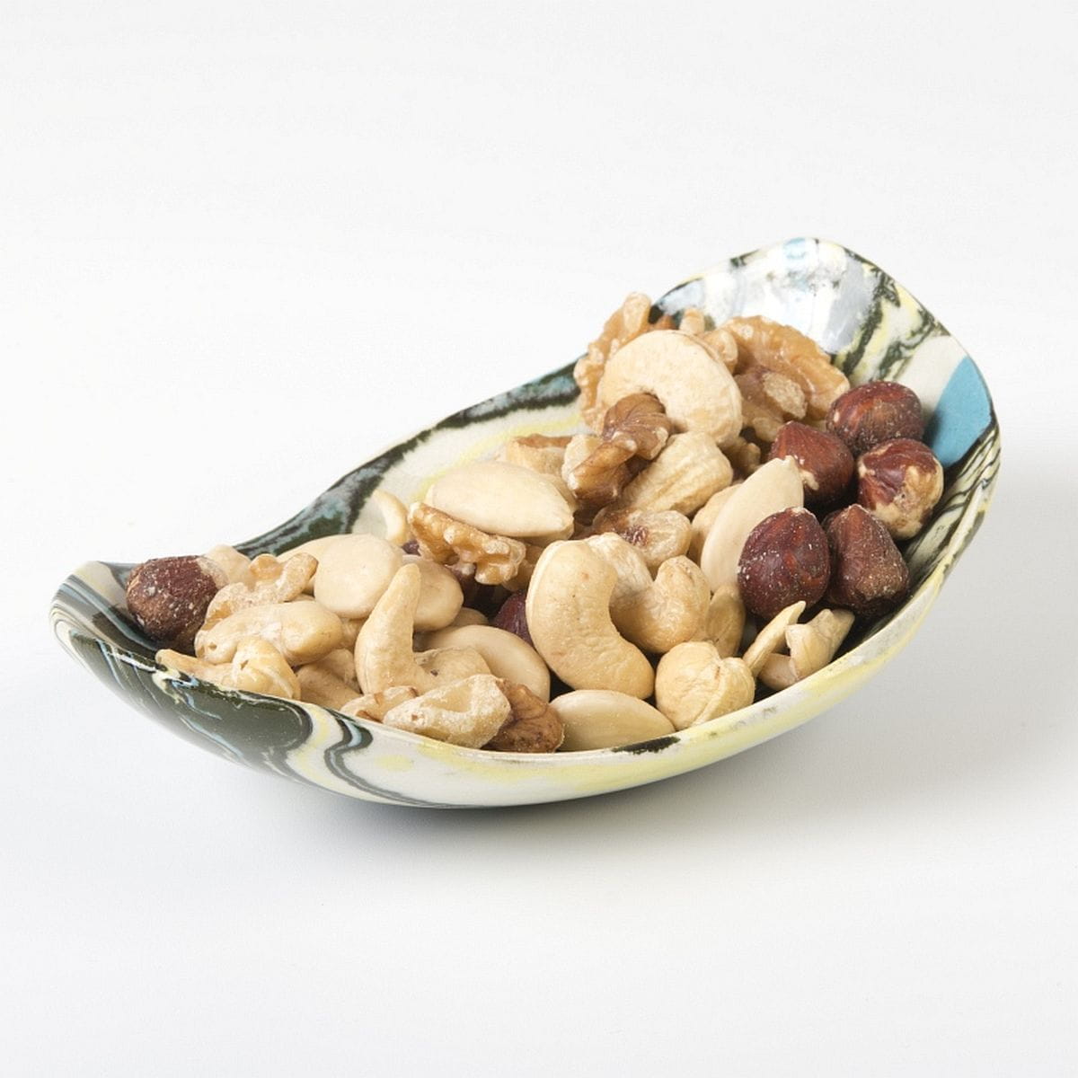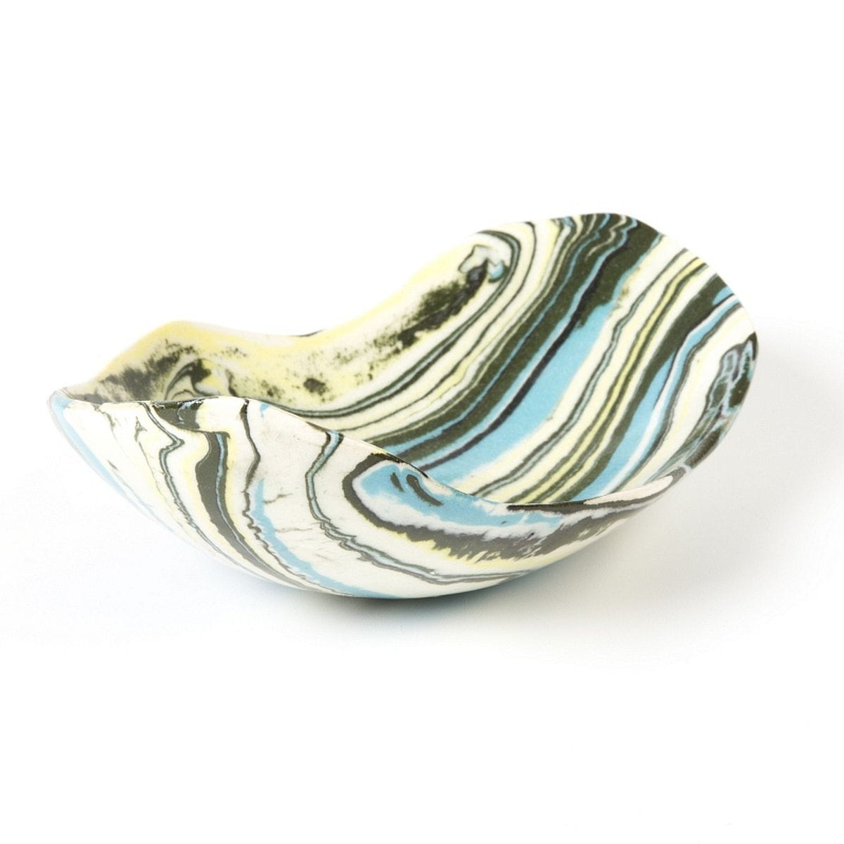 Ceramiczna miseczka wykonana techniką ceramiki agatowej o zbliżonych wymiarach: długość 15 cm, szerokość 10,5 cm, wysokość 5 cm.