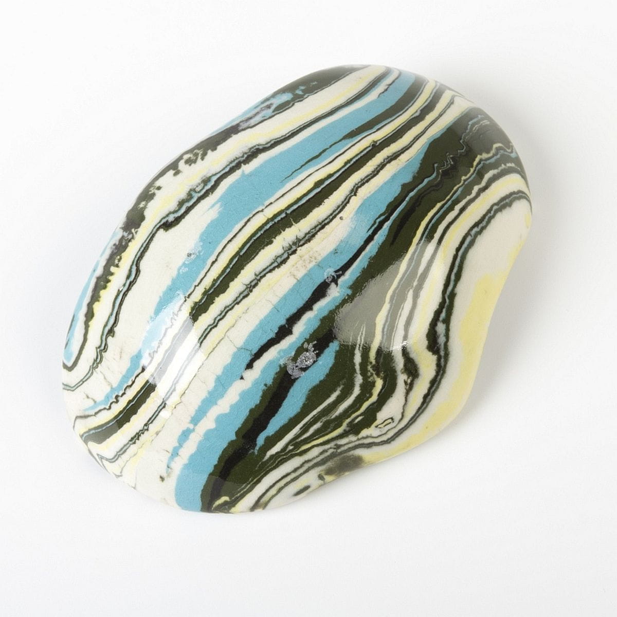 Niewielkich rozmiarów (długość dłoni) miseczka lub podstawka wykonana ręcznie w małej pracowni w Cieszynie. Unikat - dostępna tylko jedna sztuka (na sklepie dostępne podobne, jednak każdy o nieco innych wymiarach i wzorze agatowych pasów).