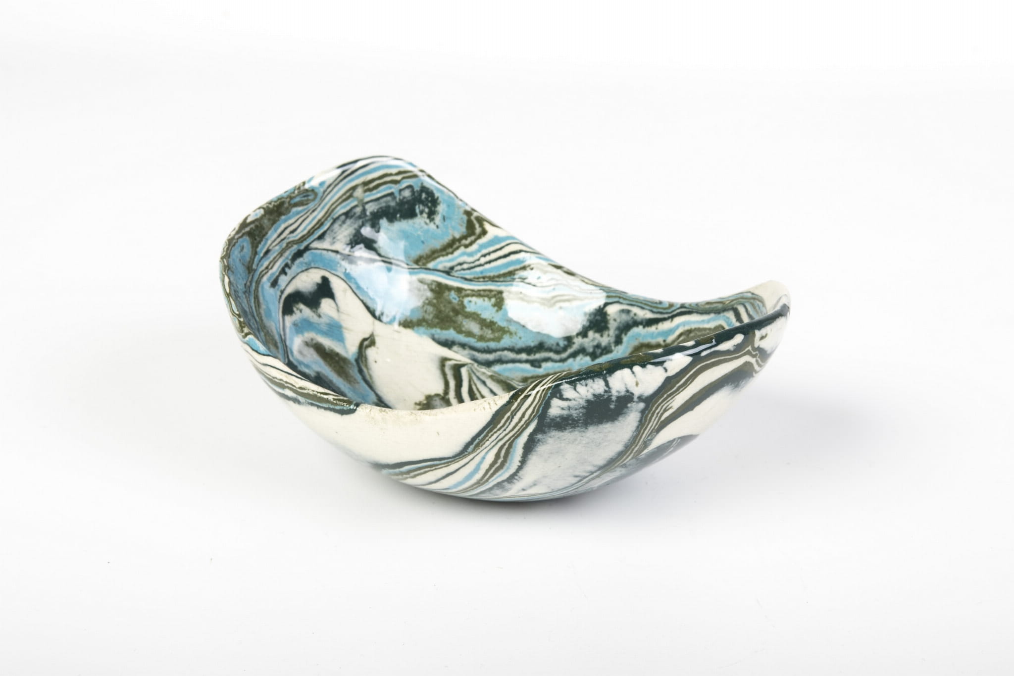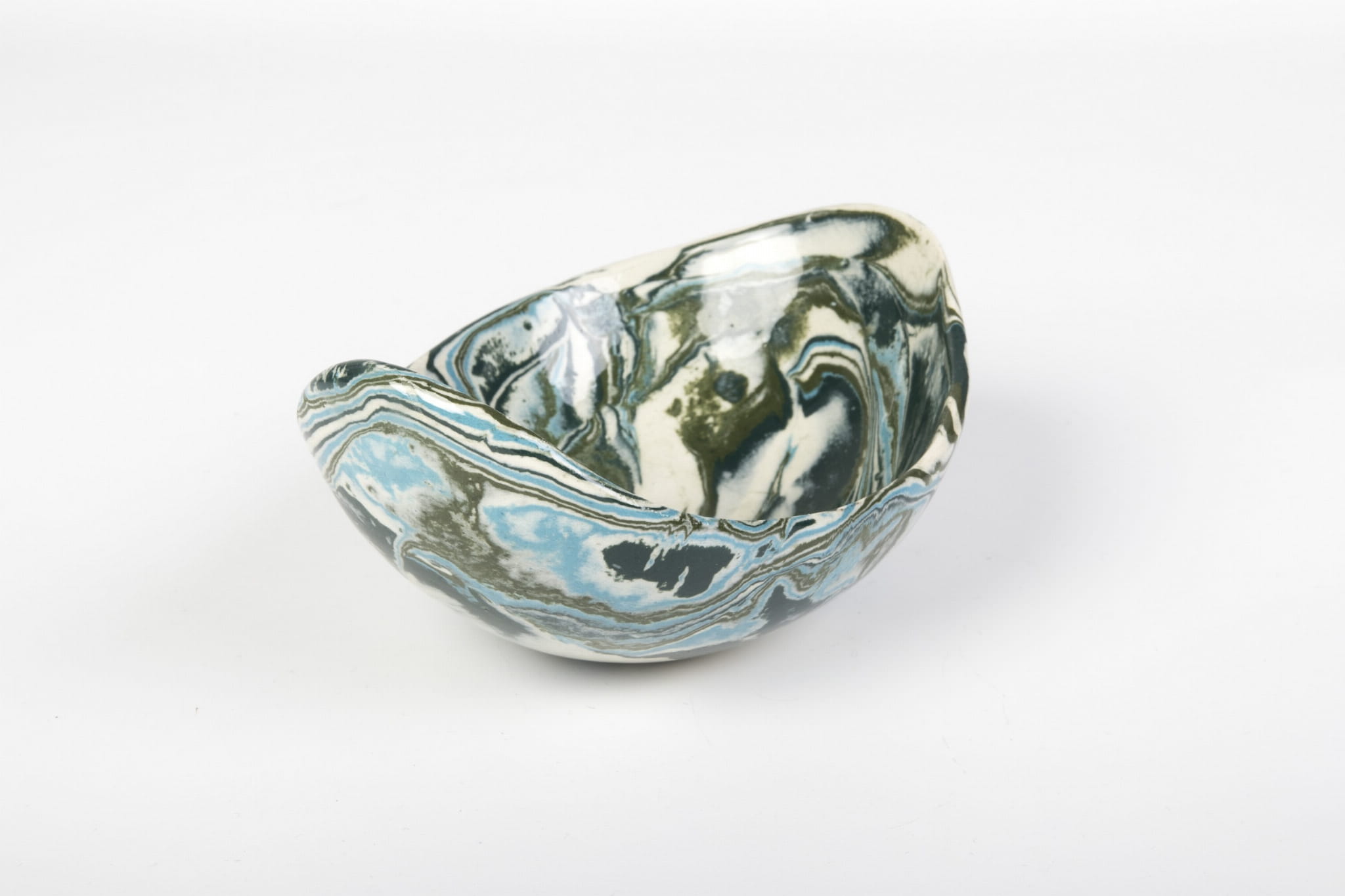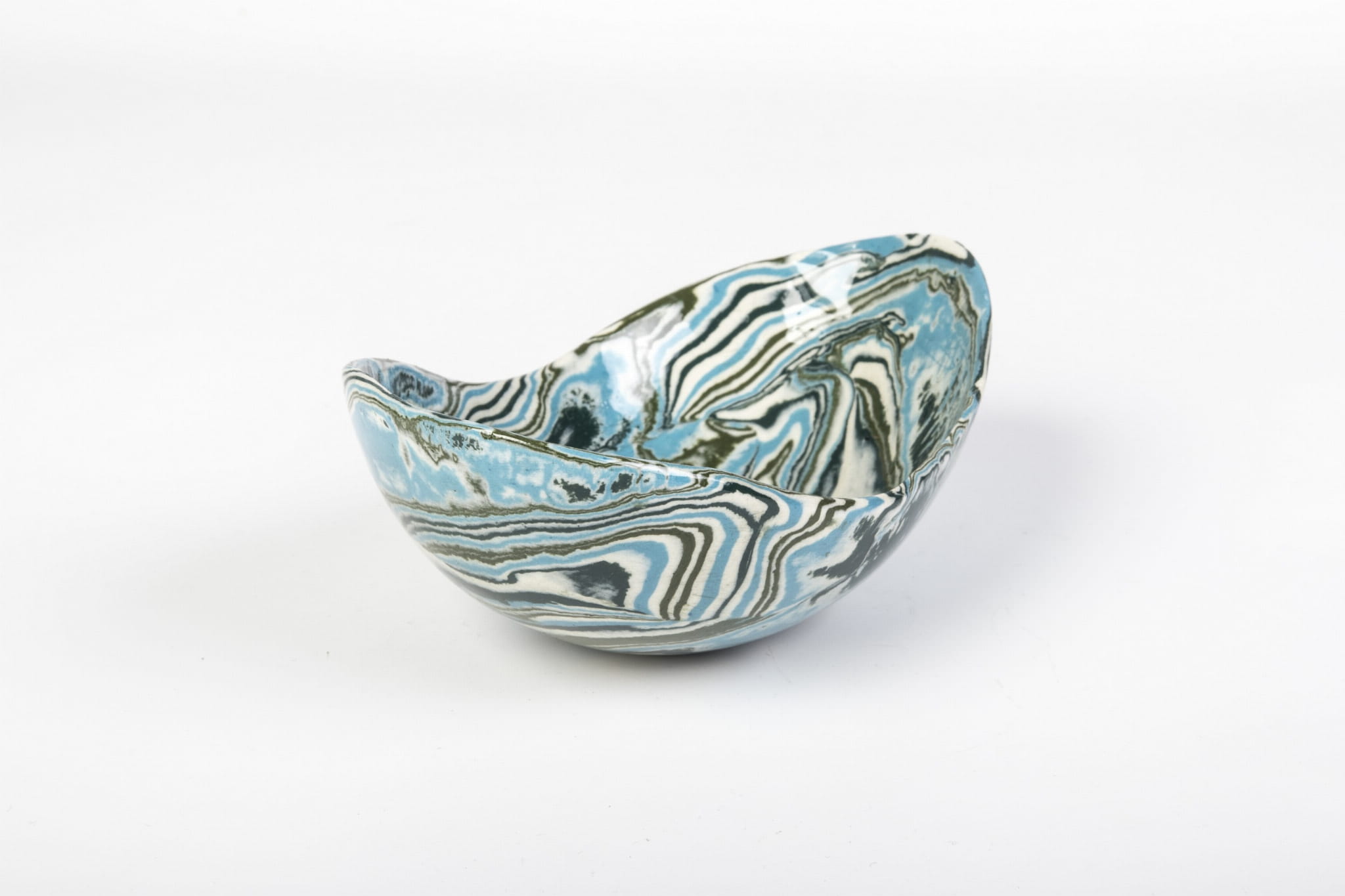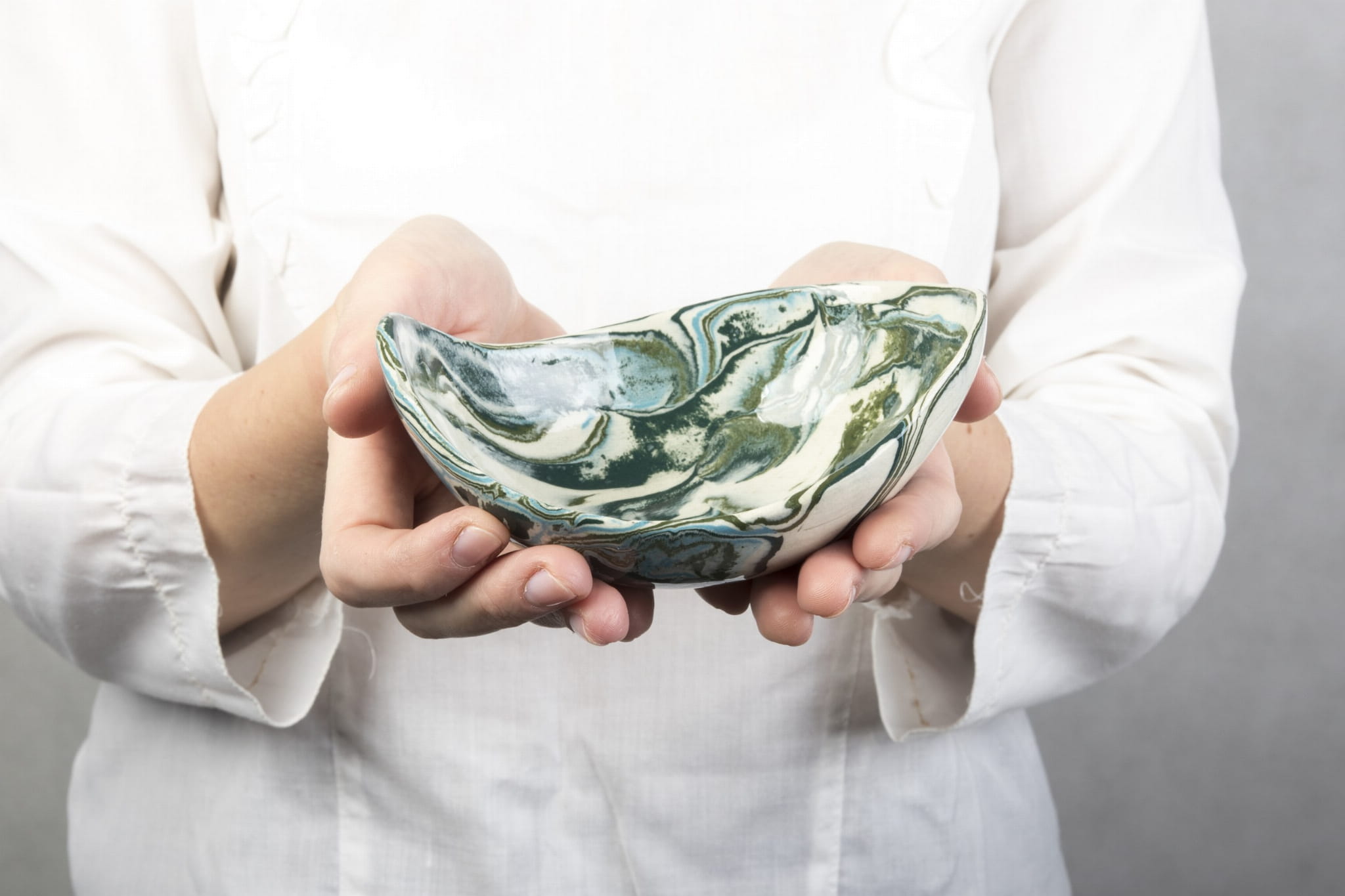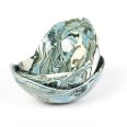 Miseczka handmade, wykonana w pracowni Skrawki Natury na południu Polski. Miseczka wykonana techniką ceramiki agatowej (ceramika marmurkowa, Nerikomi, Neriage). Jest to bardzo czasochłonna technika, w której ceramik rozpoczyna pracę od barwienia gliny wybranymi pigmentami, następnie ręcznie formuje naczynie. Kiedy ceramiczne naczynie wyschnie czas na szlifowanie, wypalanie w piecu, pokrywanie przezroczystym szkliwem i ponowne wypalanie. Cały proces produkcji zajmuje około 3 tygodni.