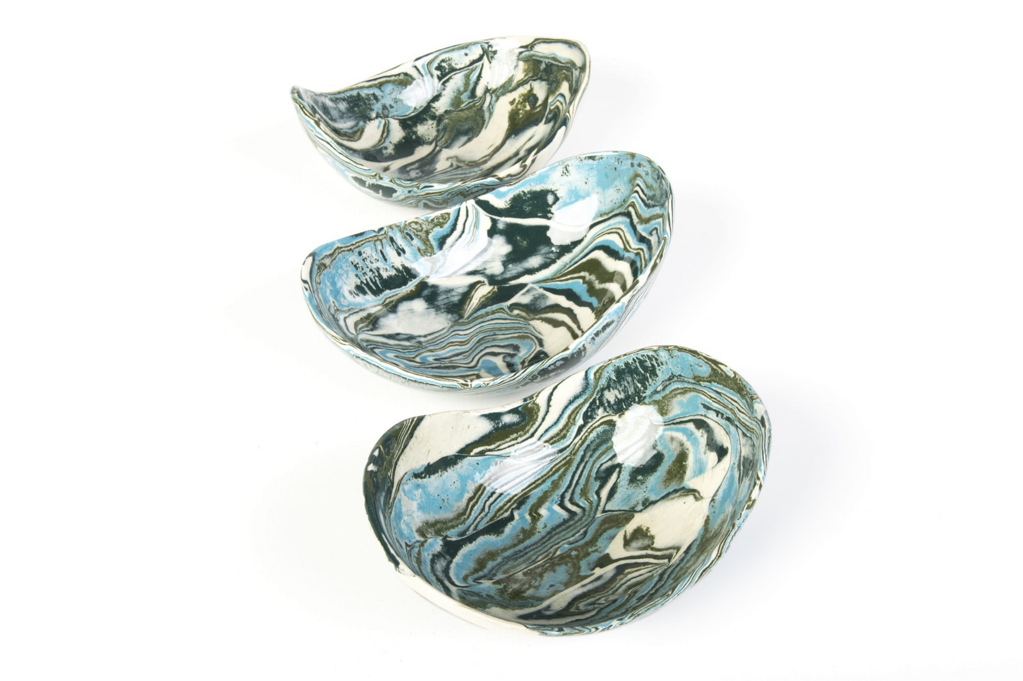 Wyrób rękodzielniczy. Każdy produkt jest nieco inny (różnice widoczne są w układzie agatowych pasów, kształcie krawędzi, kształcie naczynia).