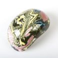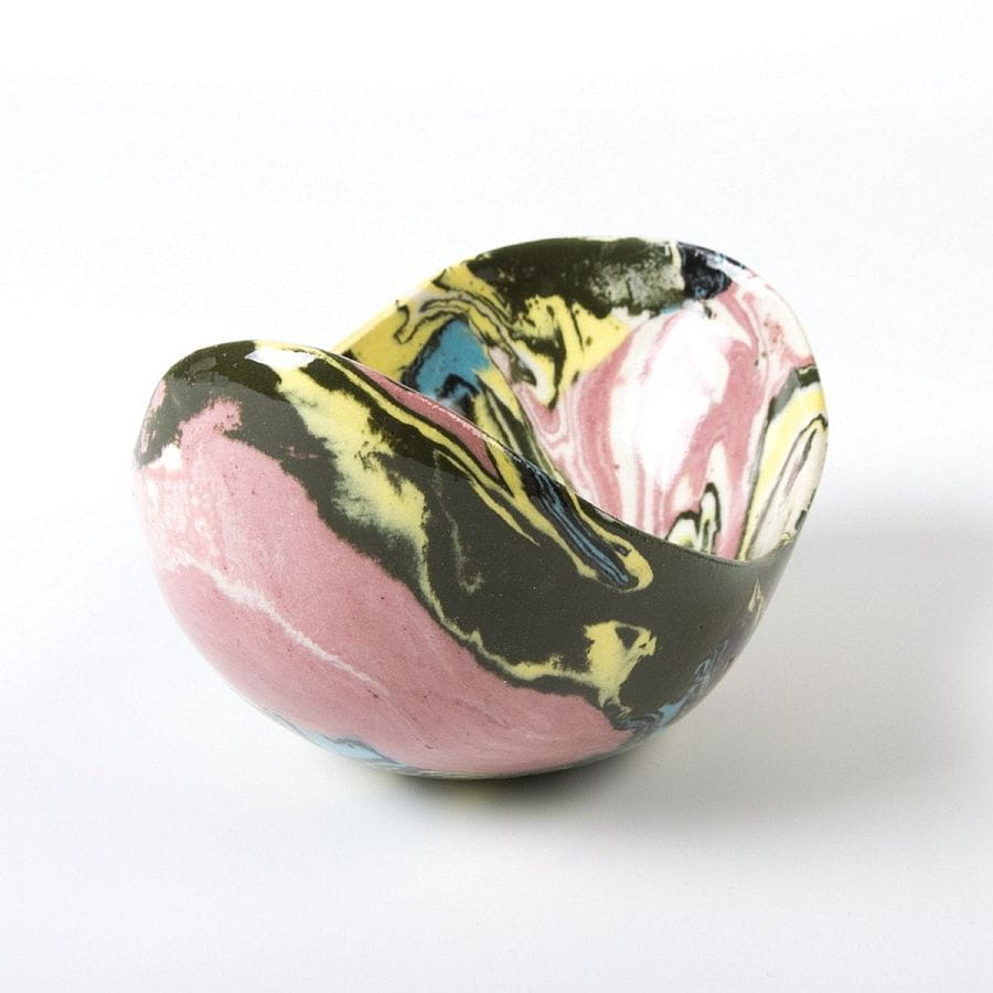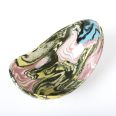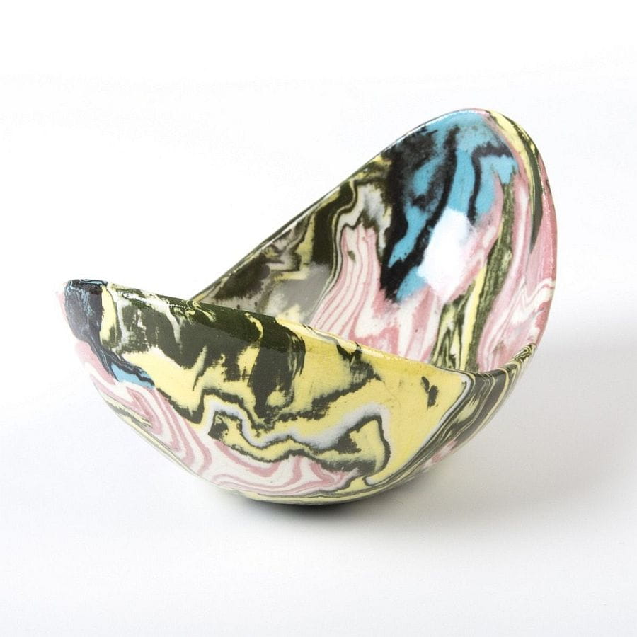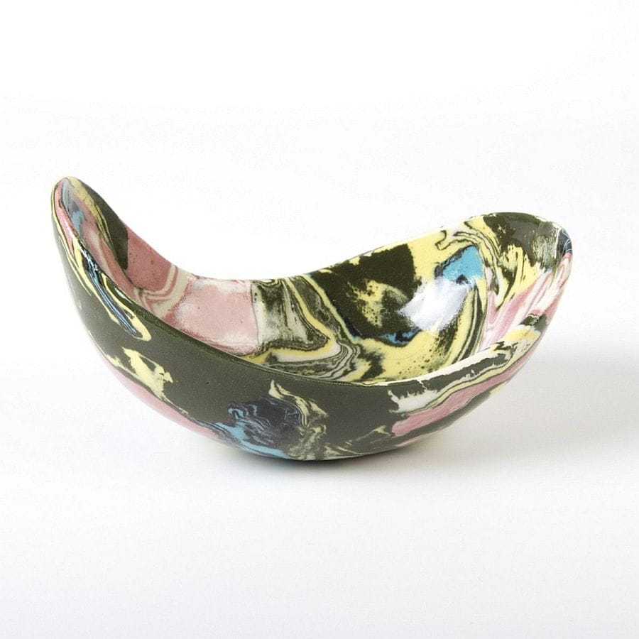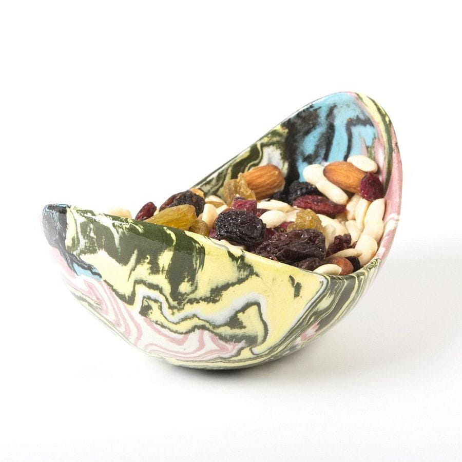 Ceramiczna, podłużna i wąska miseczka na przekąski lub drobiazgi wykonana techniką ceramiki agatowej (inne nazwy techniki: ceramika marmurkowa, neriage, nerikomi). Technika ta poleca na łączeniu uprzednio zabarwionej pigmentami gliny w kompozycję, z której przekrój formowany jest przez ceramika ręcznie na kształt wybranego naczynia. Miseczka uformowana została ręcznie, widać to zwłaszcza w nieregularnej krawędzi naczynia. Produktu unikalny - dostępna tylko jedna sztuka, niemożliwy do powtórzenia z uwagi na nieregularność kształtu i układu agatowego wzoru.