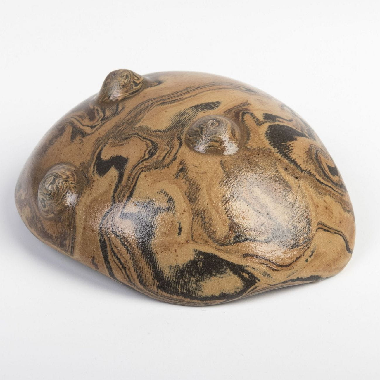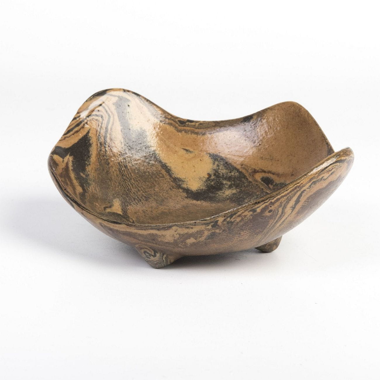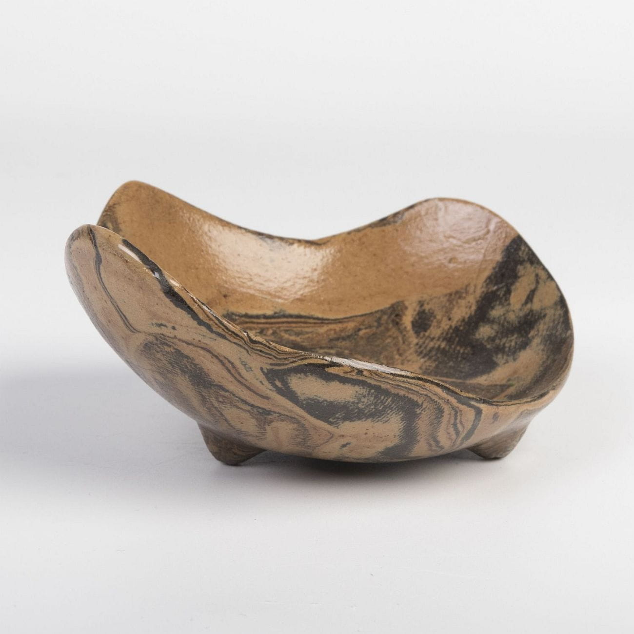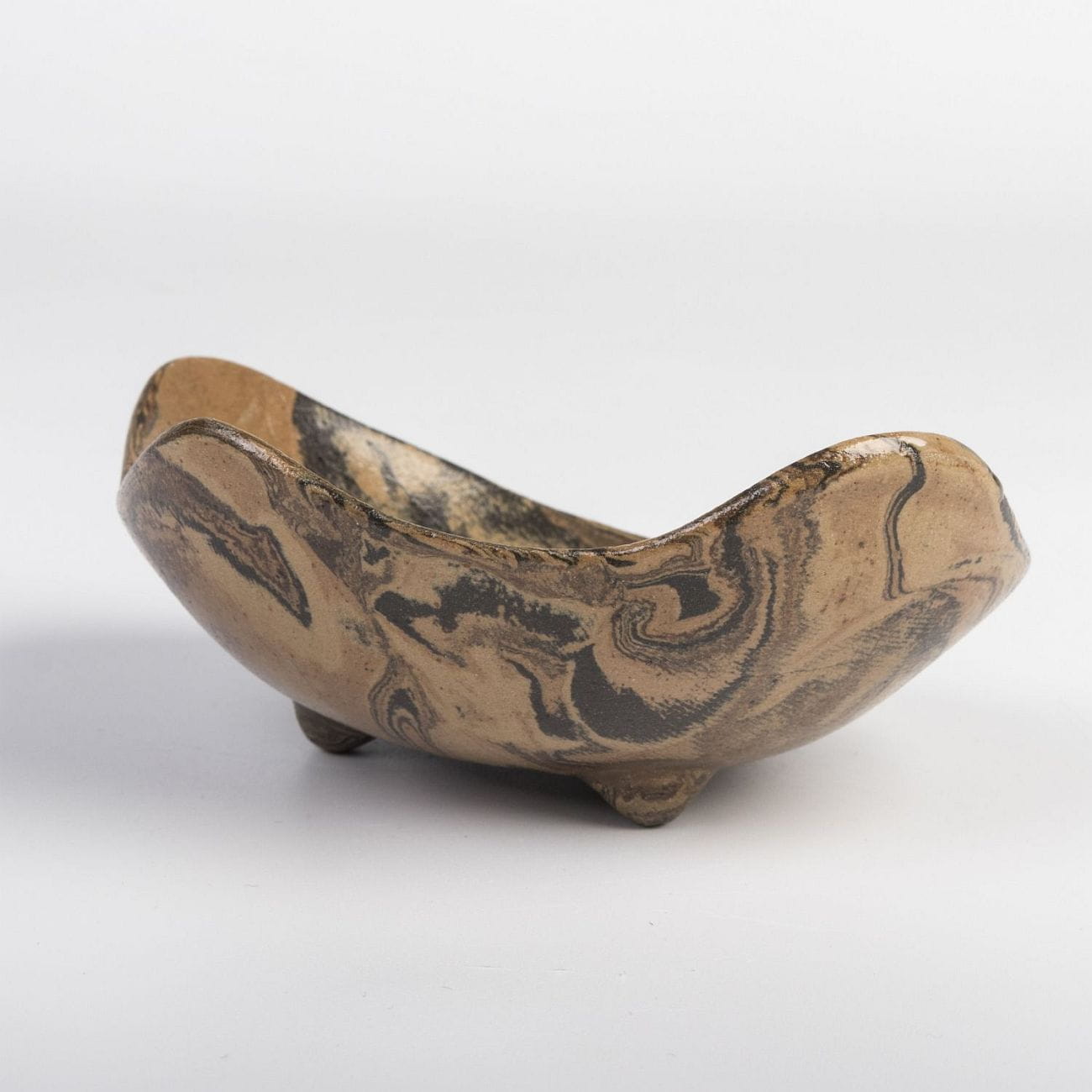 Ceramiczna podstawka na nóżkach wykonana techniką ceramiki agatowej, imitująca drewno.