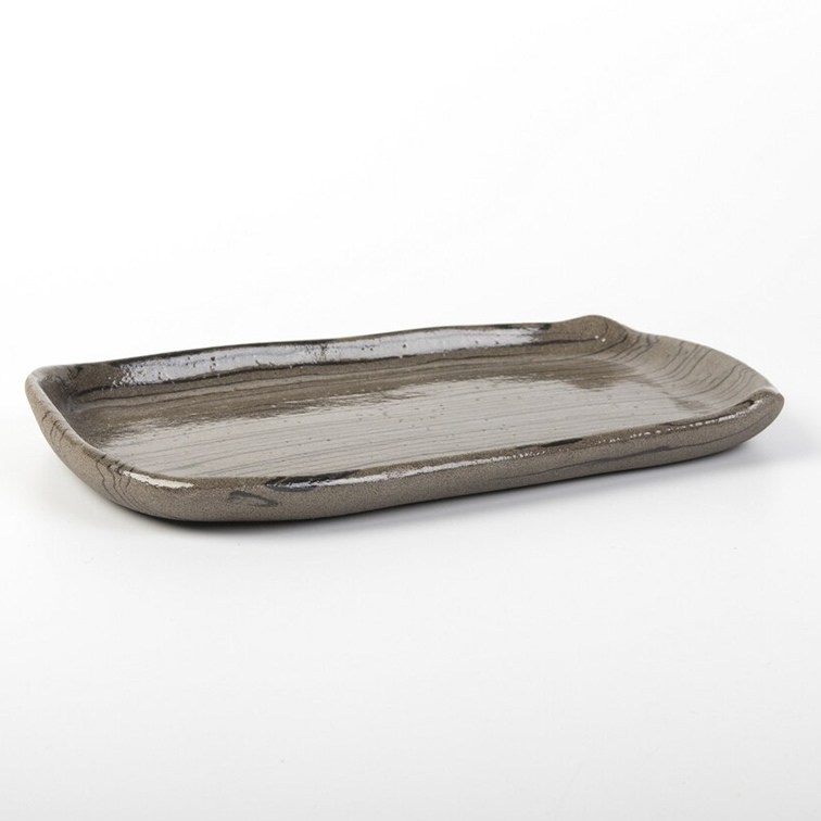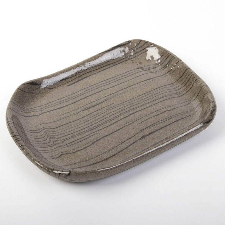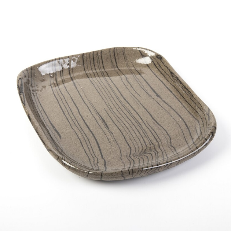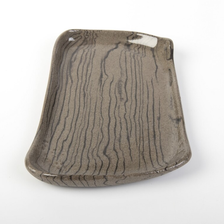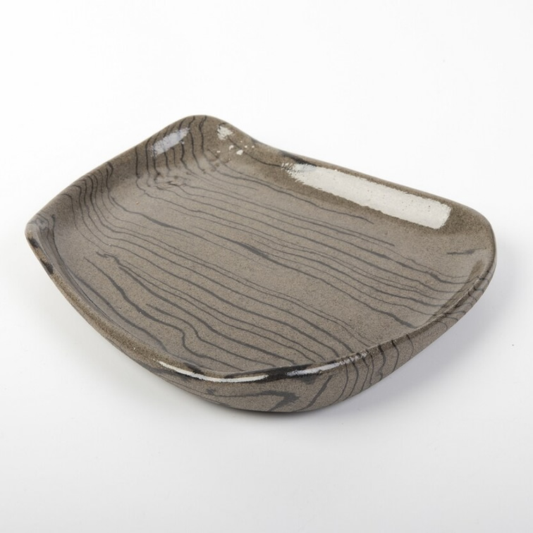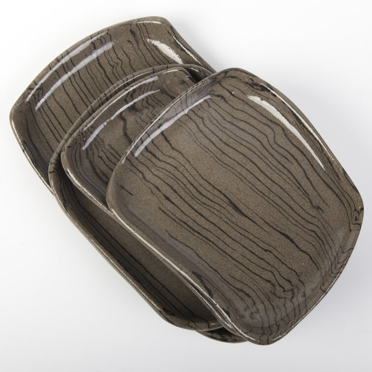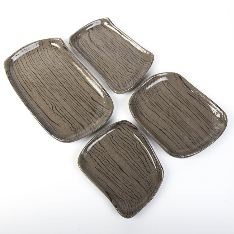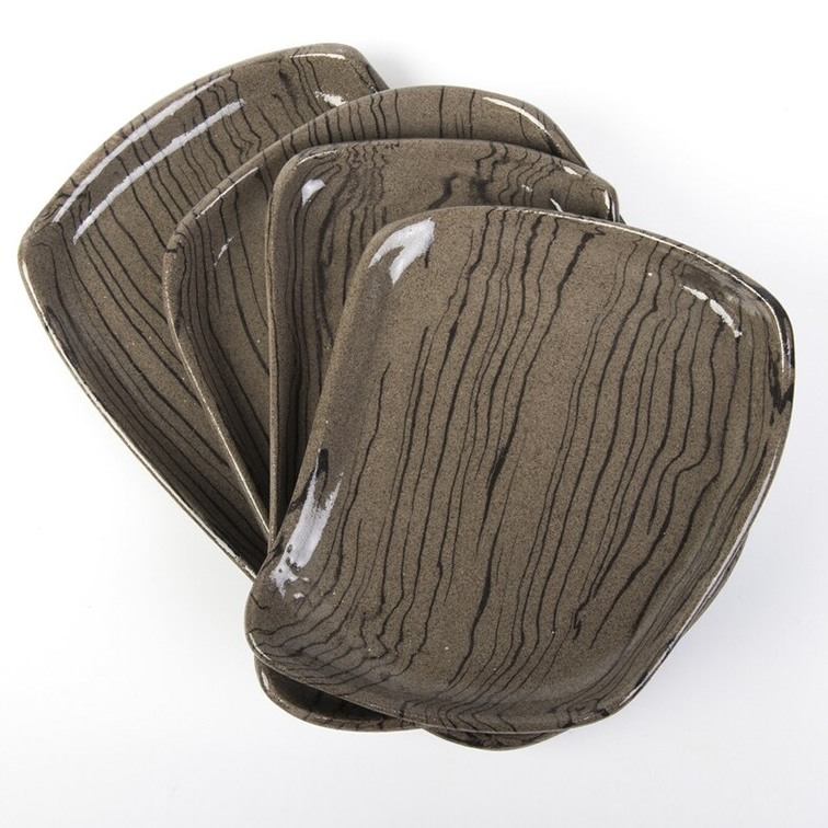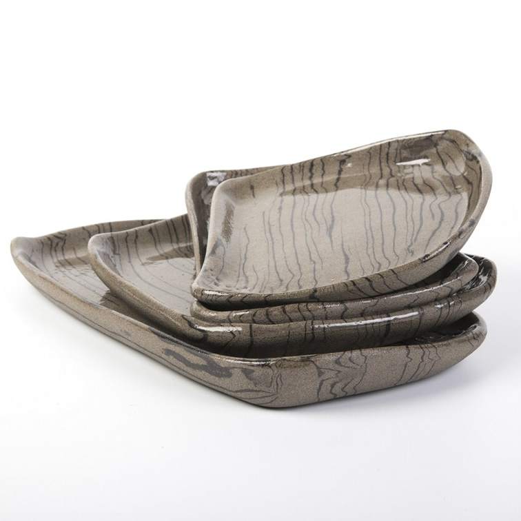 Komplet czterech talerzy o unikalnym kształcie. Talerze różnią się od siebie wielkością i kształtem. Wykonane techniką nerikomi - zostały odpowiednio zmieszane 2 kolory glin: brązowa i czarna. W ten sposób uzyskaliśmy niepowtarzalny wzór cienkich czarnych pasków na brązowym tle.