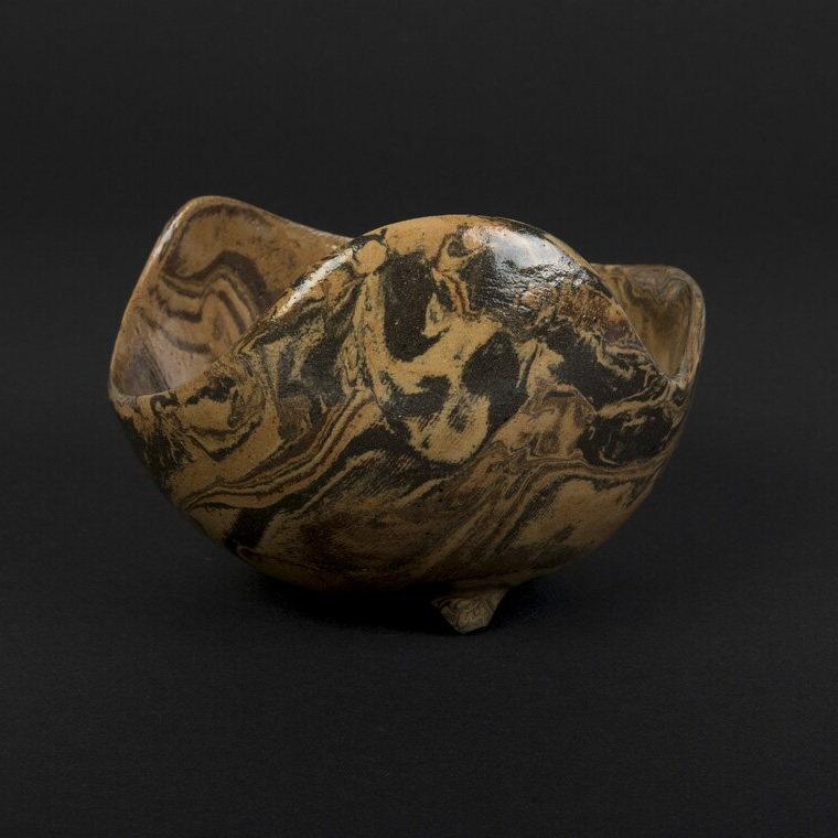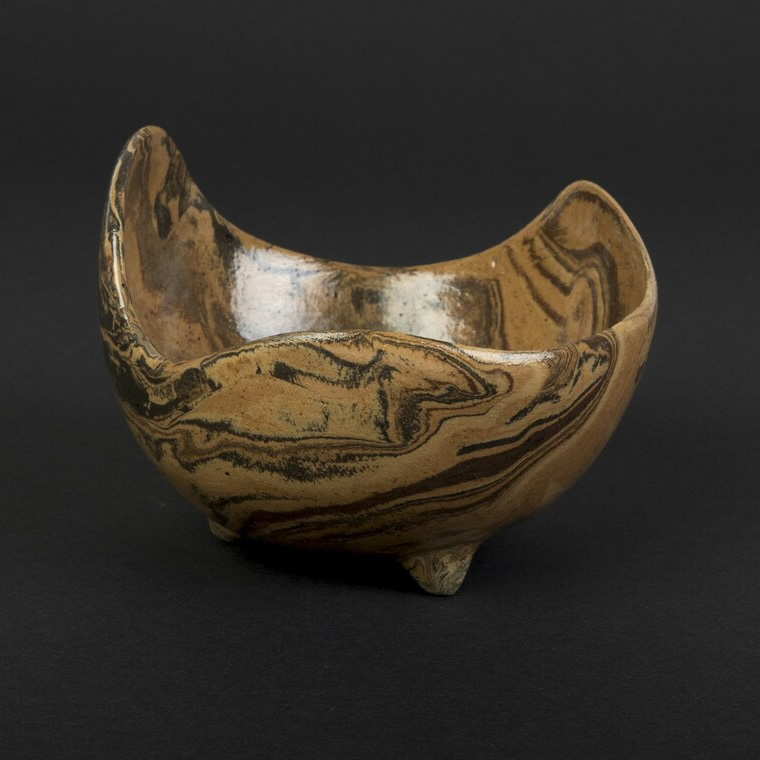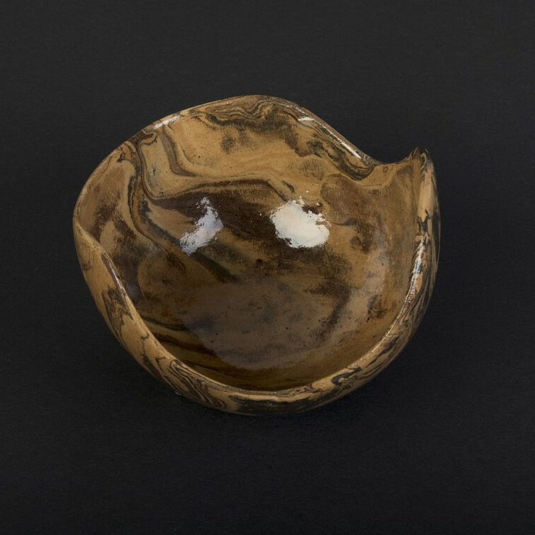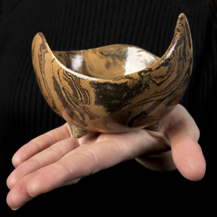 Ceramiczna miseczka na trzech nóżkach, wykonana techniką agatową (marmurkową, Nerikomi). Dzięki odpowiedniemu połączeniu kolorowych glin - uzyskaliśmy drewnopodobny wzór.