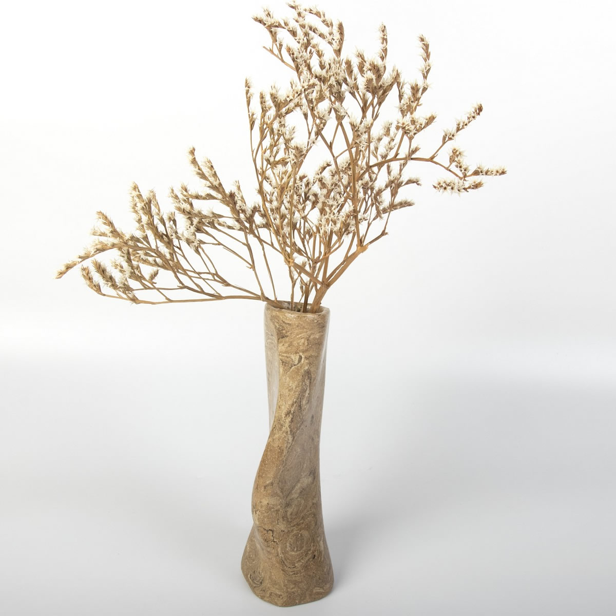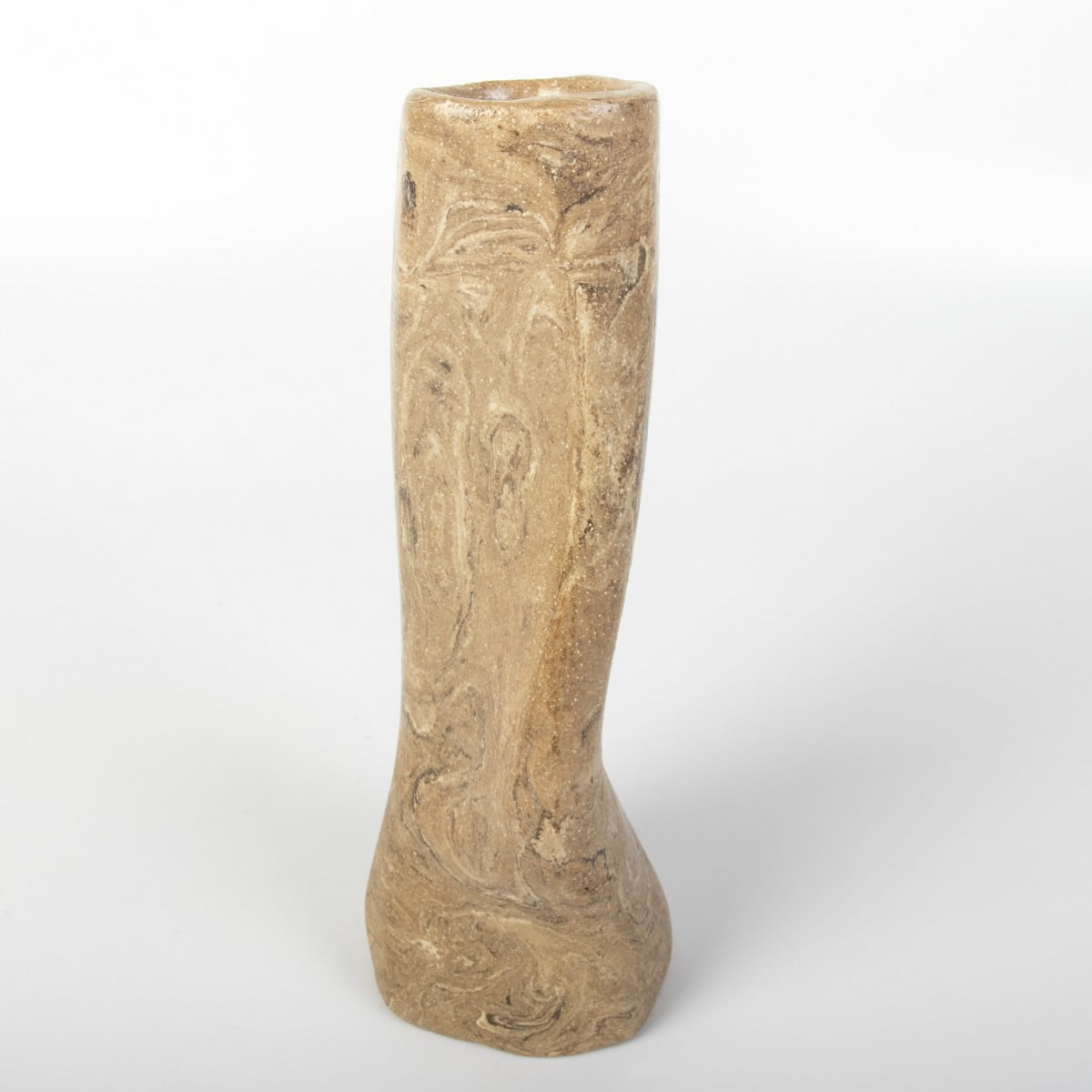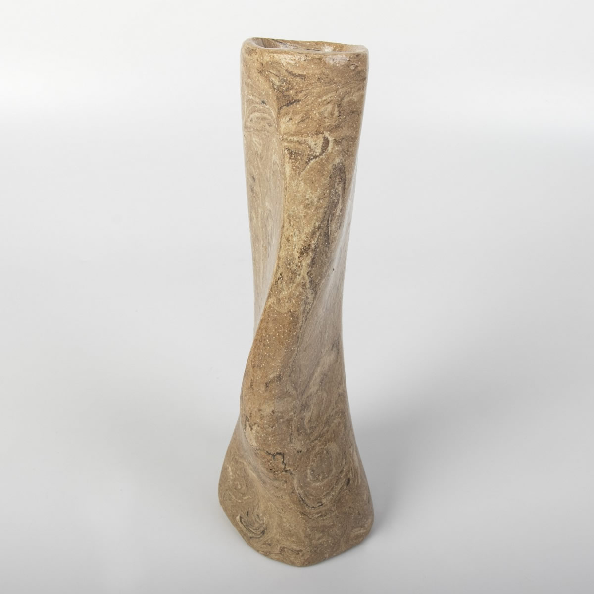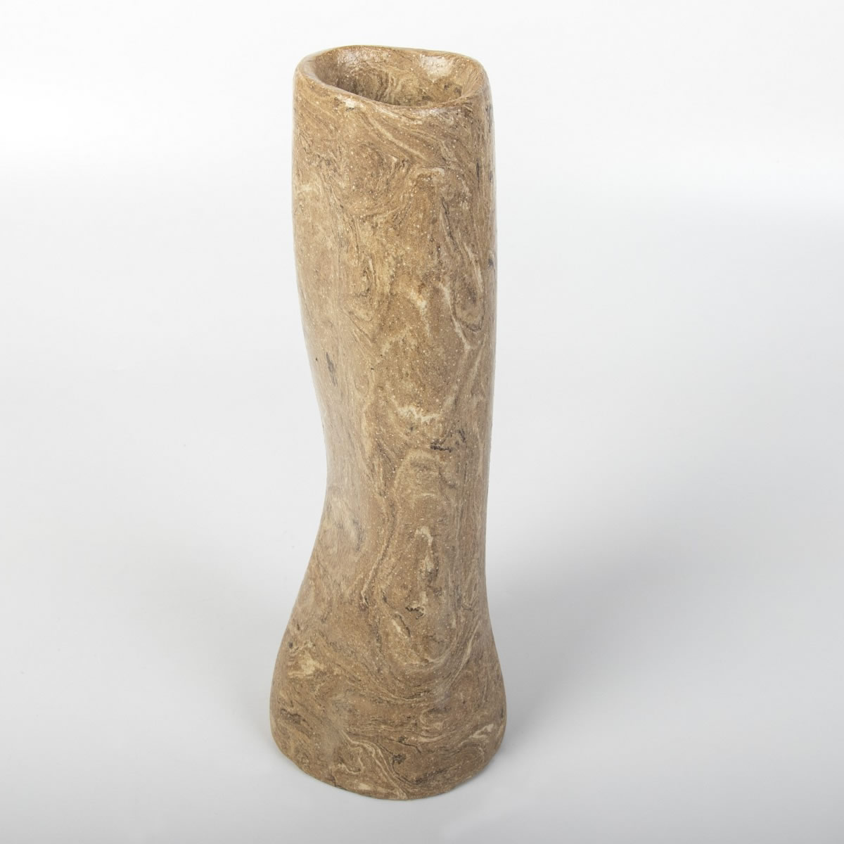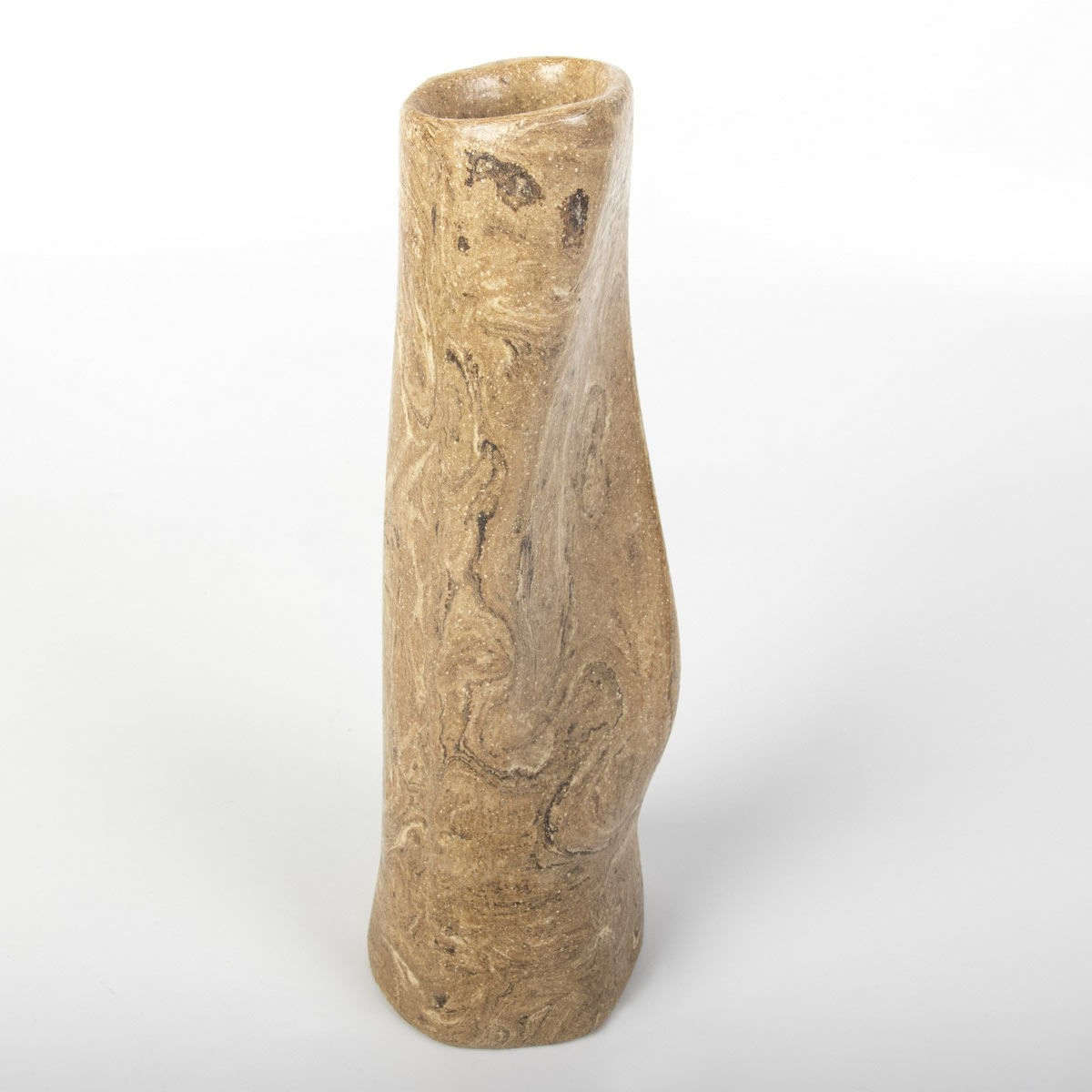 Ręcznie wykonany wazon ceramiczny o niepowtarzalnym kształcie. Dzięki wykorzystaniu zmieszanych kolorowych glin - uzyskaliśmy ciekawy drewnopodobny wzór. Całość została pokryta błyszczącym szkliwem transparentnym.