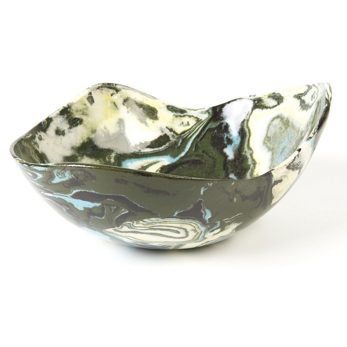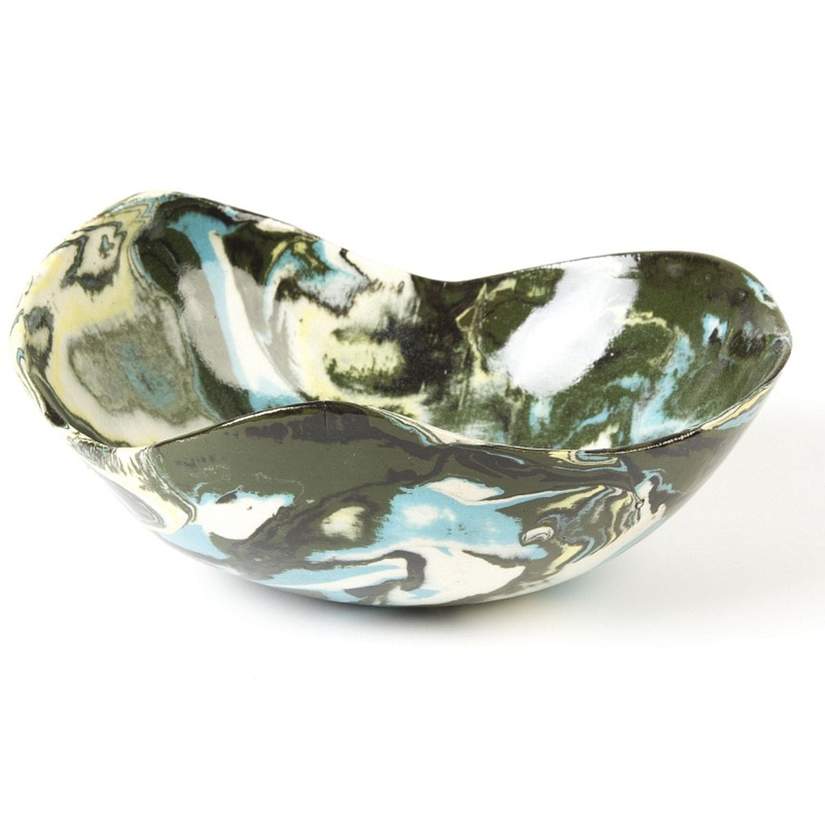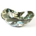 Ceramiczna misa o sercowatym kształcie wykonana techniką ceramiki agatowej, różnokolorowa, dużych rozmiarów, głęboka.