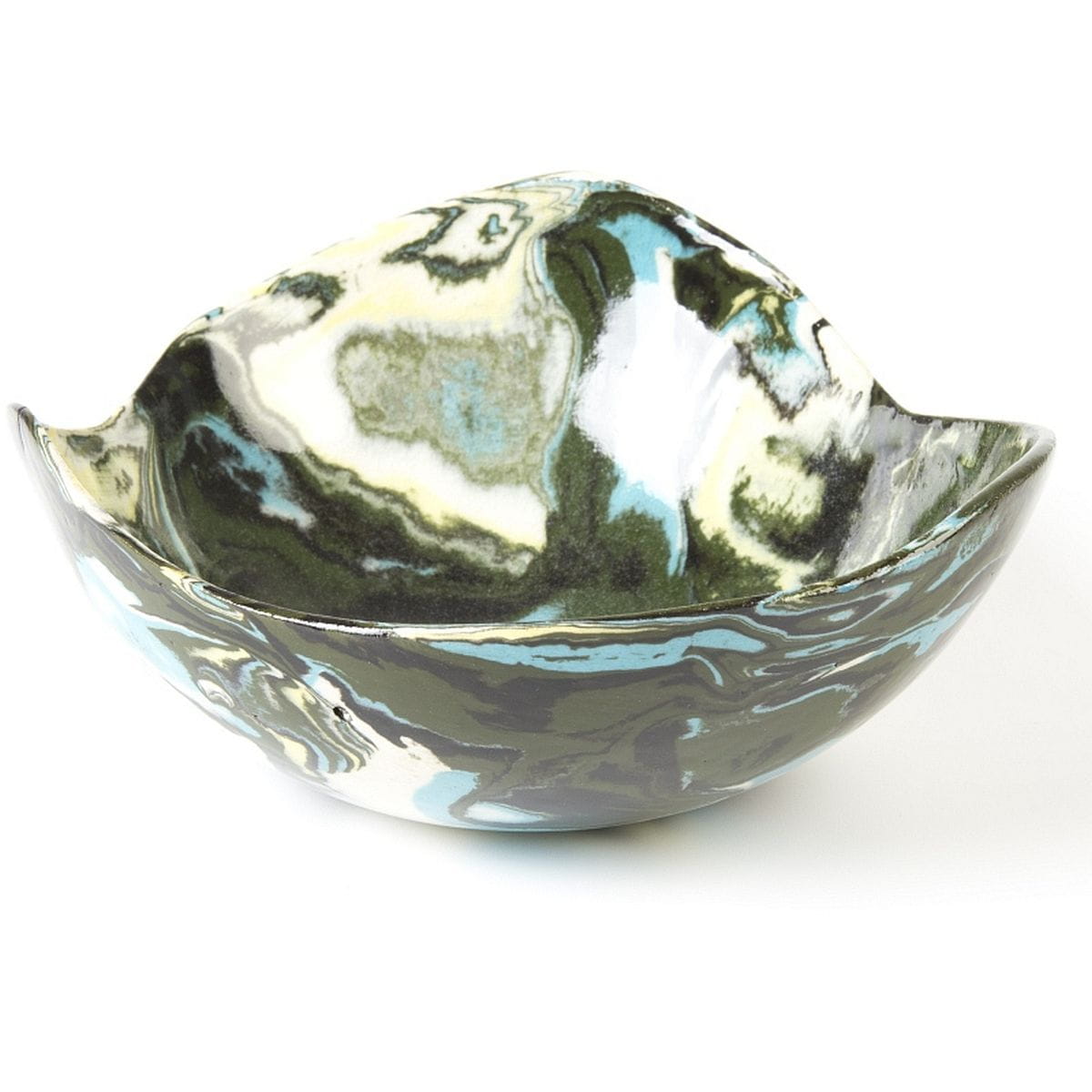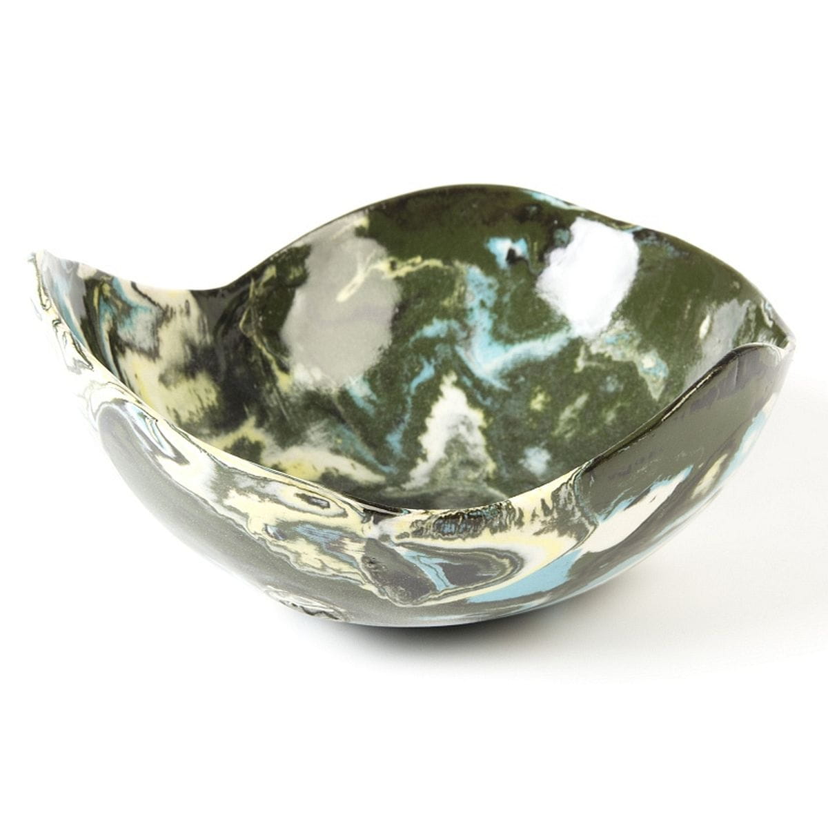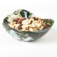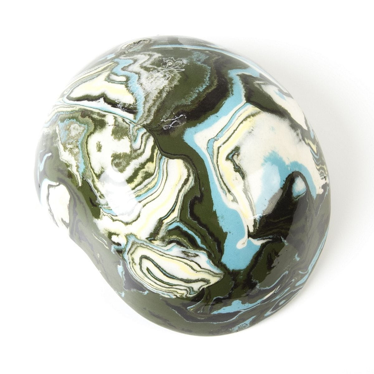 Produkt formowany ręcznie na balonie, posiada kulisty, z góry nieco sercowaty kształt, lekko spłaszczony od spodu, przez co stabilnie stoi na płaskiej powierzchni. Misa wykonana techniką ceramiki agatowej, wyglądem nawiązująca do wyglądu półszlachetnego kamienia. Kolory dobrane przez ceramika do tego produktu: ciemna zieleń, żółty, kremowy, niebieski. Unikat - dostępna tylko jedna sztuka, produkt z pogranicza ceramiki użytkowej i sztuki. Na sklepie można znaleźć wiele podobnych miseczek i podstawek idealnych do skompletowania z tym jednym, wyjątkowym egzemplarzem.