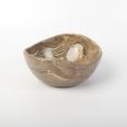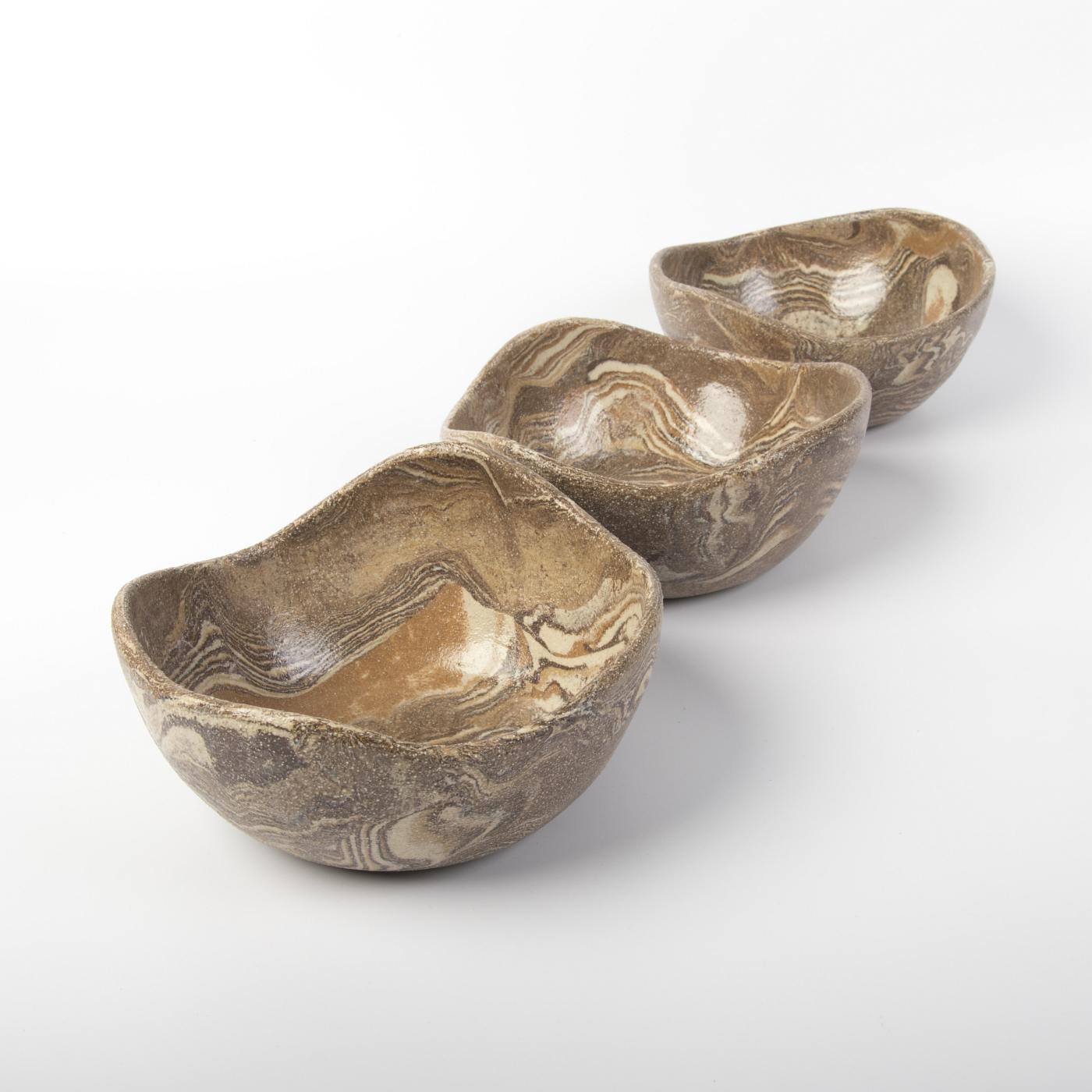 Zestaw 3 misek ceramicznych, inspirowanych pięknem natury. Każda z misek, o średnicy około 15 cm i wysokości 6 cm, została ręcznie wykonana techniką agatową. Połączenie różnych odcieni brązu tworzy na powierzchni każdej miski unikalny, marmurkowy wzór, przypominający naturalne skały. Dzięki zastosowaniu bezpiecznego szkliwa, miski są idealne do serwowania przekąsek, deserów czy sałatek.