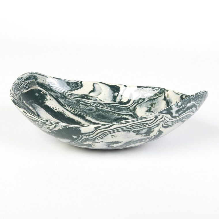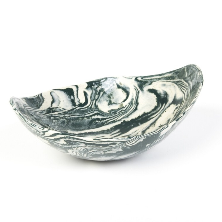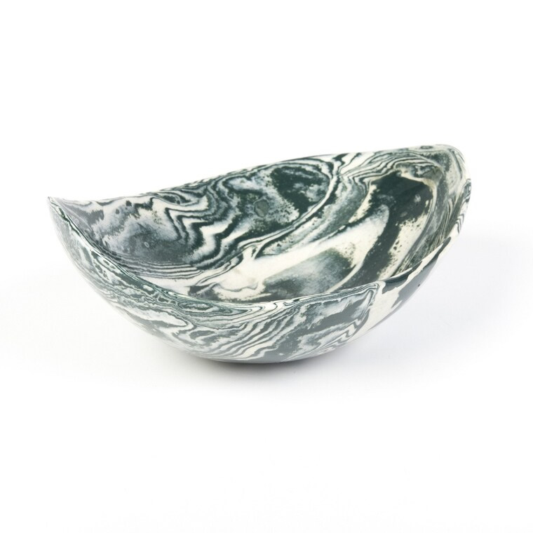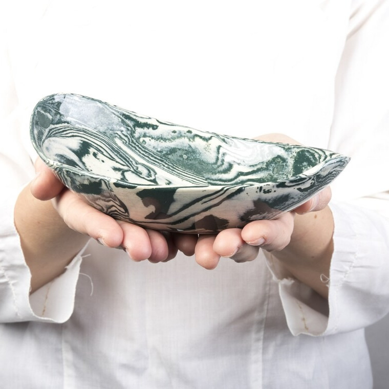 Ta marmurkowa miska ceramiczna została wykonana w rzadkiej technice agatowej (marmurkowej, nerikomi). Polega ona na odpowiednim mieszaniu kolorowych glin. Dzięki połączeniu morskiej zieleni i kremowej bieli - uzyskany został niepowtarzalny marmurkowy wzór.
