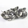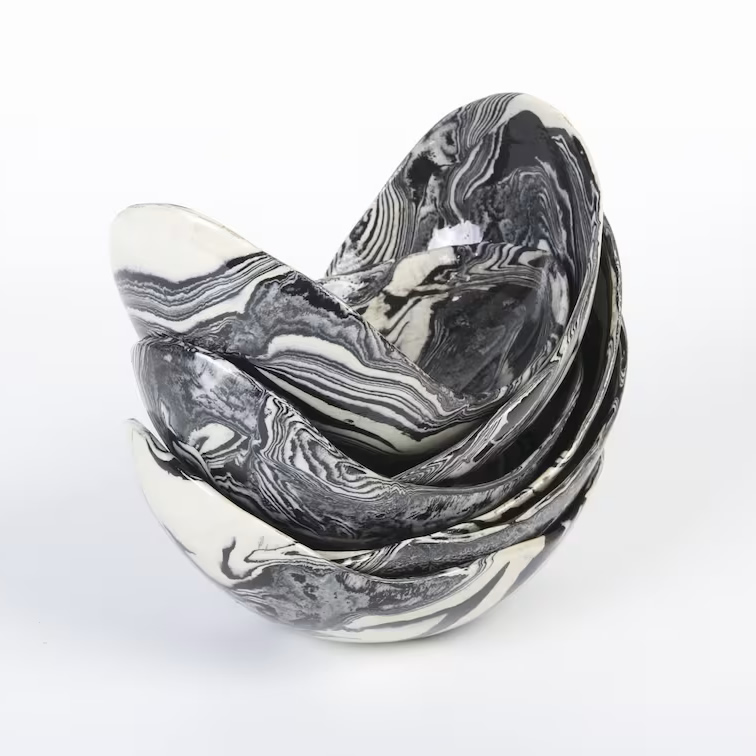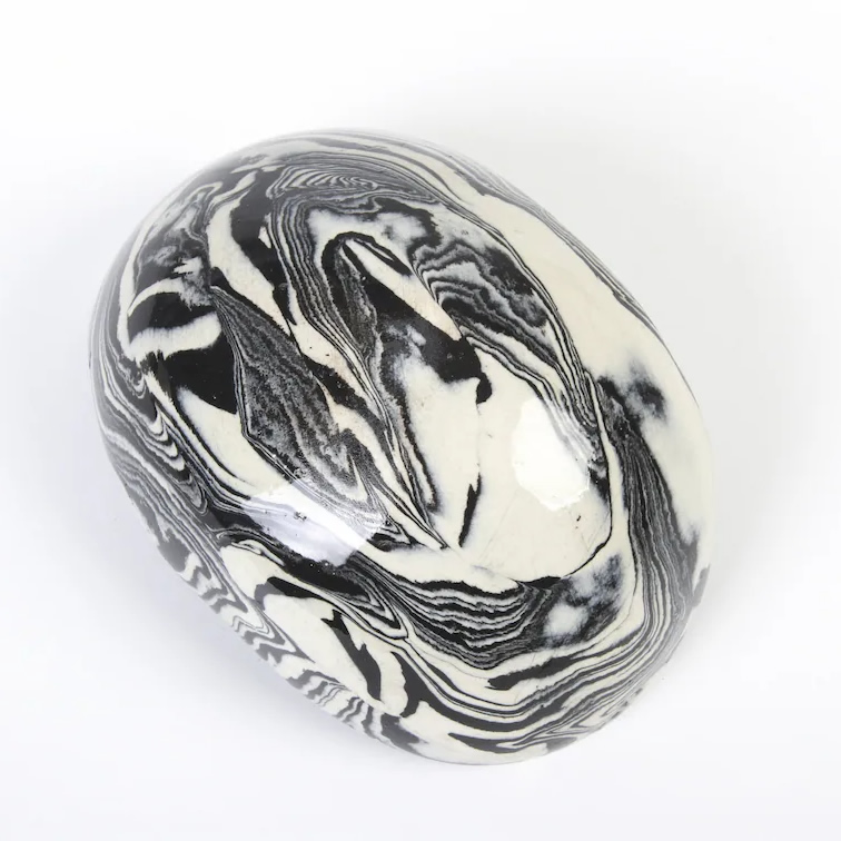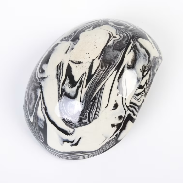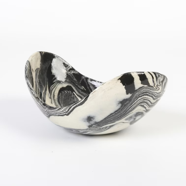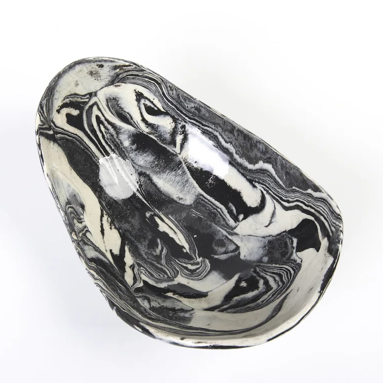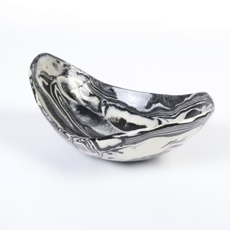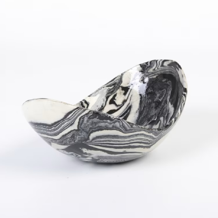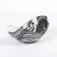 Marmurkowa miska ceramiczna wykonana poprzez zmieszanie dwóch kontrastowych kolorów glin - białej i czarnej. Miska została uformowana ręcznie - dlatego też ma tak unikatowy kształt. Została pokryta z obu stron przeźroczystym i błyszczącym szkliwem. Szkliwo to może mieć kontakt z żywnością, dlatego też możemy w tej misce serwować różnego rodzaju przekąski. Miska może też służyć jako pojemnik do przechowywaniu różnych skarbów, biżuterii.