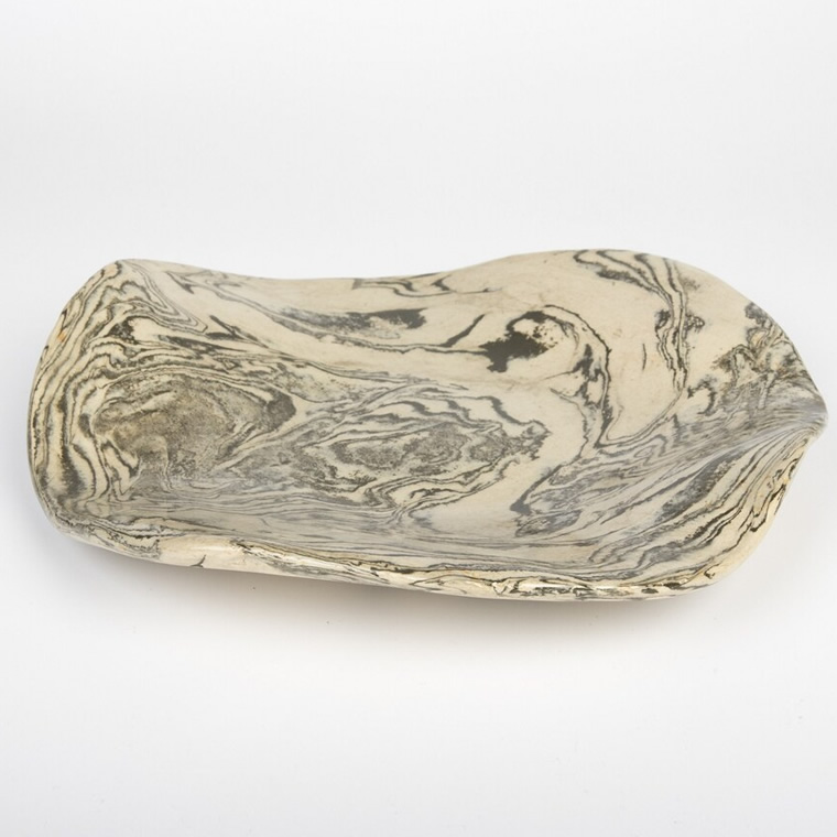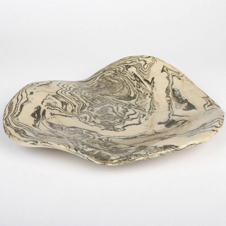 Patera została wykonana techniką agatową - zabarwiona na czarno glina została odpowiednio połączona z kremową - uzyskując efekt unikatowego marmurku. Gładka powierzchnia została pokryta przeźroczystym szkliwem, dopuszczonym do kontaktu z żywnością.