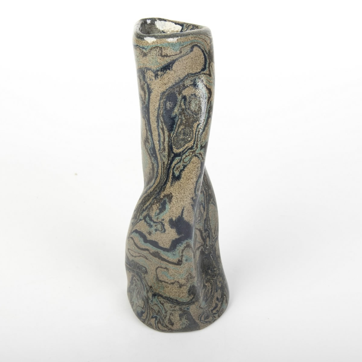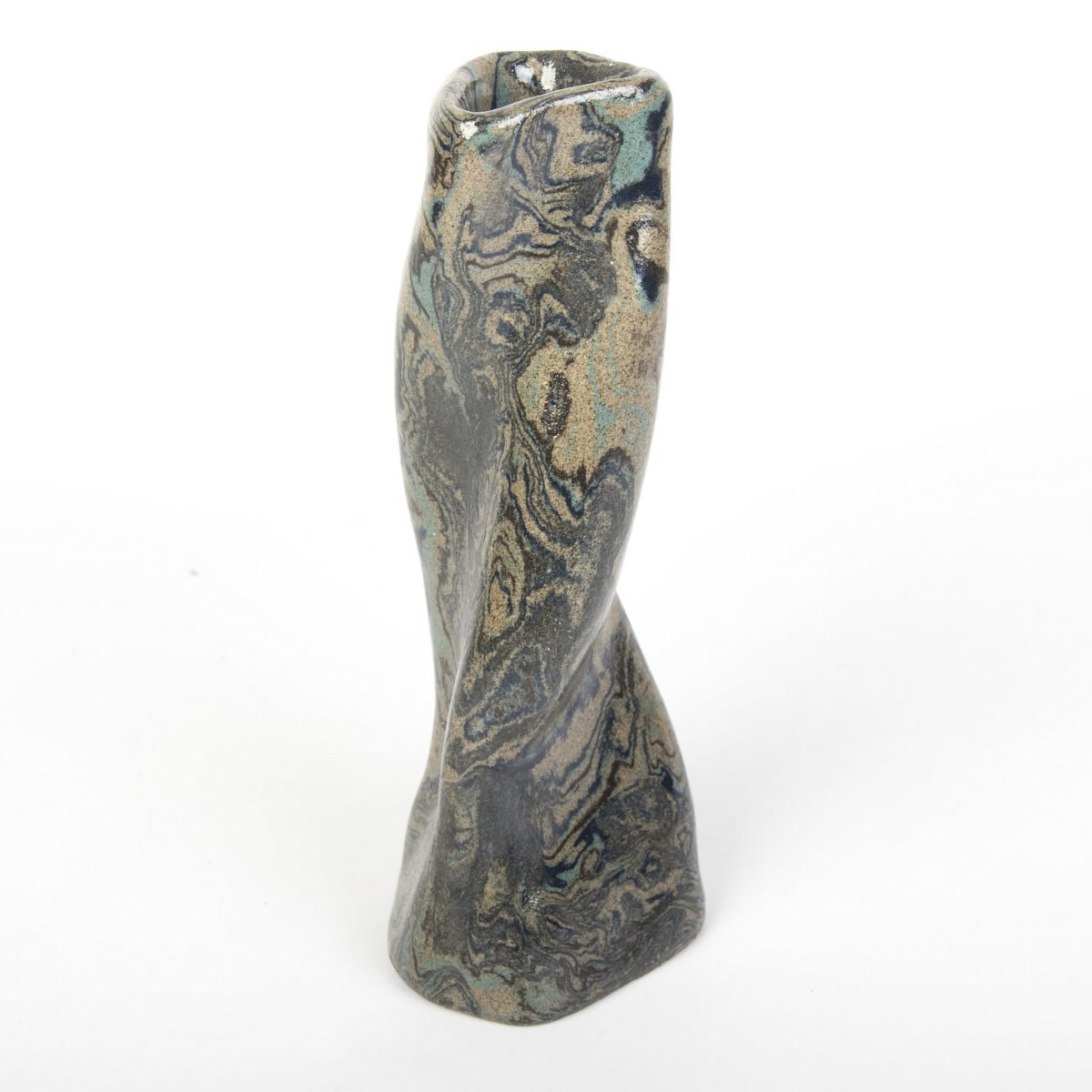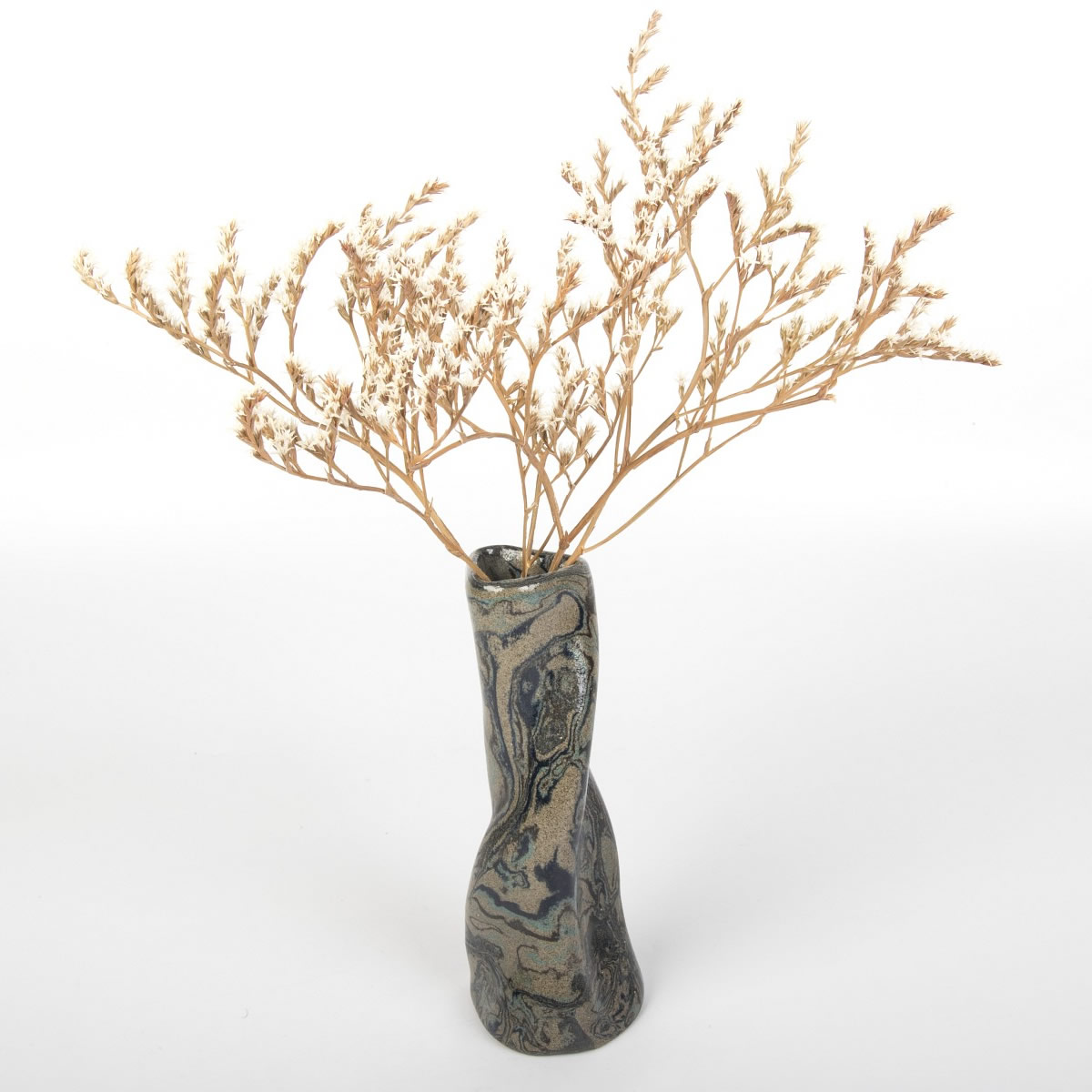 Wazon o nietypowej formie, wykonany ręcznie przy wykorzystaniu techniki agatowej (marmurkowej, Nerikomi), powstał dzięki starannemu połączeniu kolorowych glin, tworząc wyjątkowy wzór marmurkowy. Zarówno zewnętrzna, jak i wewnętrzna część wazonu zostały pokryte błyszczącym, przezroczystym szkliwem.
