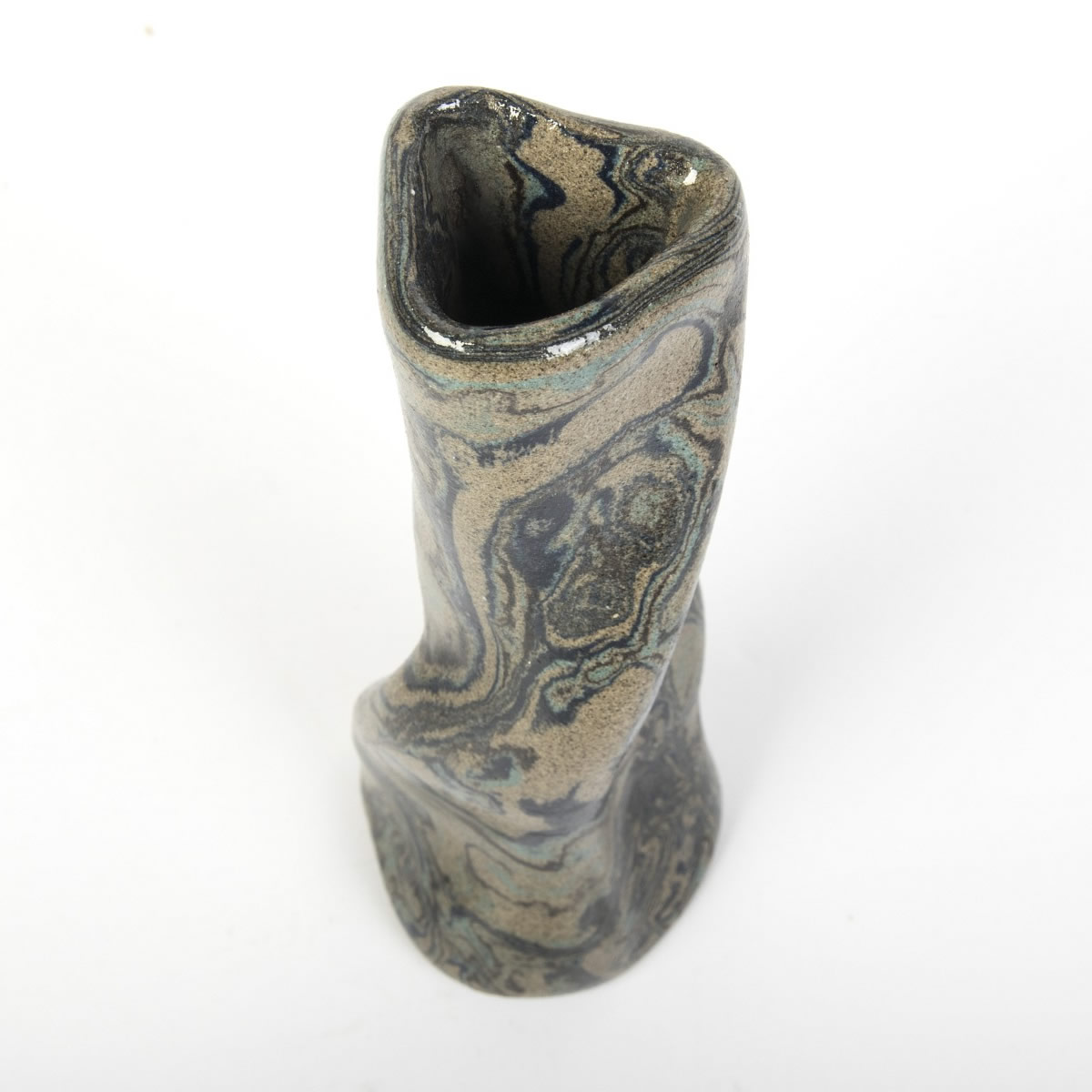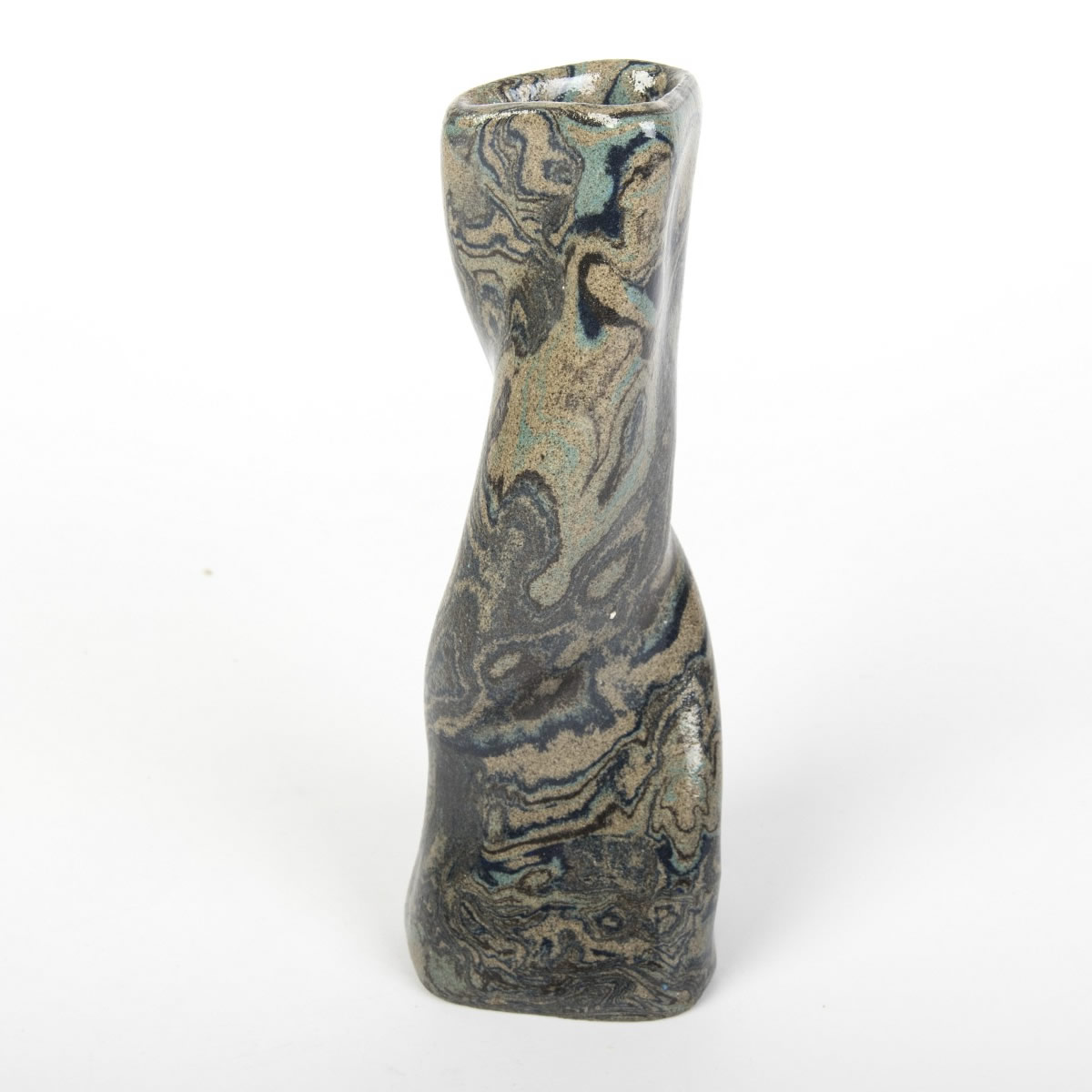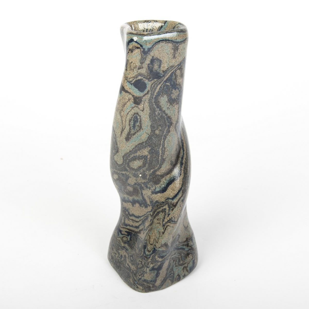 Wazon o nietypowej formie, wykonany ręcznie przy wykorzystaniu techniki agatowej (marmurkowej, Nerikomi), powstał dzięki starannemu połączeniu kolorowych glin, tworząc wyjątkowy wzór marmurkowy. Zarówno zewnętrzna, jak i wewnętrzna część wazonu zostały pokryte błyszczącym, przezroczystym szkliwem.