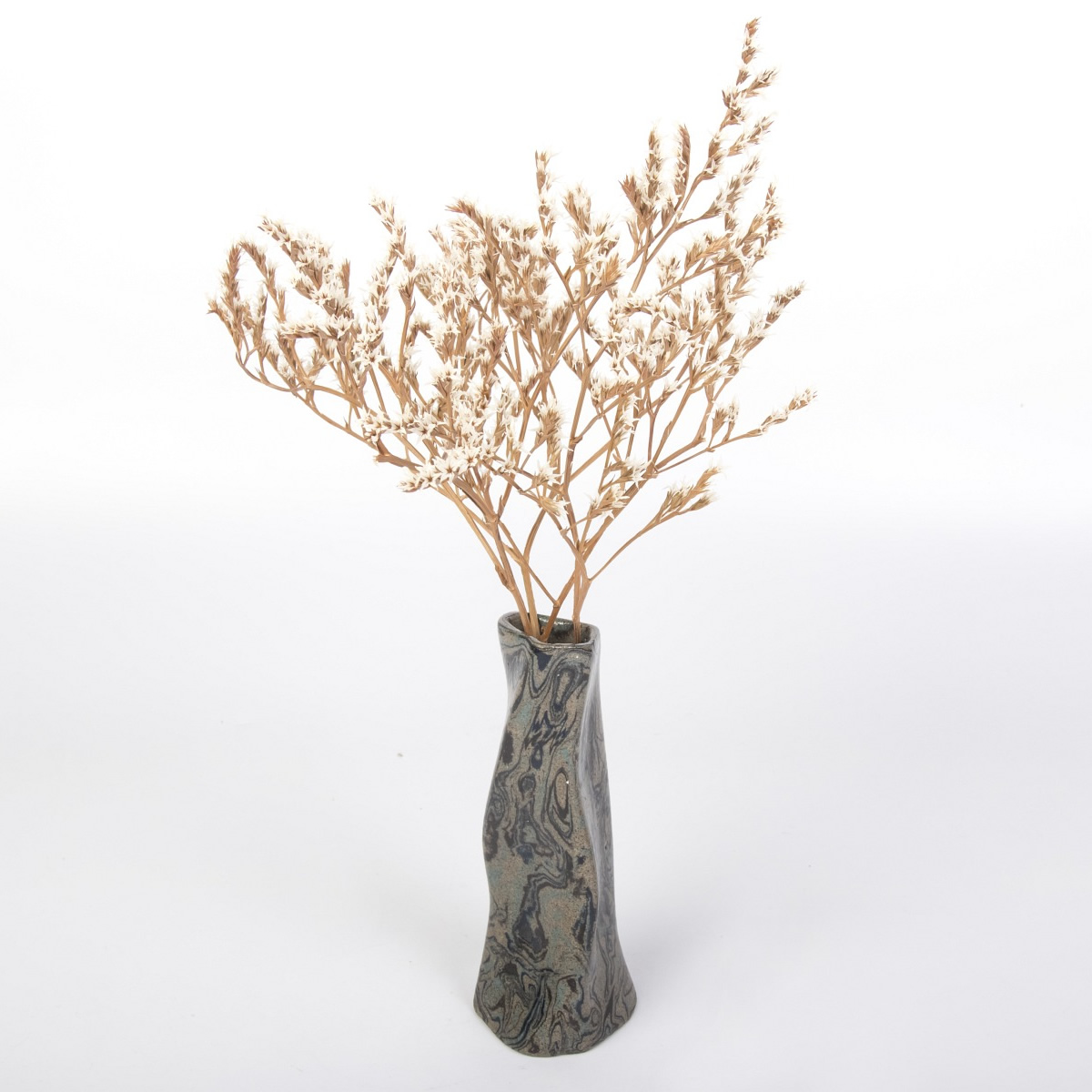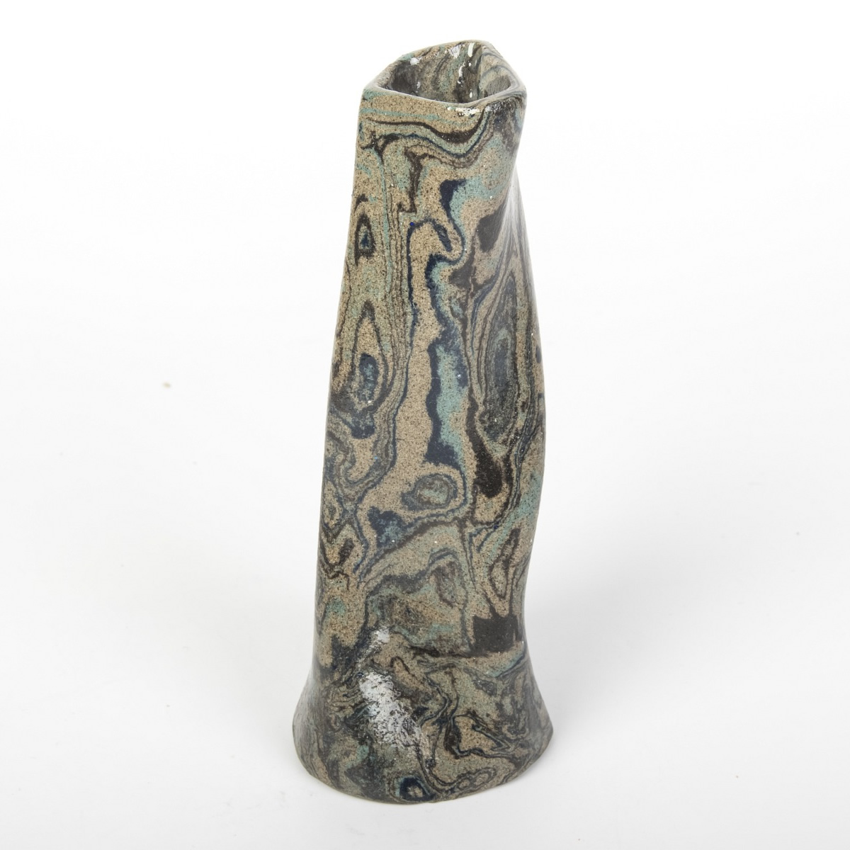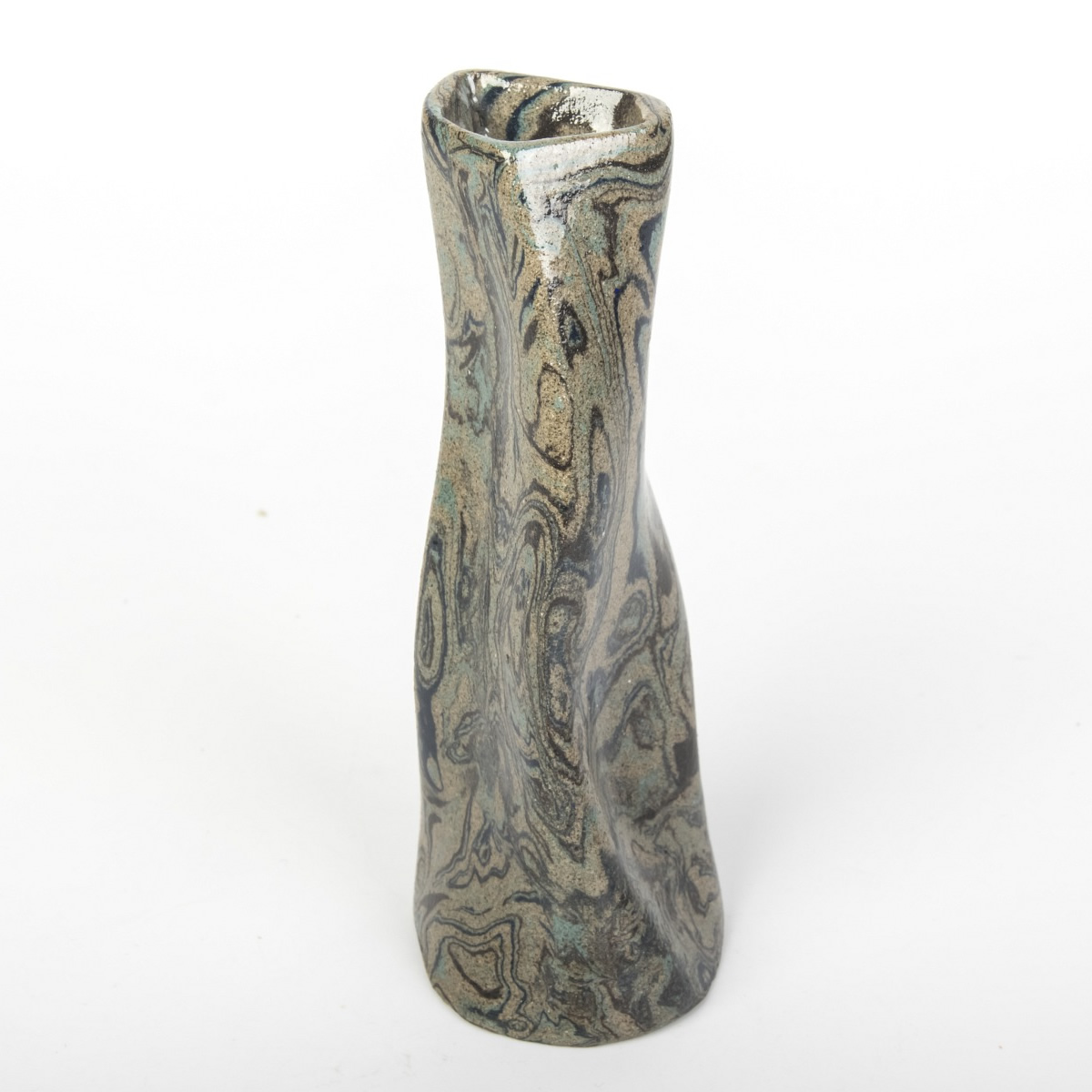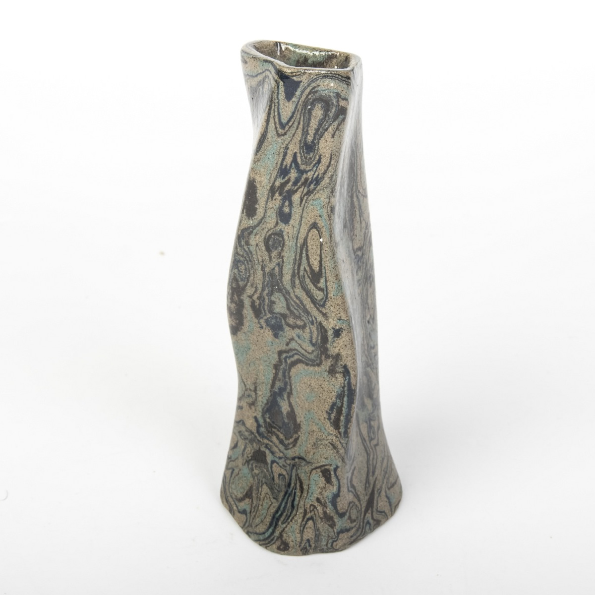 Wazon o nietypowej formie, powstały w procesie ręcznego kształtowania z zastosowaniem techniki agatowej (marmurkowej, Nerikomi), emanuje z umiejętnego zestawienia kolorowych glin, kreując wyjątkowy wzór marmurkowy. Zarówno zewnętrzna, jak i wewnętrzna część wazonu zostały oblane błyszczącym, przezroczystym szkliwem.
