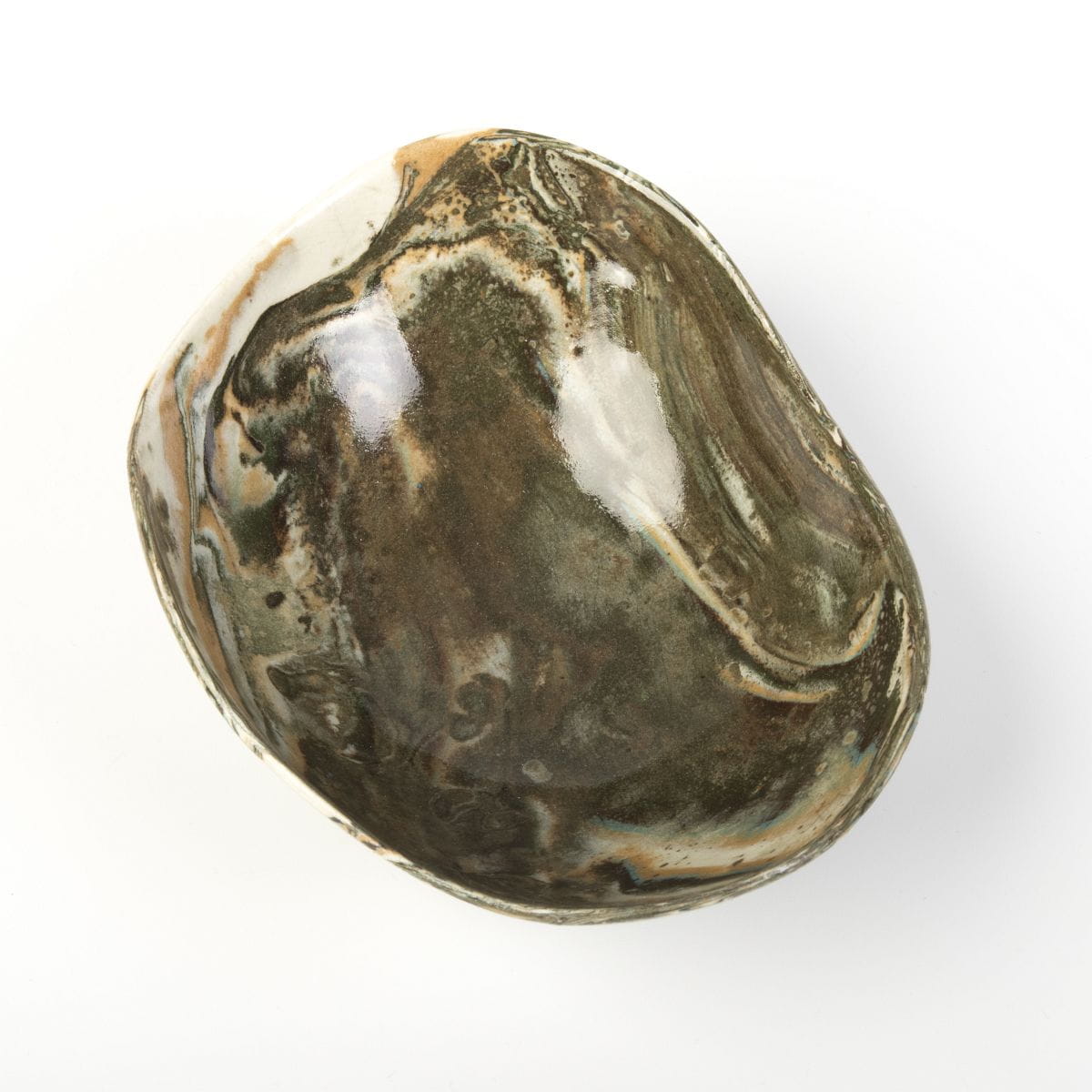 To naczynie zostało wykonane w kolorach: brązowy, ciemnozielony, ochra, kremowy. Przybliżone wymiary: wysokość 5 cm, szerokość 14 cm. Waga 120 g.