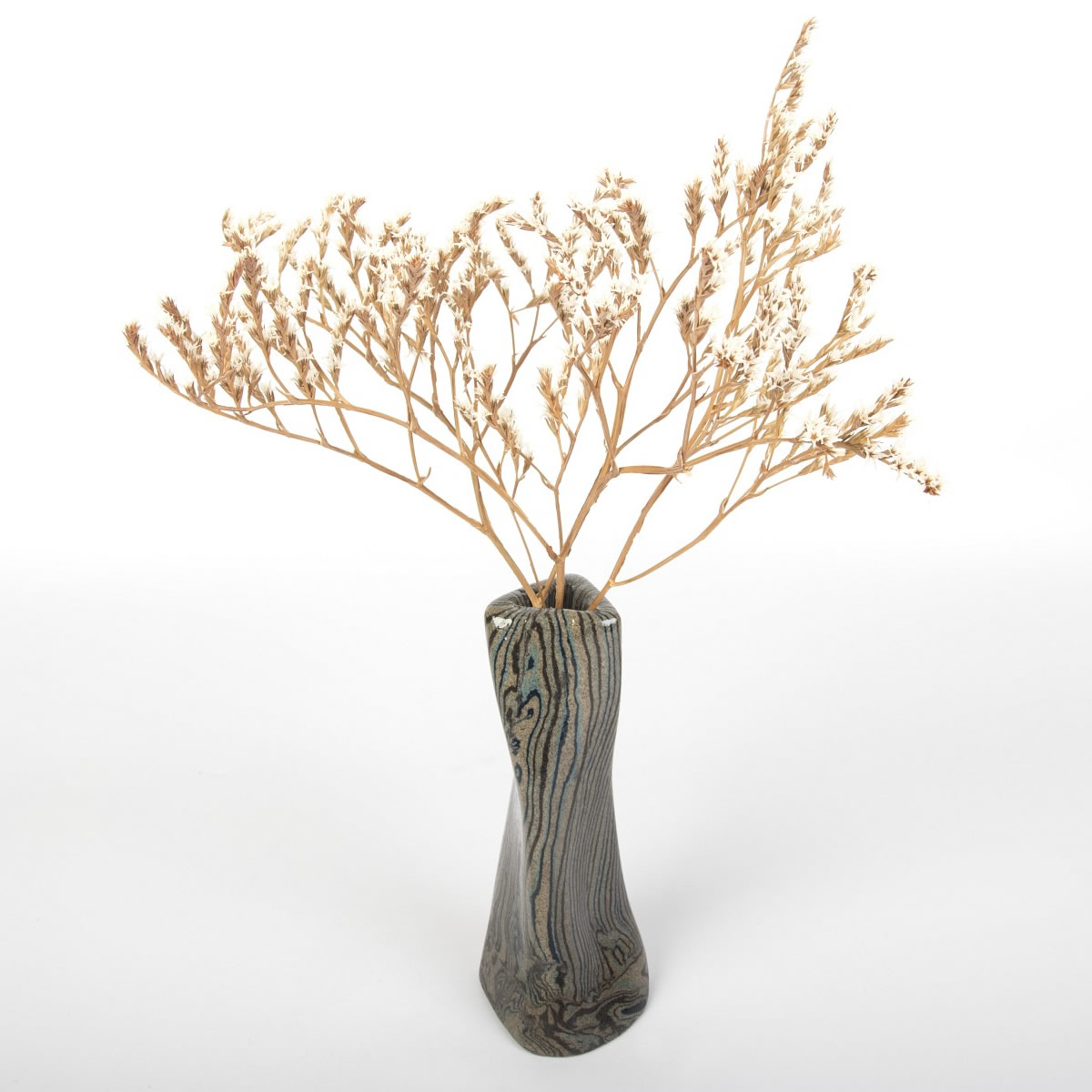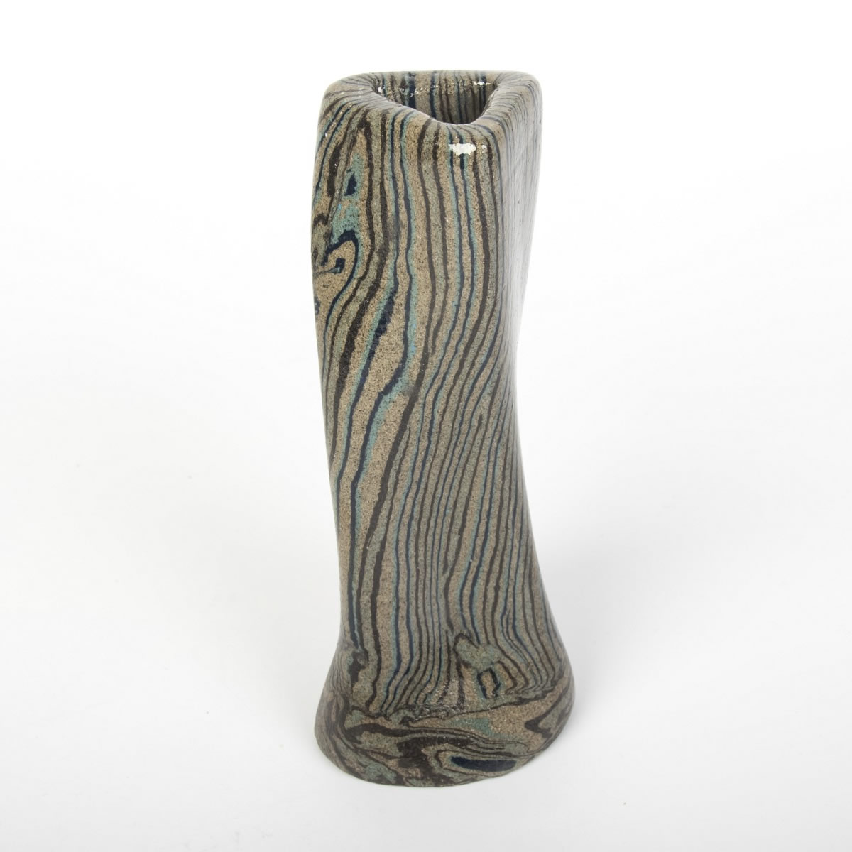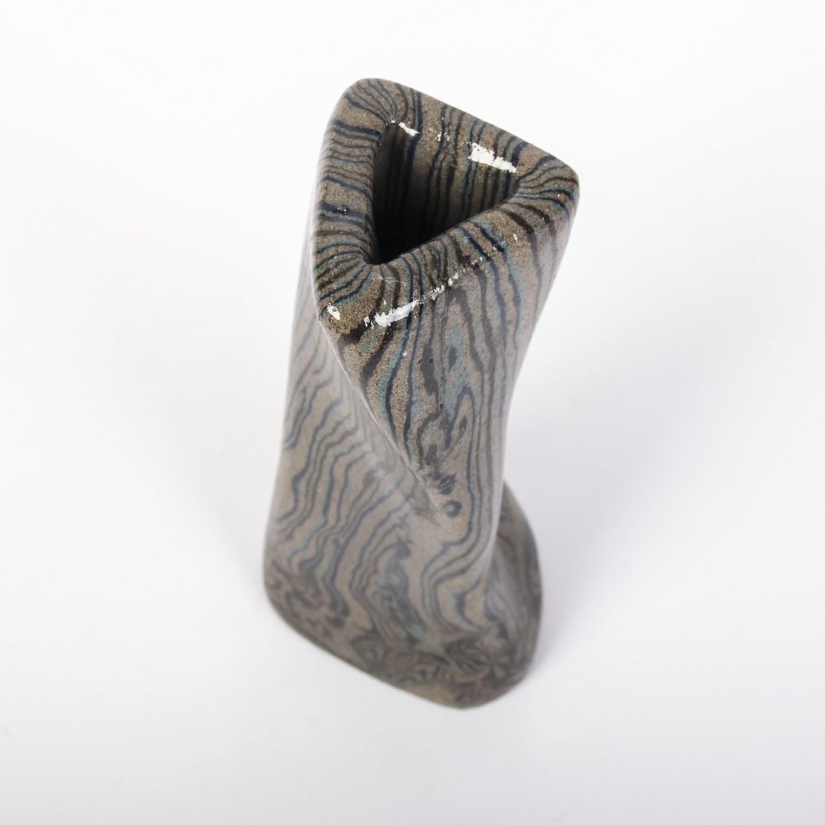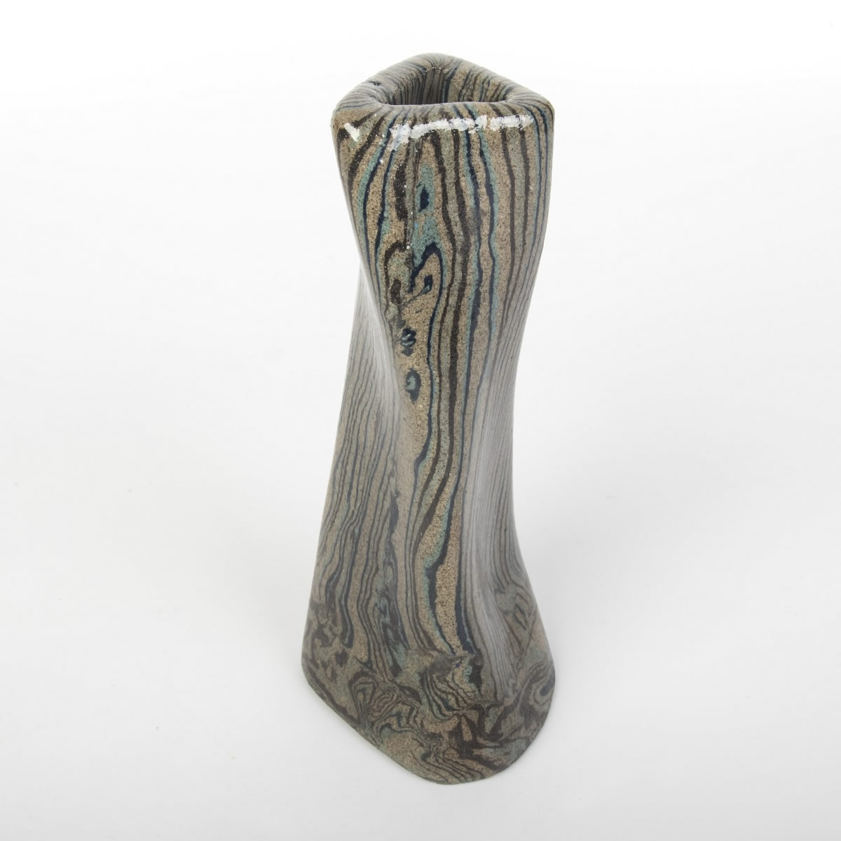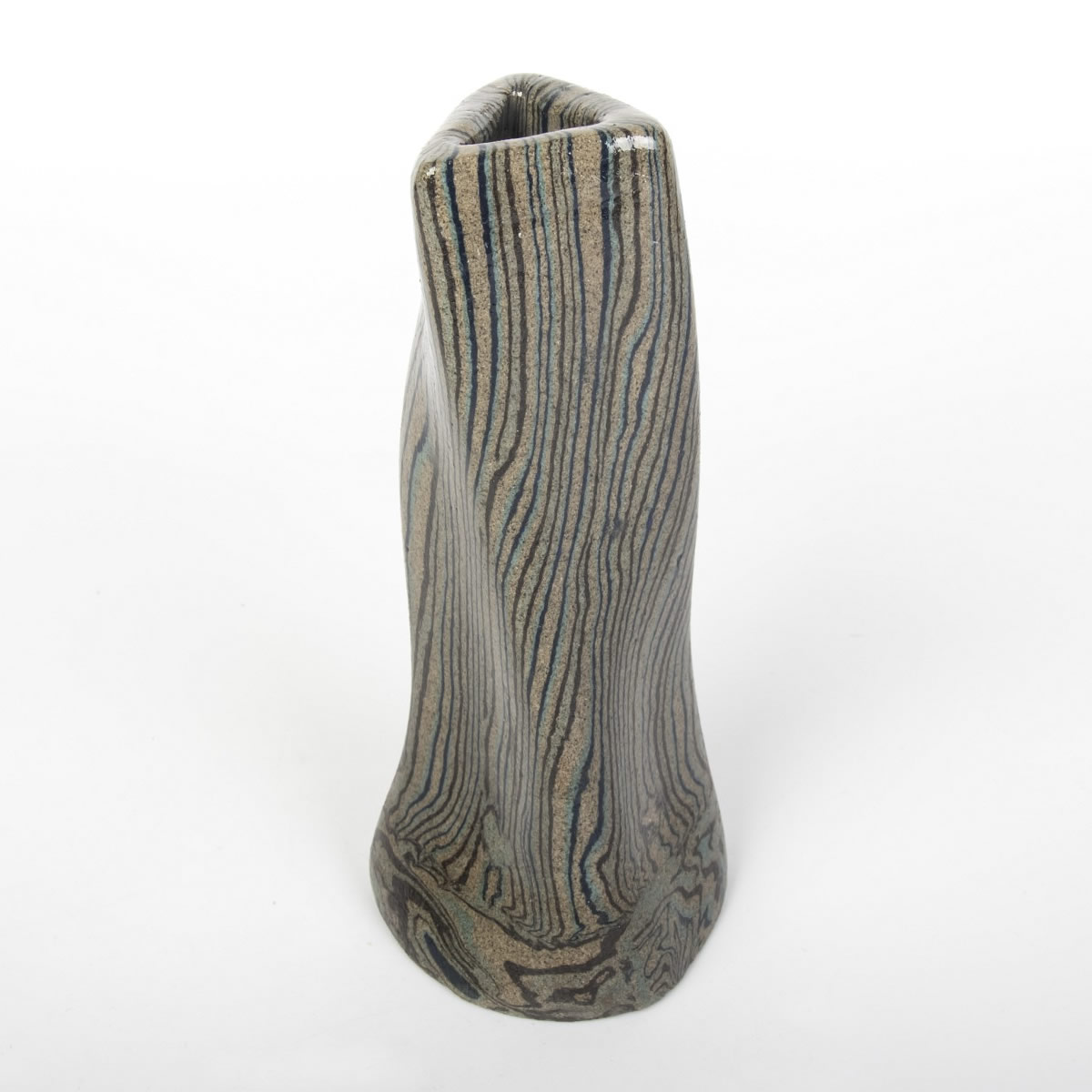Wazon ceramiczny, oryginalny i wykonany ręcznie, powstał z zastosowaniem techniki agatowej (marmurkowej, Nerikomi). Proces ten opierał się na odpowiednim połączeniu kolorowych glin, co zaowocowało stworzeniem oryginalnego i niepowtarzalnego wzoru w formie pionowych pasów. Zarówno zewnętrzna, jak i wewnętrzna część wazonu została pokryta błyszczącym, przezroczystym szkliwem.