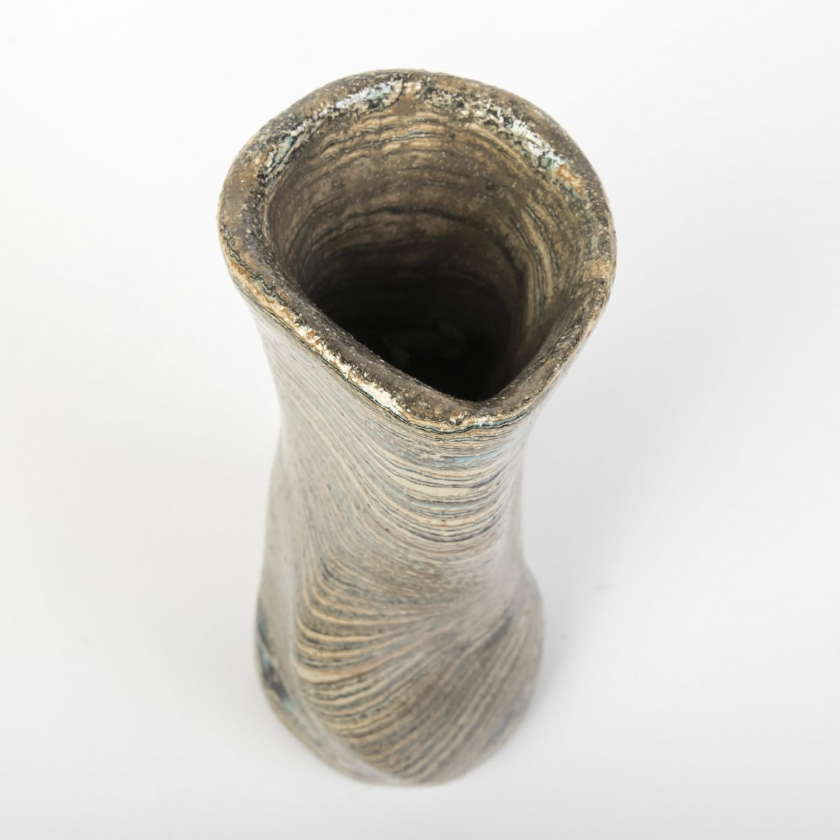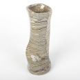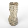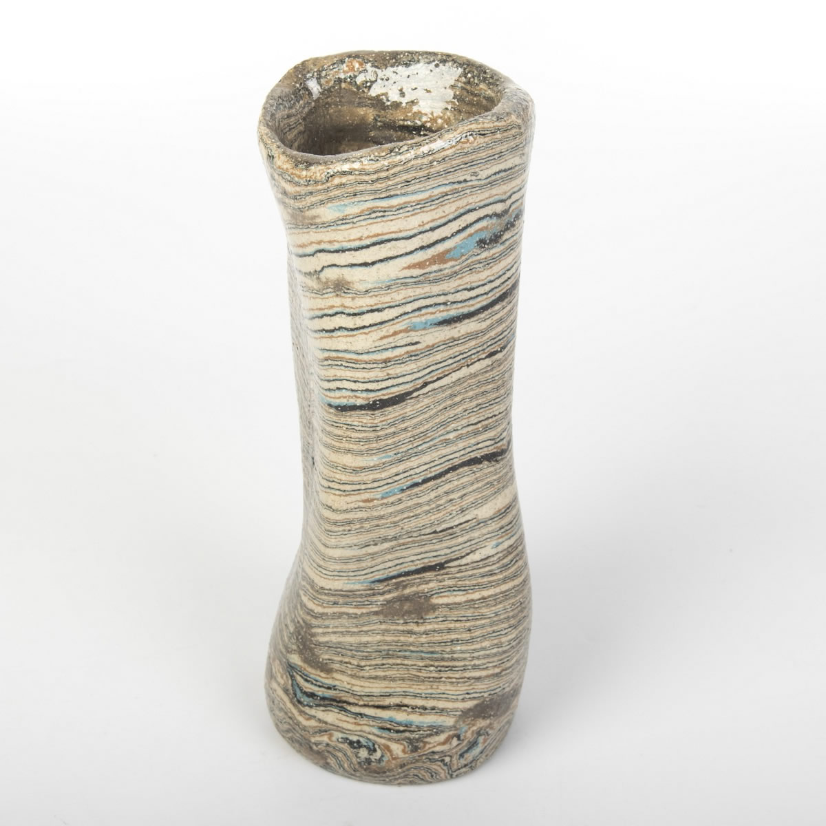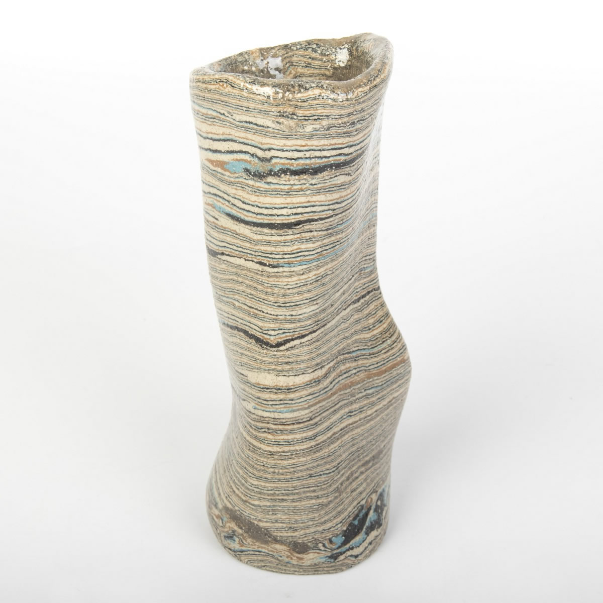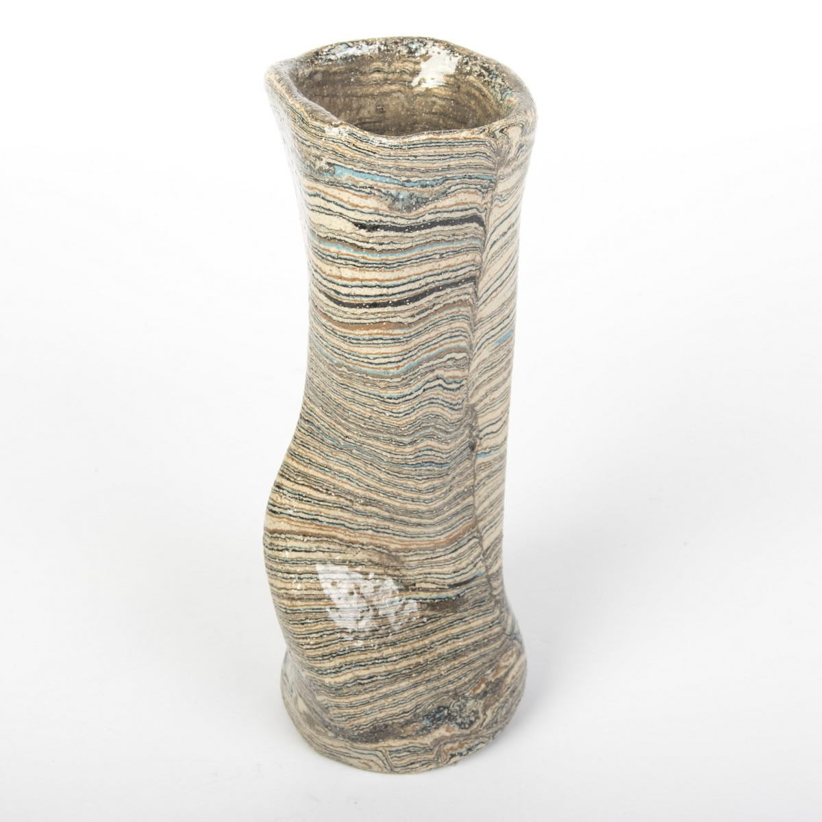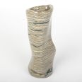 Wazon o unikalnej, ręcznie formowanej strukturze ceramicznej. Wykorzystano tu technikę agatową (marmurkową, Nerikomi), opartą na starannym połączeniu kolorowych glin, co zaowocowało powstaniem oryginalnego i niepowtarzalnego wzoru w gęstych, cienkich paskach. Cała powierzchnia została pokryta przezroczystym, bezbarwnym szkliwem.