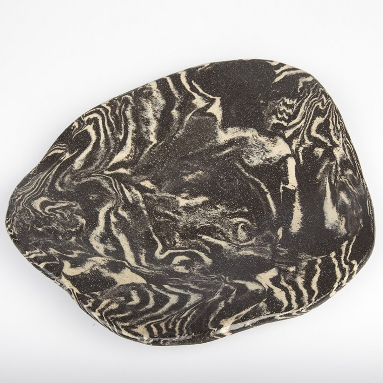 Wykonana została techniką agatową (Nerikomi, marmurkowa), polegajacca na odpowiednim połączeniu kolorowych glin. W tym przypadku część gliny za pomocą pigmentu została zabarwiona na kolor vzarny. Dzięki temu uzyskaliśmy efekt marmuru - czarno-kremowego.