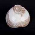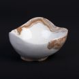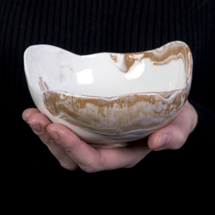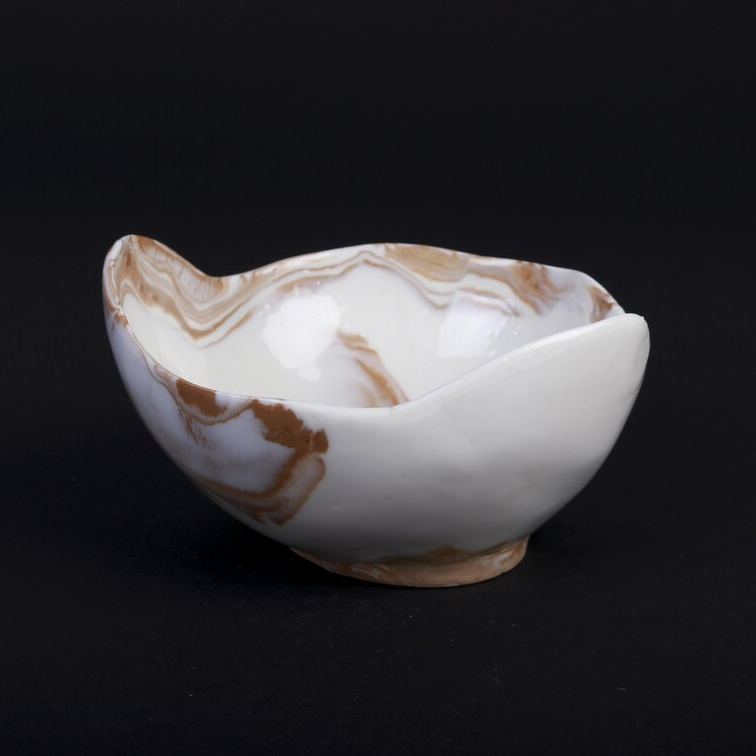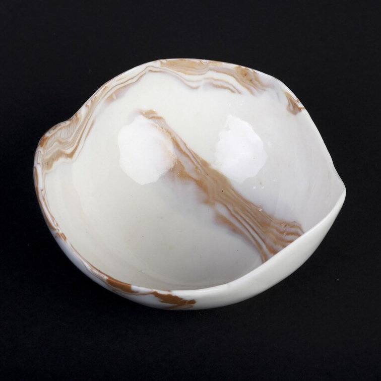 Ręcznie wykonana miska z porcelany techniką NERIKOMI. Część porcelany została zabarwiona pigmentem w kolorze ochry. Zmieszanie kolorów białego z ochrą utworzyło wzór marmurkowy. Całość została pokryta przeźroczystym, błyszczącym szkliwem. Miseczka została uformowana ręcznie, dodając dotego technikę NERIKOMI - powstał unikatowy produkt.