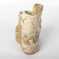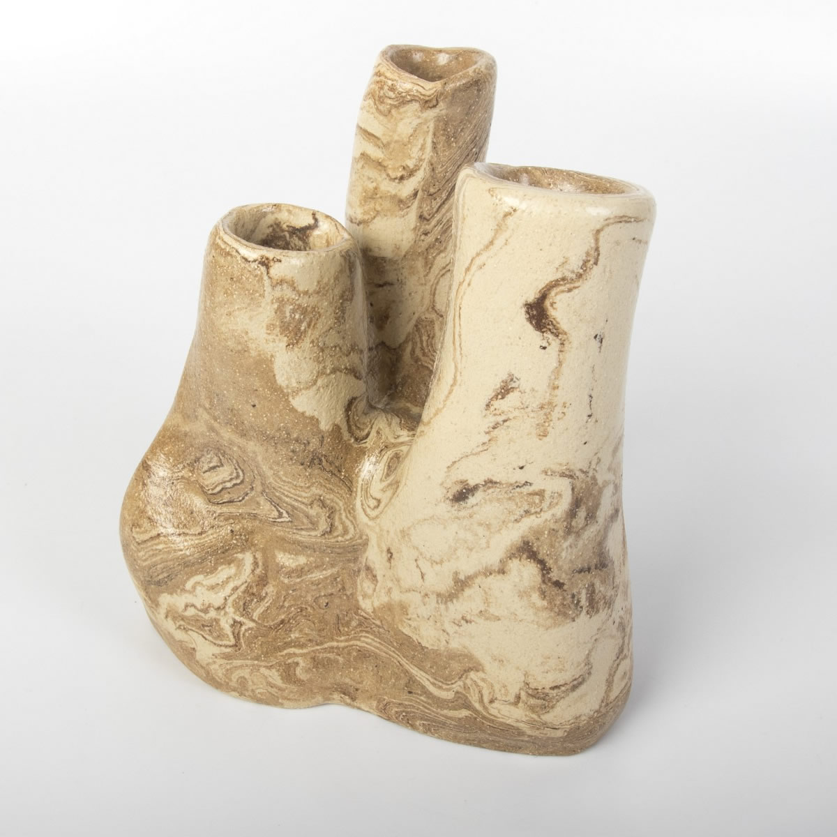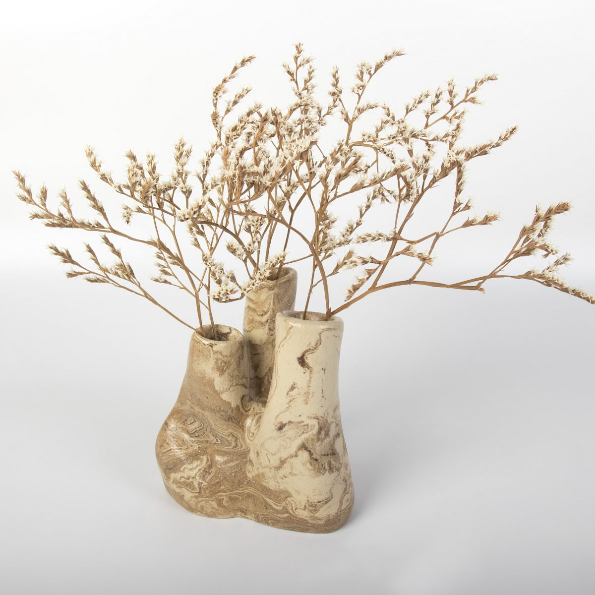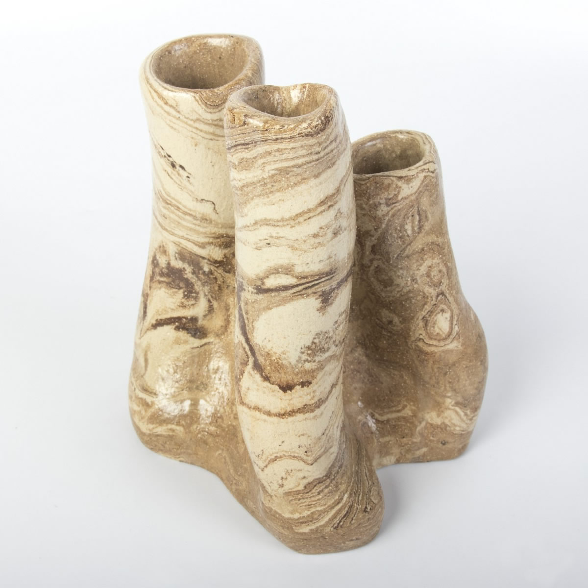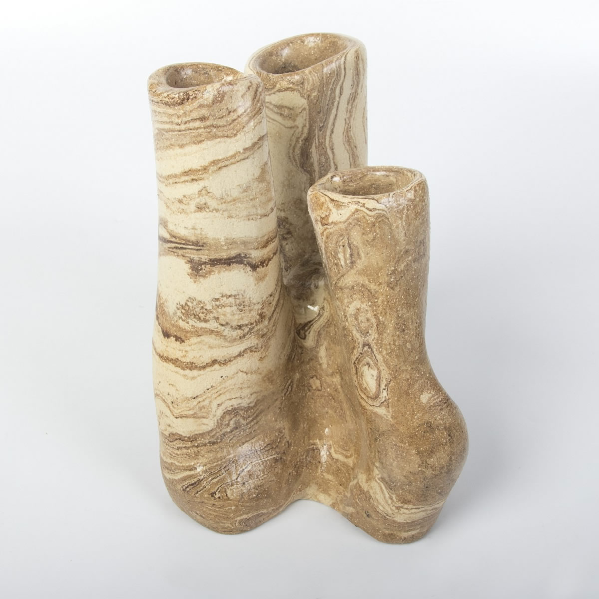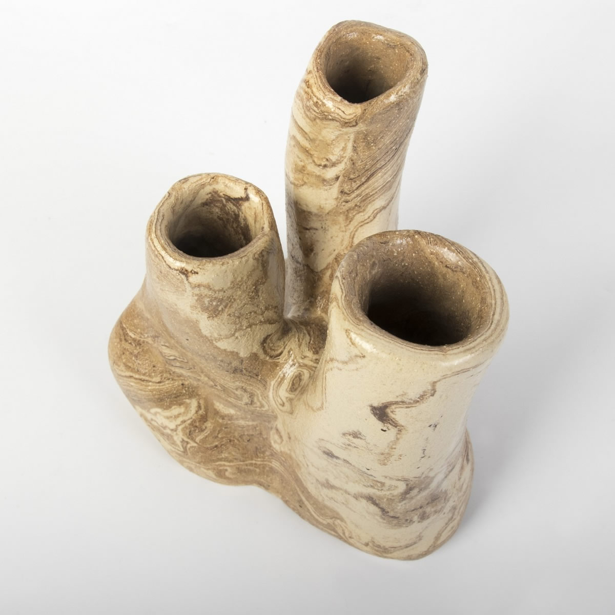 Potrójny wazon ceramiczny, wykonany ręcznie, prezentuje nietypową formę łączącą trzy wazony w jedną całość. Zastosowanie kolorowych glin umożliwiło stworzenie efektu drewnopodobnego wzoru, nadając temu przedmiotowi wyjątkowy wyraz. Wazon, przywodzący na myśl fragment konaru, stanowi subtelne odniesienie do inspiracji naturą.