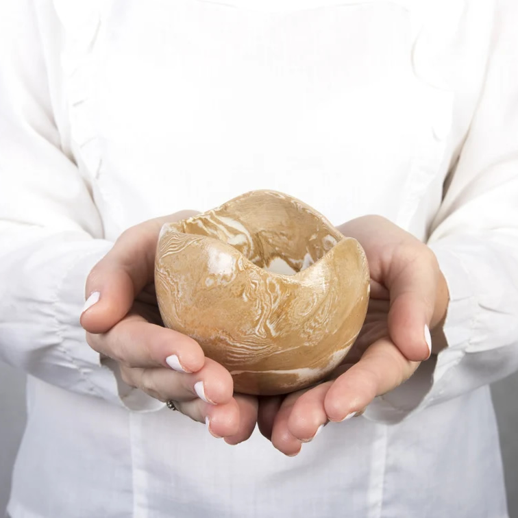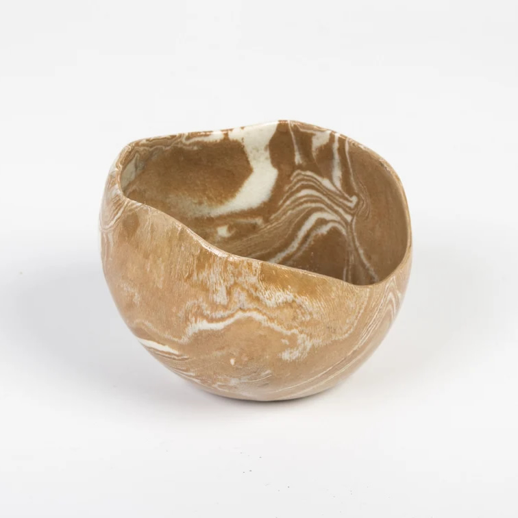Mała osłonka ceramiczna wykonana techniką NERIKOMI. Została odpowiednio zmieszana glina w kolorze białym i ochry. W ten sposób uzyskaliśmy niepowtarzalny wzór marmurkowy w ciepłych kolorach.