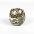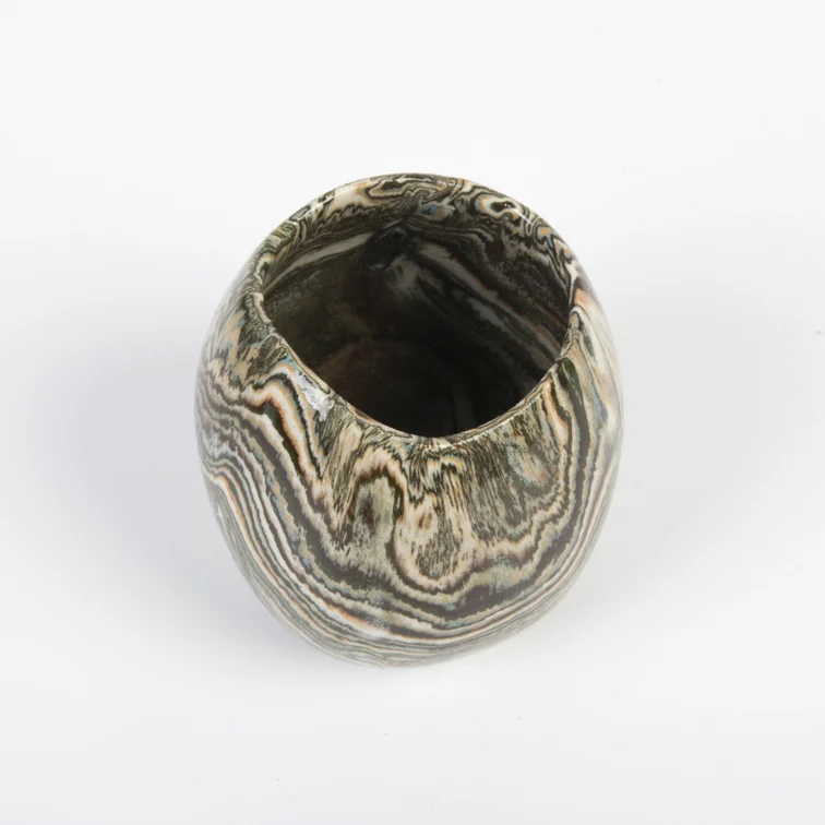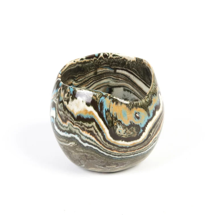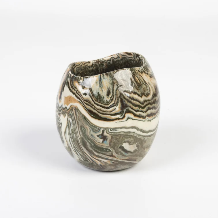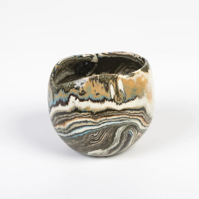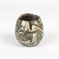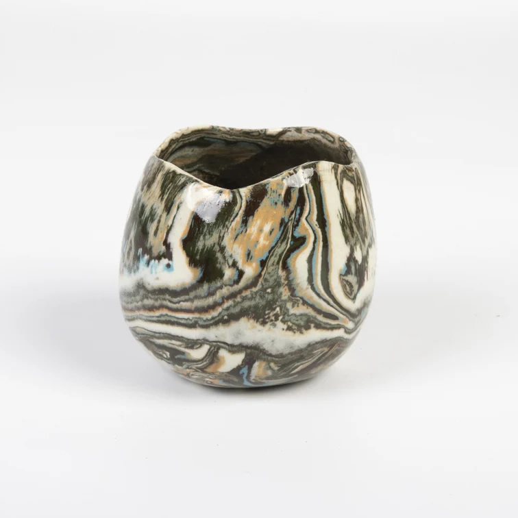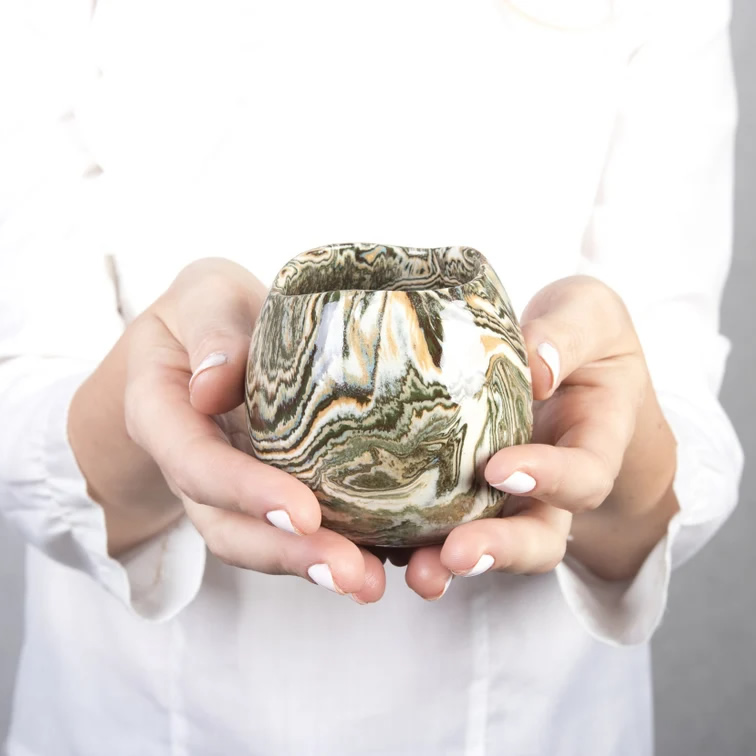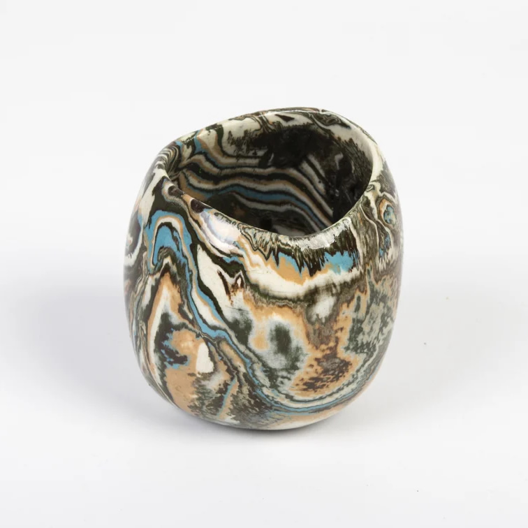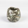 Mała ceramiczna osłonka wykonana ręcznie techniką NERIKOMI. Zmieszane zostało parę kolorów glin (czarny, ochra, biały, błękitny) by uzyskać efekt kolorowego marmuru. Powstały w ten sposób wzór nadaje unikalność każdego produktu.