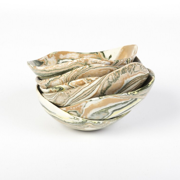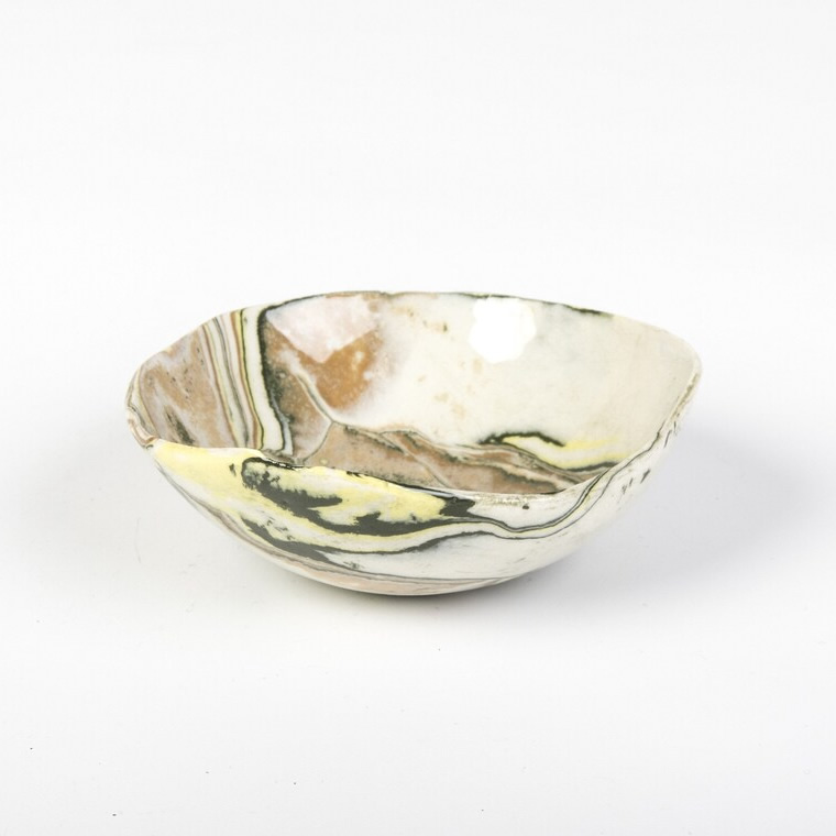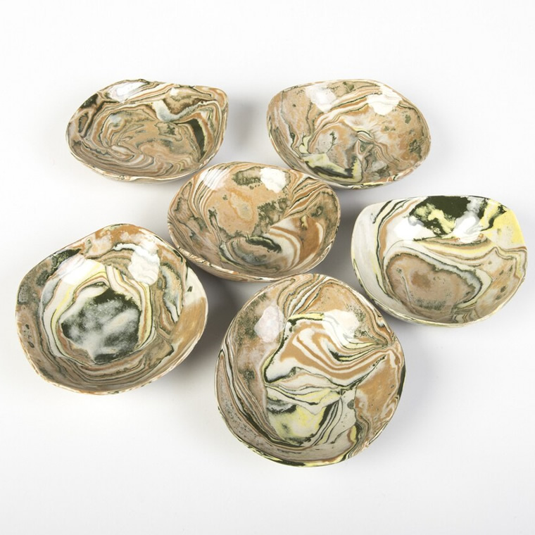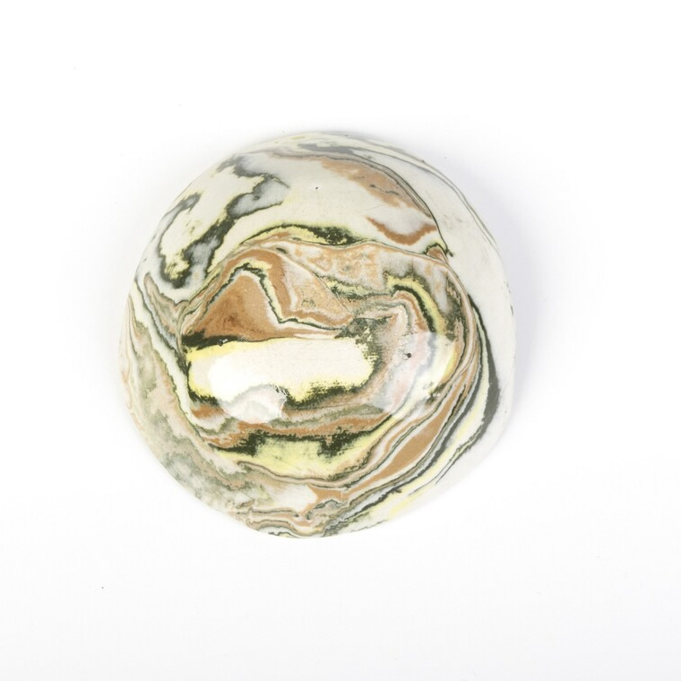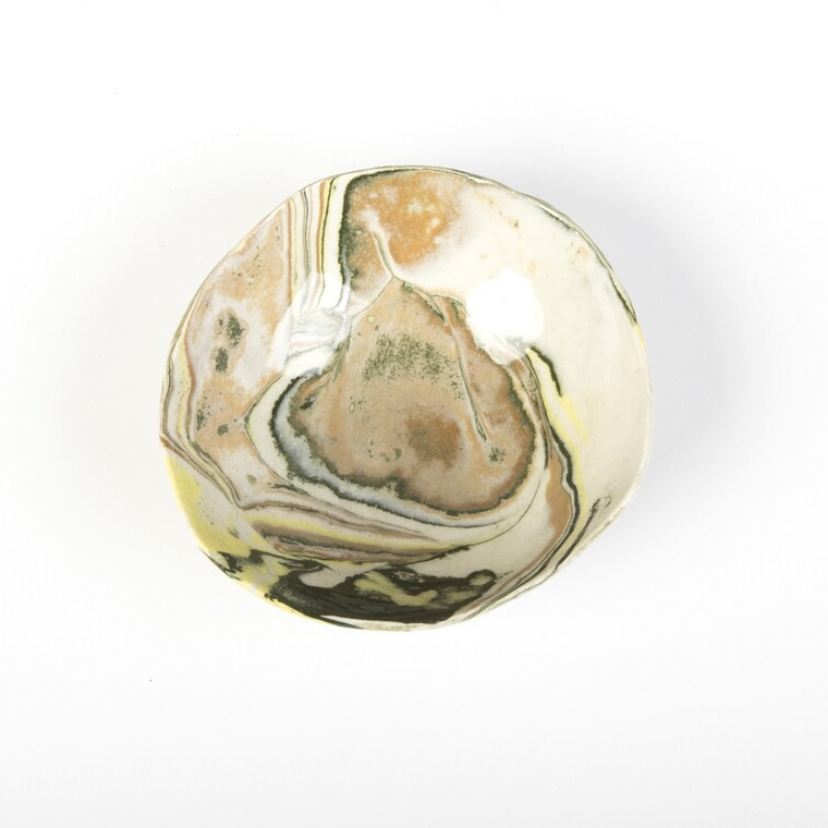 Mała ceramiczna podstawka, miseczka, wykonana techniką agatową, polegającą na odpowiednim zmieszaniu kolorowych glin.