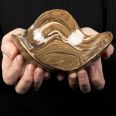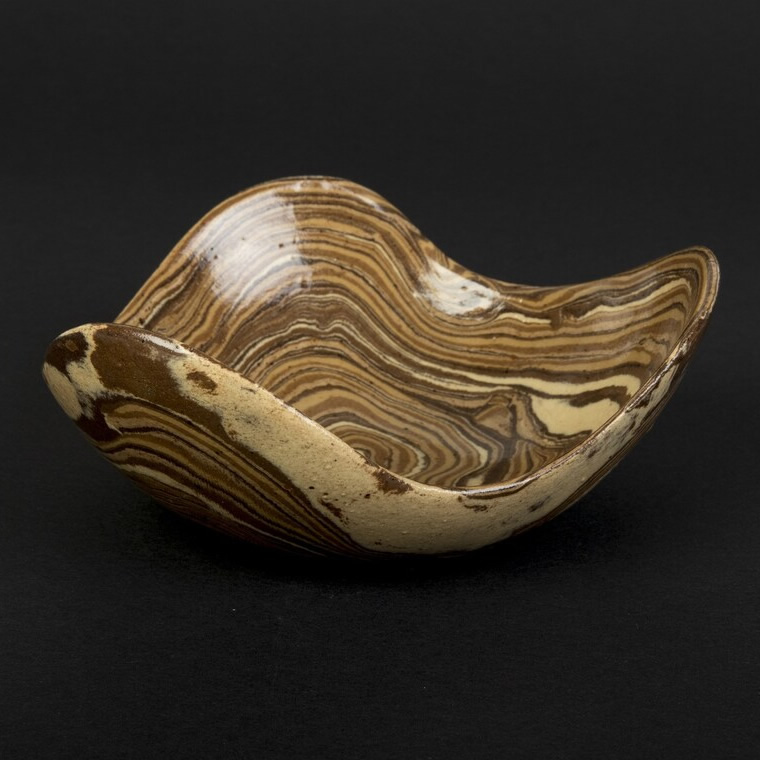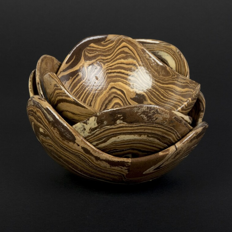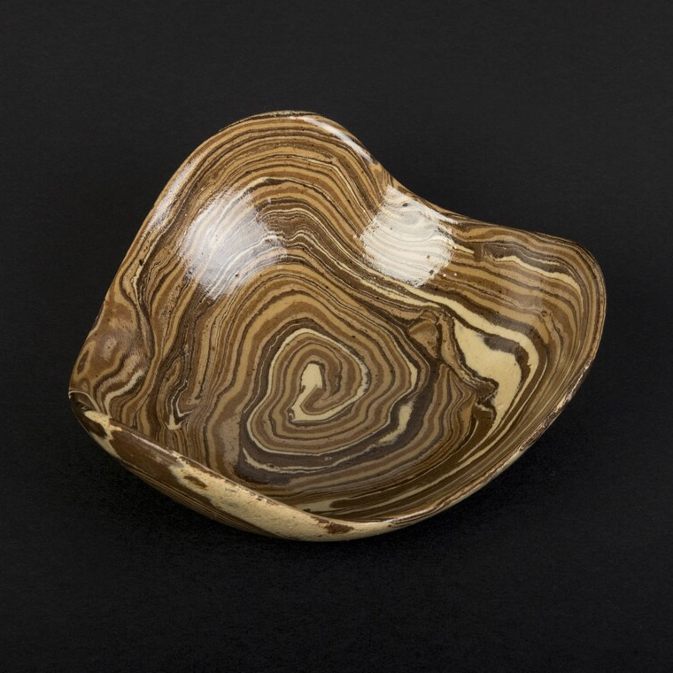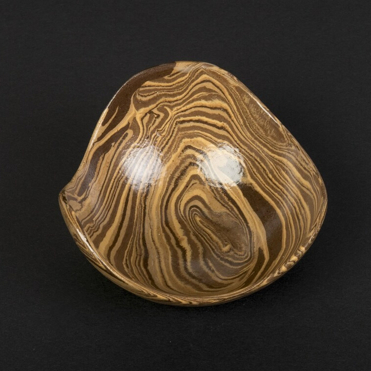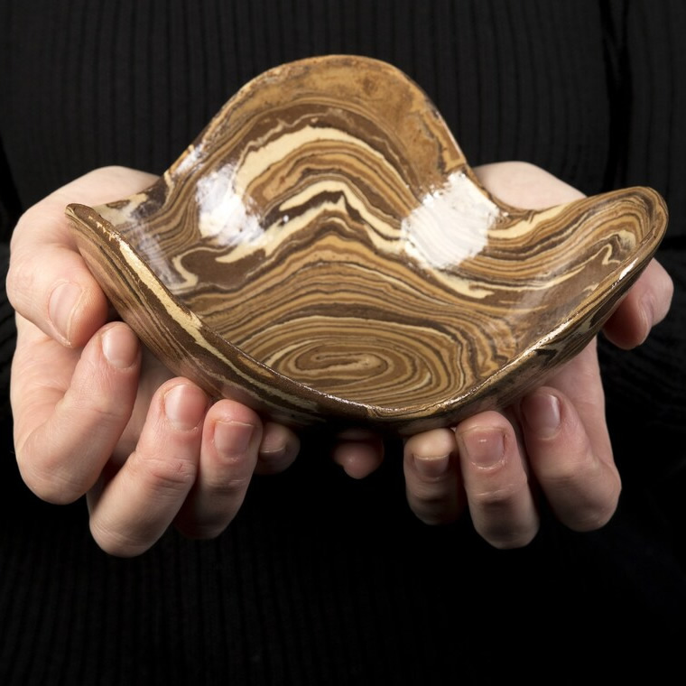 Ta ręcznie wykonana miska ceramiczna została wykonana w technice agatowej (marmurkowej, Nerikomi), polegająca na odpowiednim połączeniu kolorowych glin. Przy tworzeniu tych misek - zostały połączone gliny w różnych odcieniach brązu, dzięki temu uzyskaliśmy efekt drewnianych słojów.
