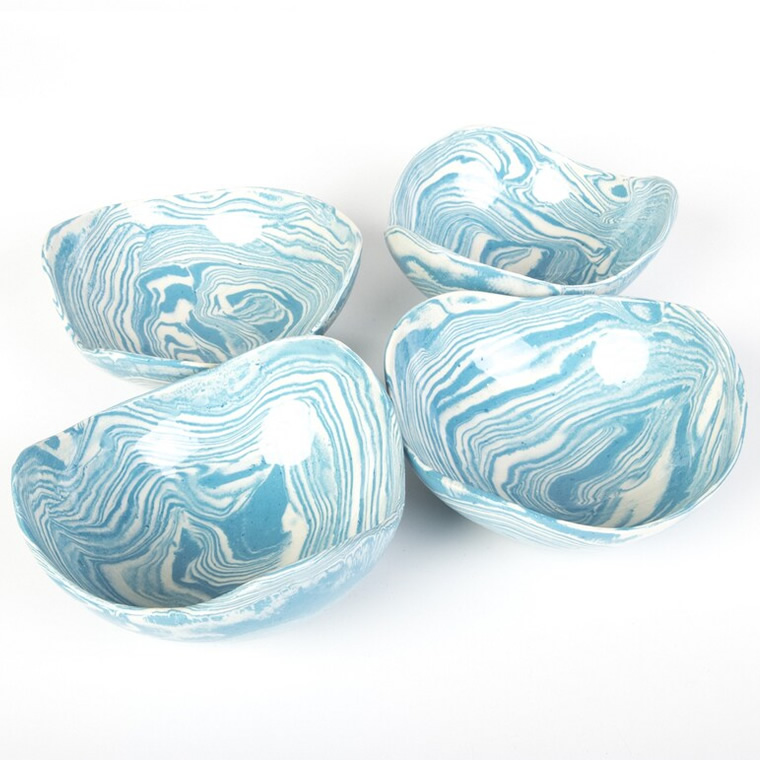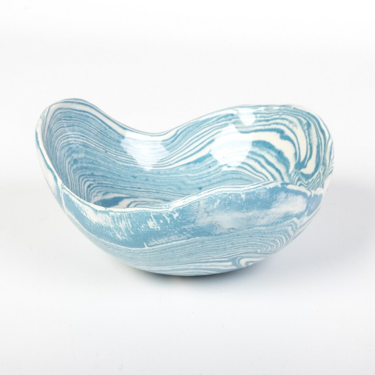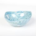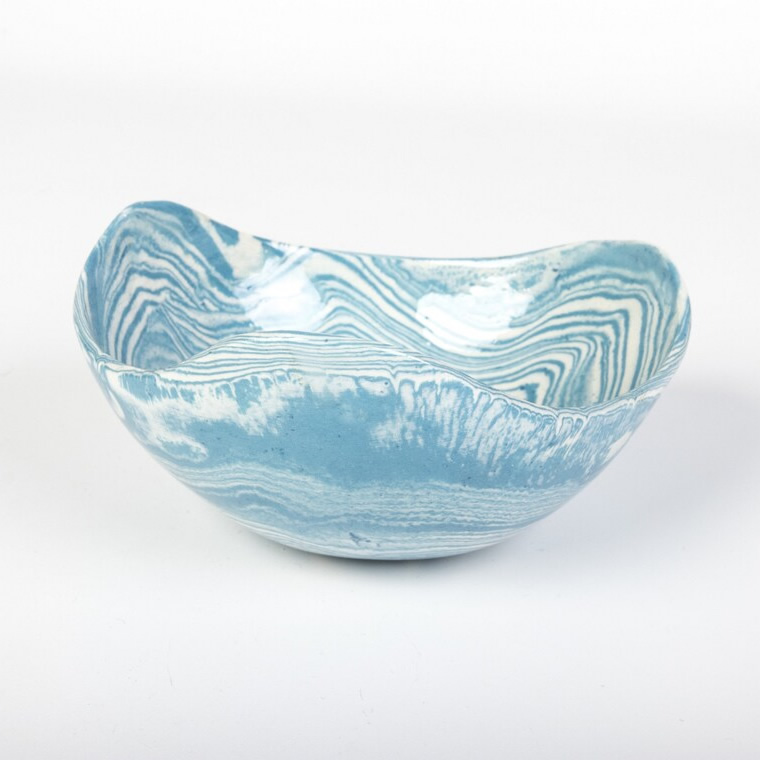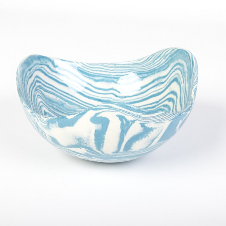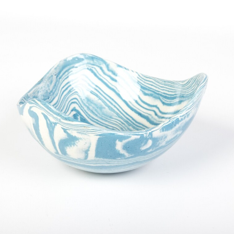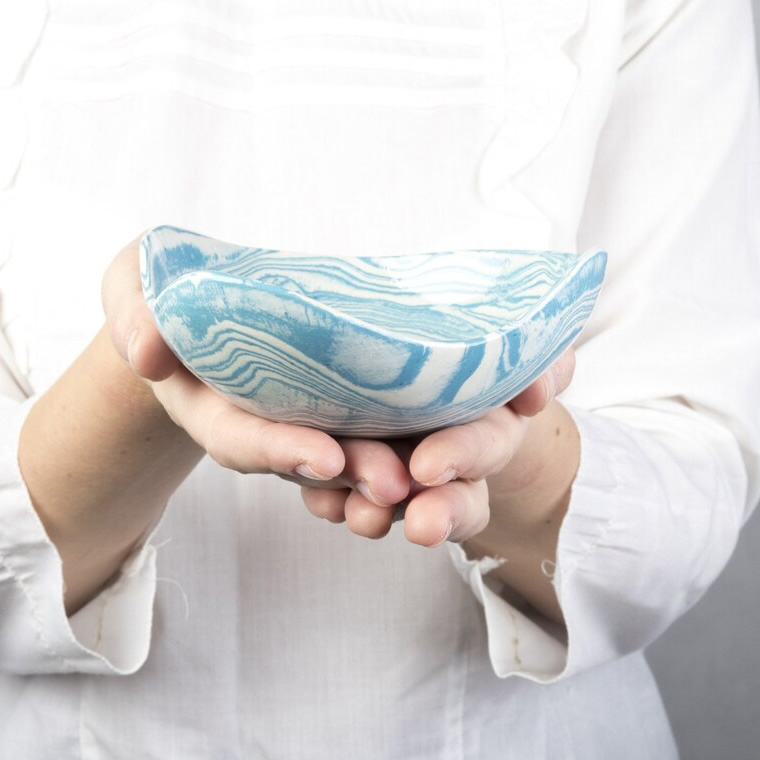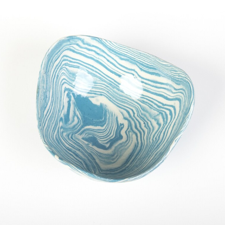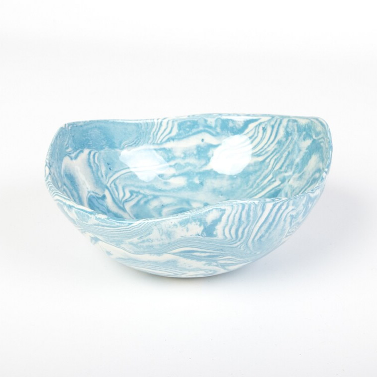 Ręcznie wykonana miseczka ceramiczna w kolorze nieba. Wykonana została techniką agatową (marmurkową, Nerikomi), która polega na odpowiednim połączeniu glin w różnych kolorach. Dzięki odpowiedniemu połączeniu błękitu i bieli uzyskaliśmy niepowtarzalny wzór marmurkowy.