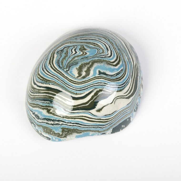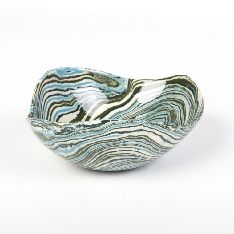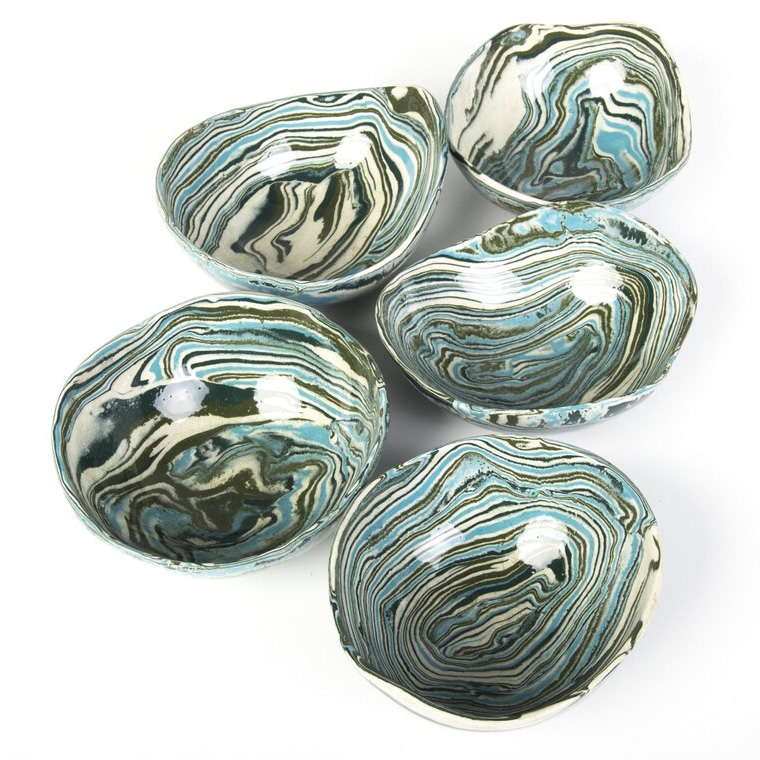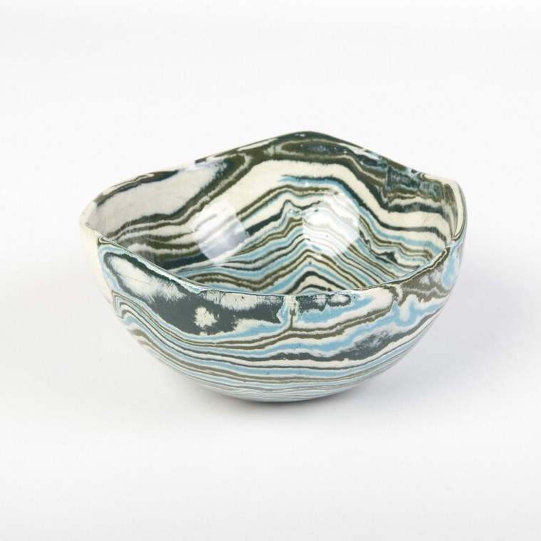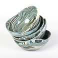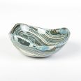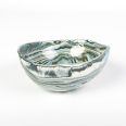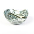 Ręcznie wykonana miseczka ceramiczna. Dzięki odpowiedniemu zmieszaniu kolorowych glin (kolor ciemnozielony, niebieski i biały) uzyskany został niepowtarzalny wzór marmurkowy.