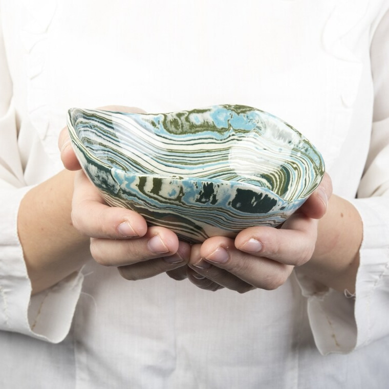 To doskonały pomysł na prezent, ponieważ jest jedyny w swoim rodzaju. Każda miseczka jest nieco inna (różnice widoczne są w kształcie krawędzi oraz w marmurkowym wzorze).
