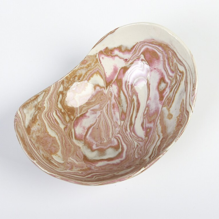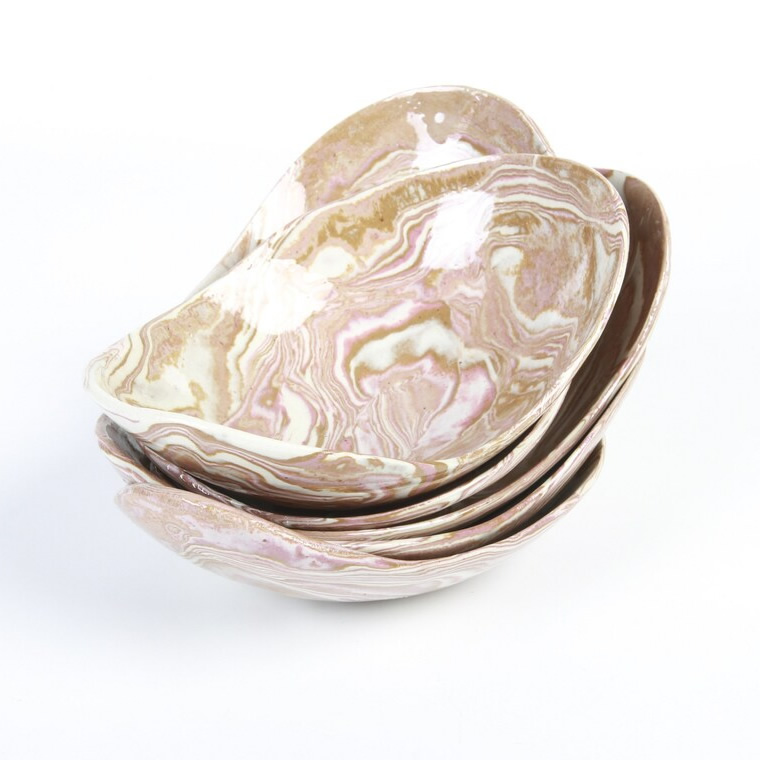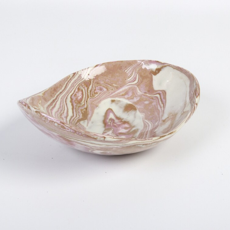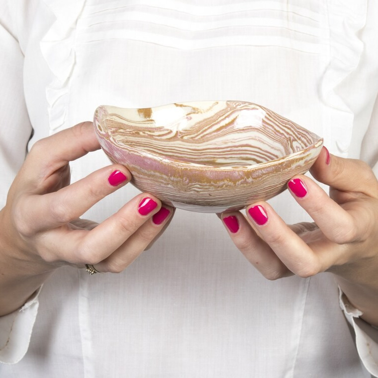 Ręcznie wykonana miseczka ceramiczna, powstała dzięki odpowiedniemu połączniu glin w kolorze kremowym i ochry (technika agatowa). Uzyskany dzięki temu marmurkowy wzór jest niepowtarzalny.