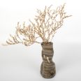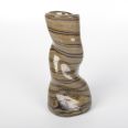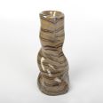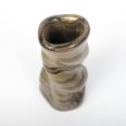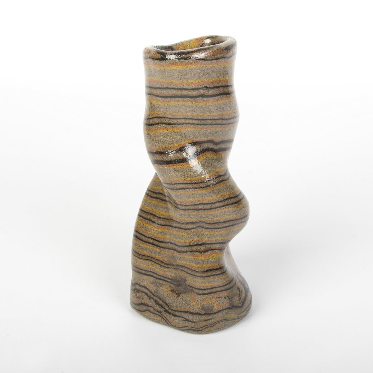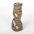 Wazon ceramiczny o nieregularnym kształcie został starannie wykonany ręcznie, z zastosowaniem techniki agatowej (marmurkowej, Nerikomi). Proces ten opierał się na precyzyjnym łączeniu kolorowych glin. W tym przypadku, dzięki połączeniu glin o odcieniach szarej, ciemno brązowej, pomarańczowej i żółtej, uzyskano wyjątkowy, pasiasty wzór. Całość została pokryta przeźroczystym, błyszczącym szkliwem. Ten niepowtarzalny wazon stanowi doskonały prezent dla miłośników oryginalności.