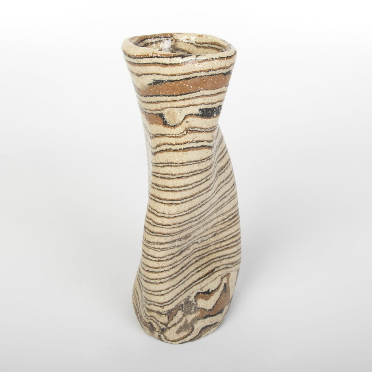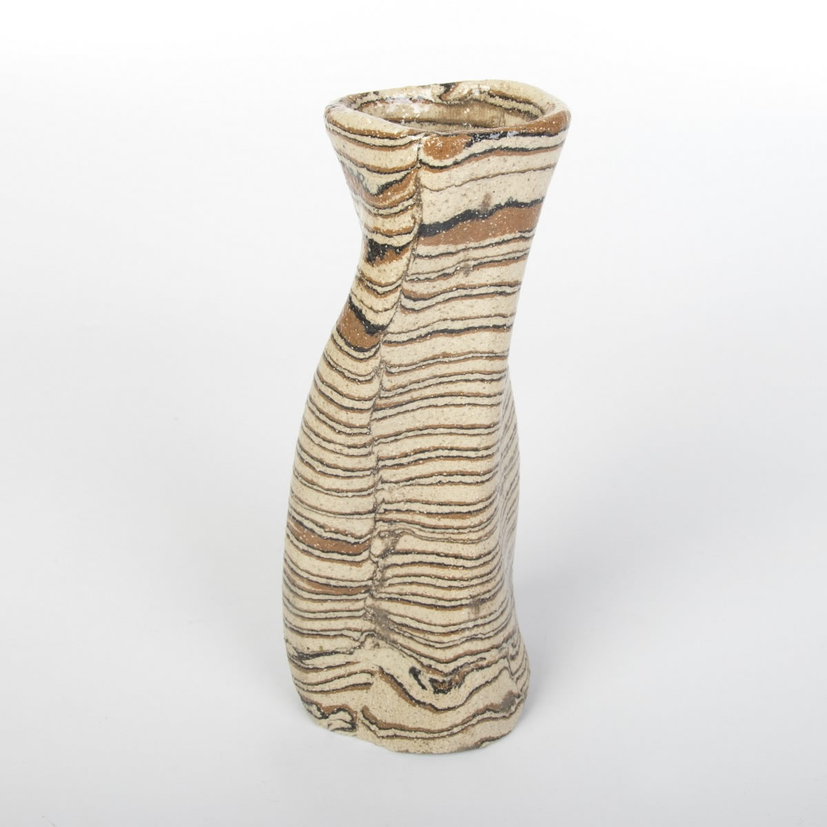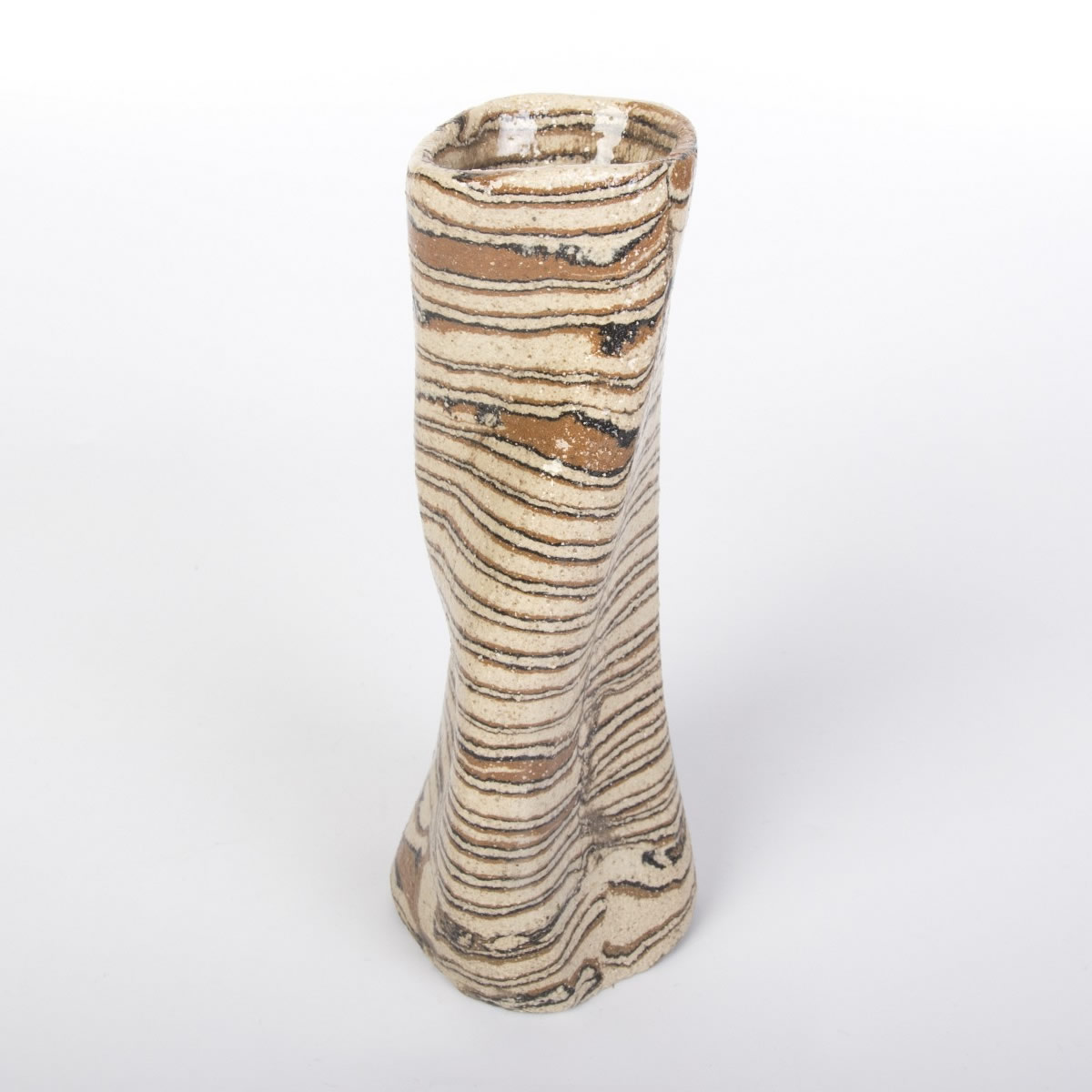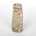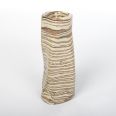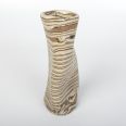 Wazon o nietypowym, nieregularnym kształcie został starannie wykonany ręcznie, wykorzystując fascynującą technikę agatową (marmurkową, Nerikomi). Technika ta polega na precyzyjnym mieszaniu kolorowych glin. W tym przypadku dzięki odpowiedniemu połączeniu gliny kremowej, brązowej i czarnej powstał niepowtarzalny wzór w paski. Powierzchnia wazonu została pokryta błyszczącym szkliwem, dodatkowo charakteryzując się chropowatym wykończeniem z uwagi na zastosowaną glinę z dużą ilością grubszego szamotu.