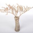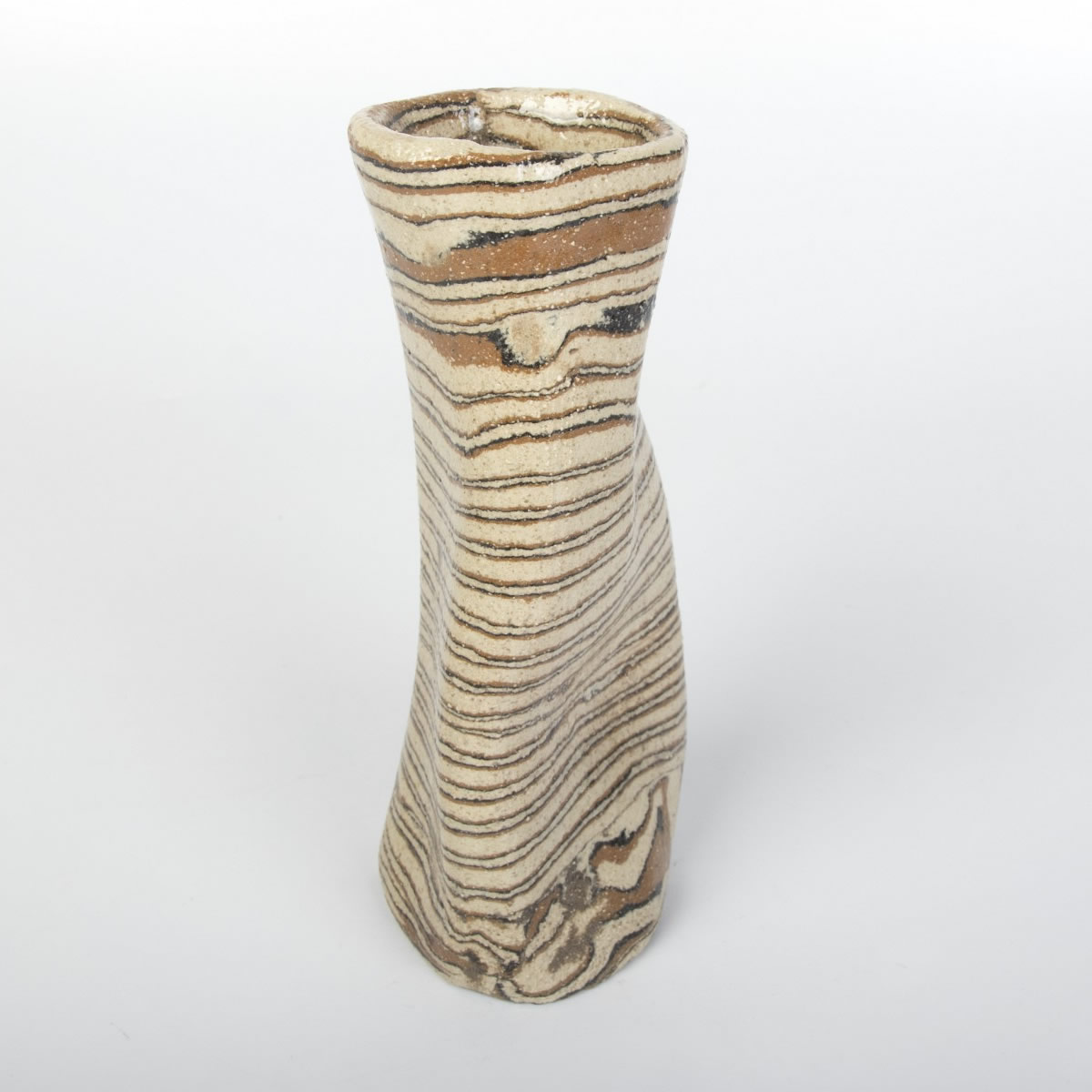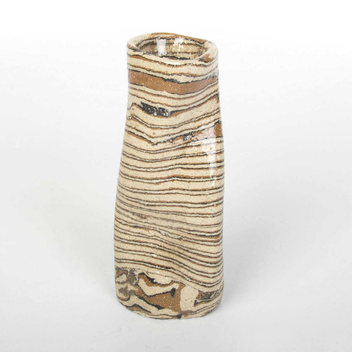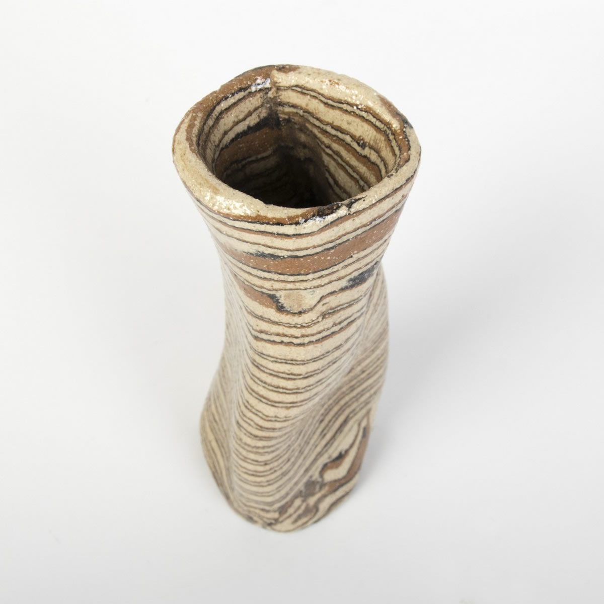 Wazon o nietypowym, nieregularnym kształcie został starannie wykonany ręcznie, wykorzystując fascynującą technikę agatową (marmurkową, Nerikomi). Technika ta polega na precyzyjnym mieszaniu kolorowych glin. W tym przypadku dzięki odpowiedniemu połączeniu gliny kremowej, brązowej i czarnej powstał niepowtarzalny wzór w paski. Powierzchnia wazonu została pokryta błyszczącym szkliwem, dodatkowo charakteryzując się chropowatym wykończeniem z uwagi na zastosowaną glinę z dużą ilością grubszego szamotu.
