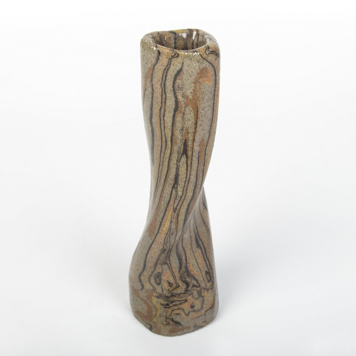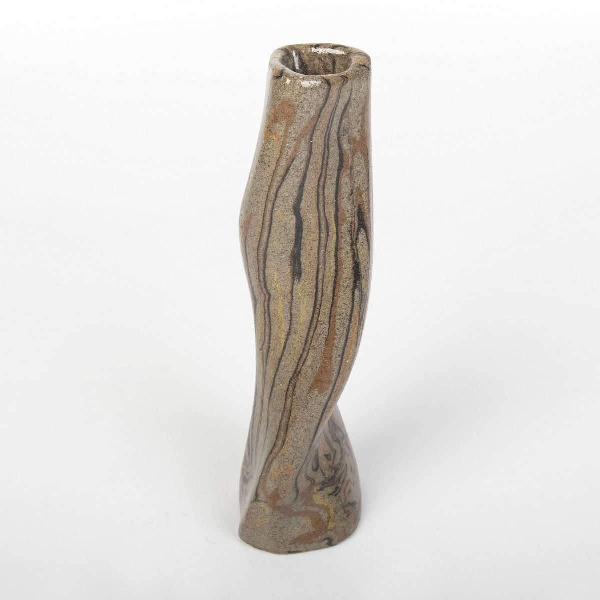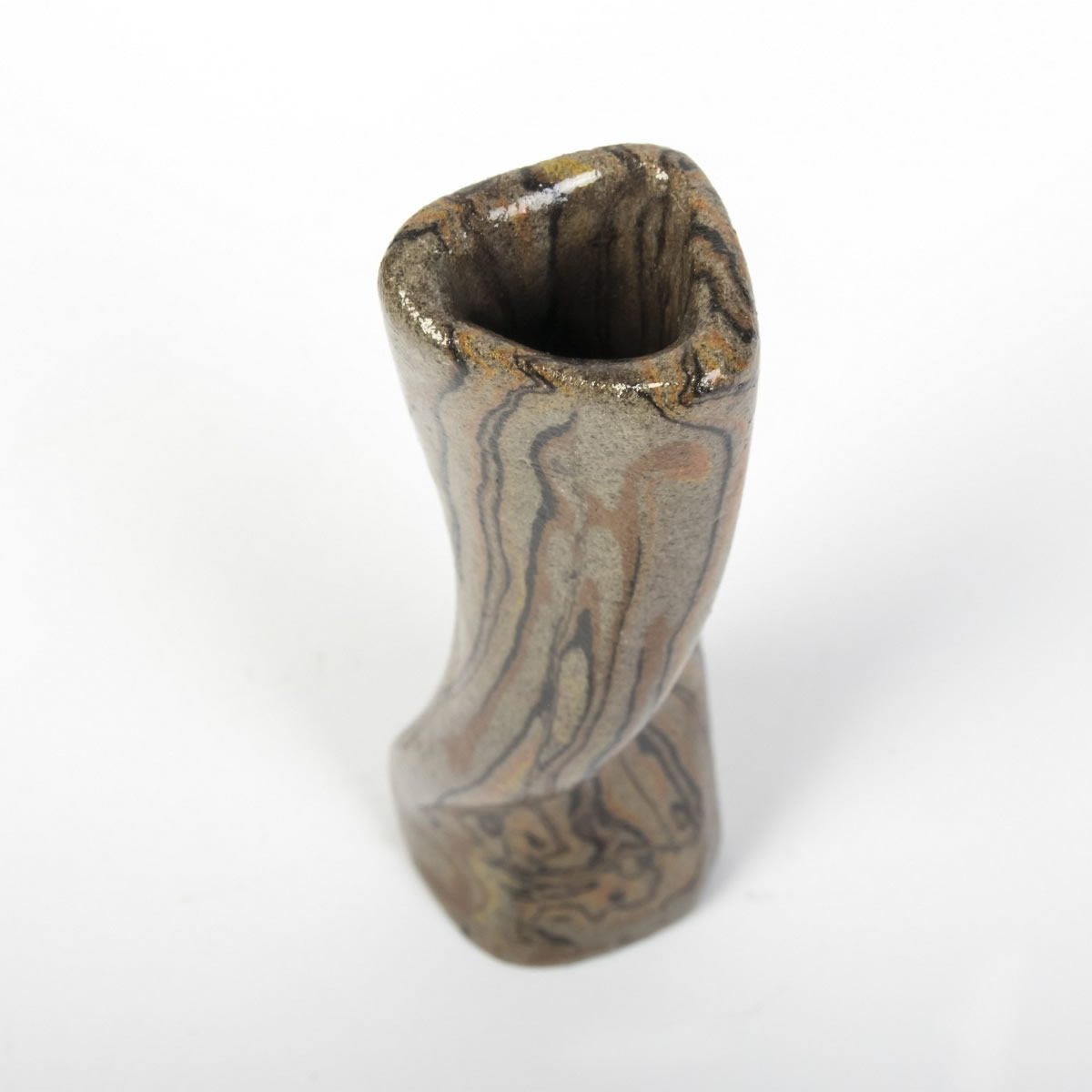 Wazon o nietypowej formie został starannie ręcznie wykonany z użyciem techniki agatowej (marmurkowej, Nerikomi). W trakcie procesu precyzyjnie połączono kolorowe gliny, a całość została pokryta błyszczącym, przezroczystym szkliwem. Wynikiem tego starannego procesu jest nie tylko estetyczny, ale także praktyczny przedmiot, idealny do eksponowania ciętych kwiatów lub suchych kompozycji. Wazon reprezentuje udane połączenie elegancji z użytecznością.