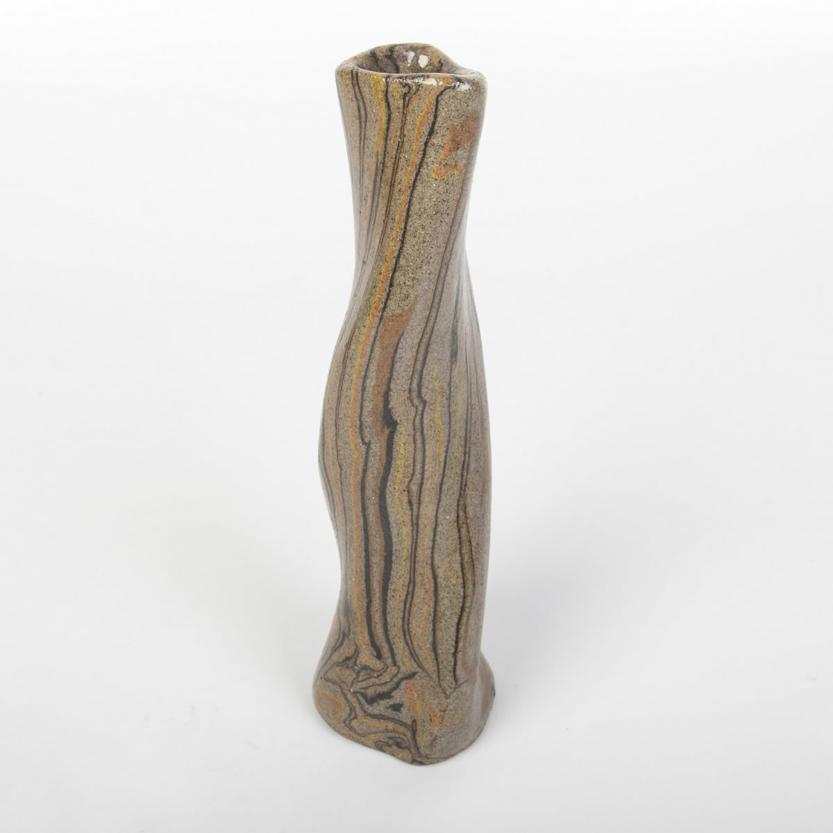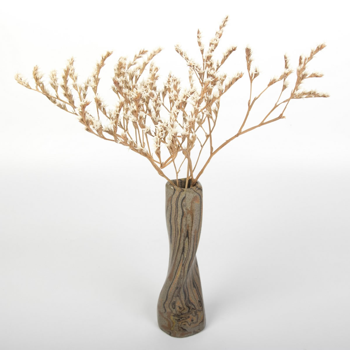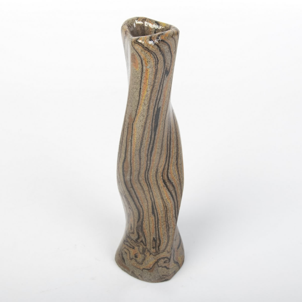 Wazon o nietypowej formie został starannie ręcznie wykonany z użyciem techniki agatowej (marmurkowej, Nerikomi). W trakcie procesu precyzyjnie połączono kolorowe gliny, a całość została pokryta błyszczącym, przezroczystym szkliwem. Wynikiem tego starannego procesu jest nie tylko estetyczny, ale także praktyczny przedmiot, idealny do eksponowania ciętych kwiatów lub suchych kompozycji. Wazon reprezentuje udane połączenie elegancji z użytecznością.
