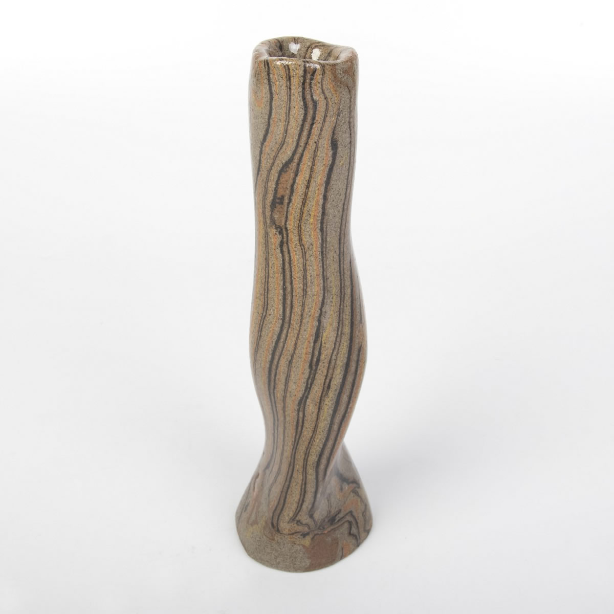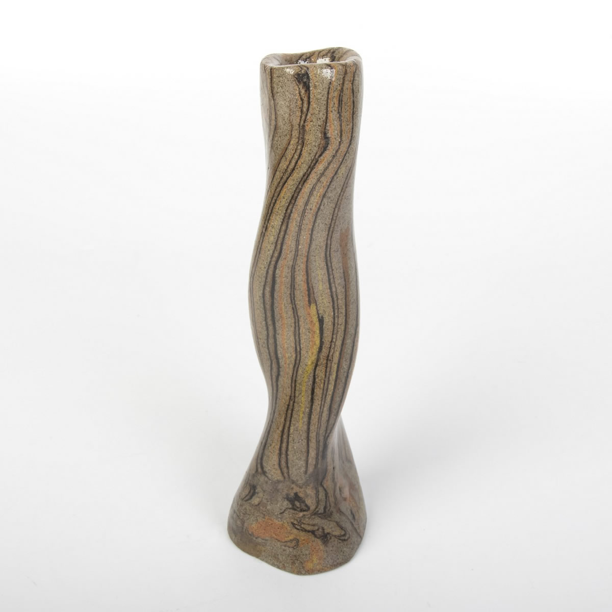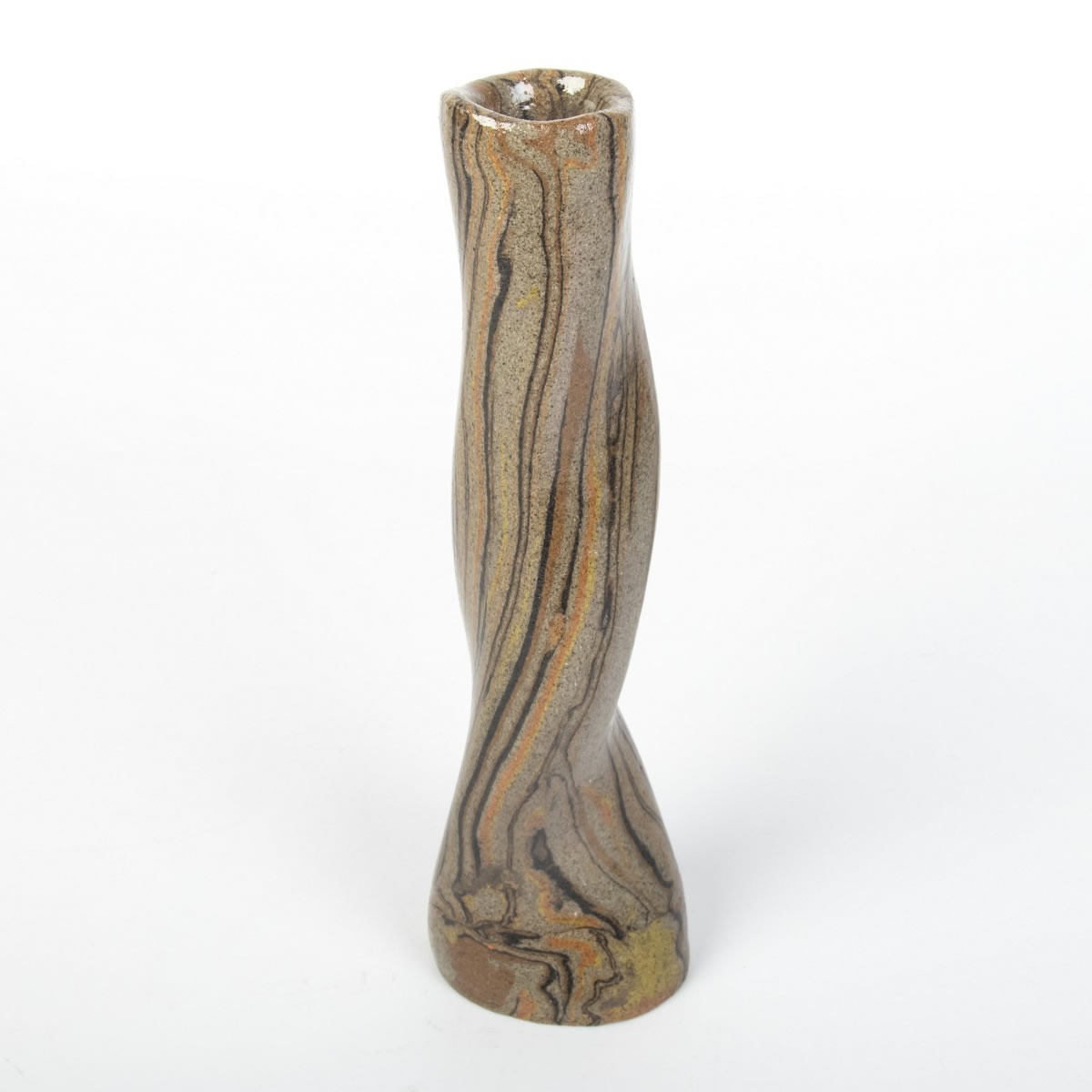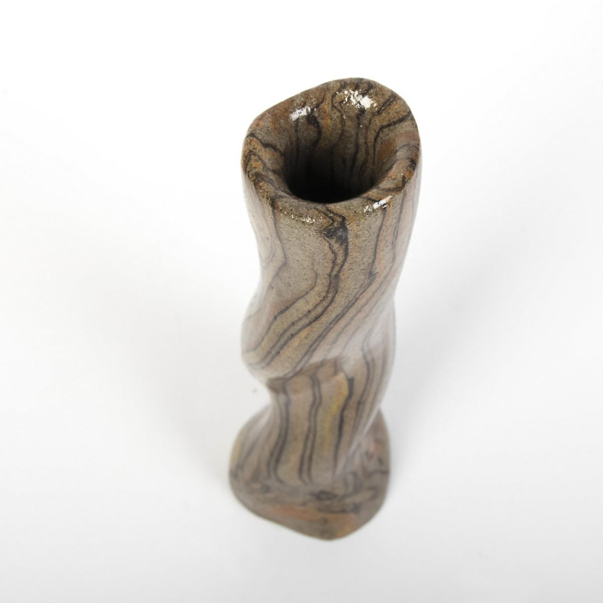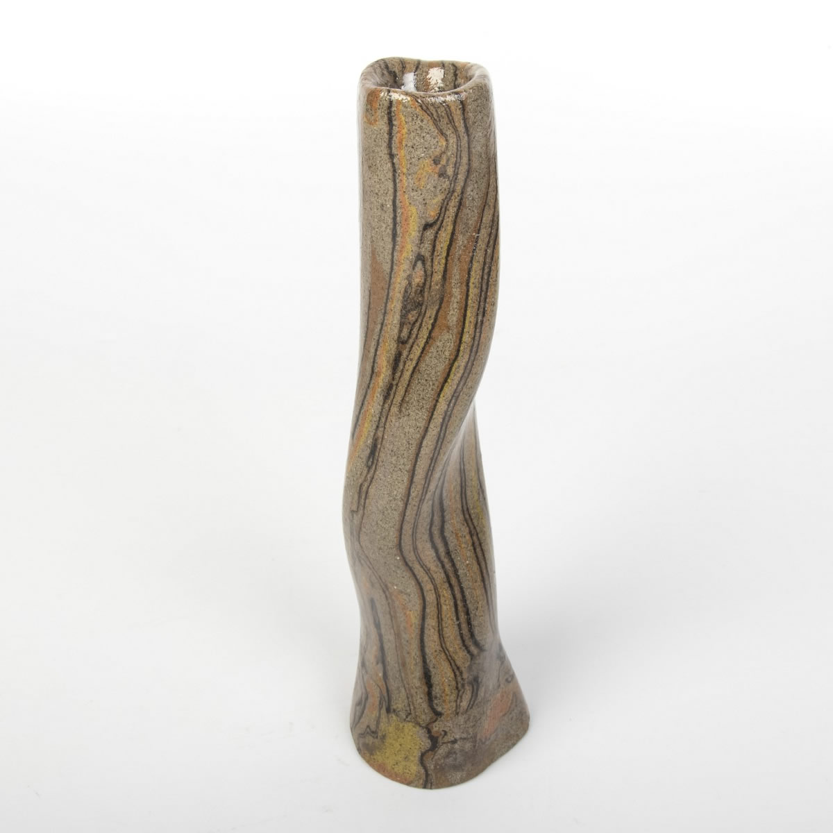 Wazon o nietypowej formie został starannie ukształtowany ręcznie, wykorzystując technikę agatową (marmurkową, Nerikomi). Proces ten obejmował precyzyjne łączenie kolorowych glin, a całość została pokryta lśniącym, przezroczystym szkliwem. Efektem tego starannego procesu jest nie tylko estetyczny, ale także praktyczny przedmiot.