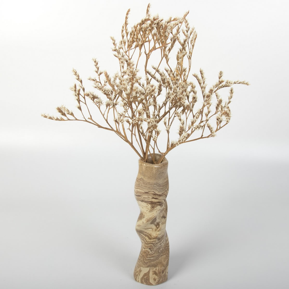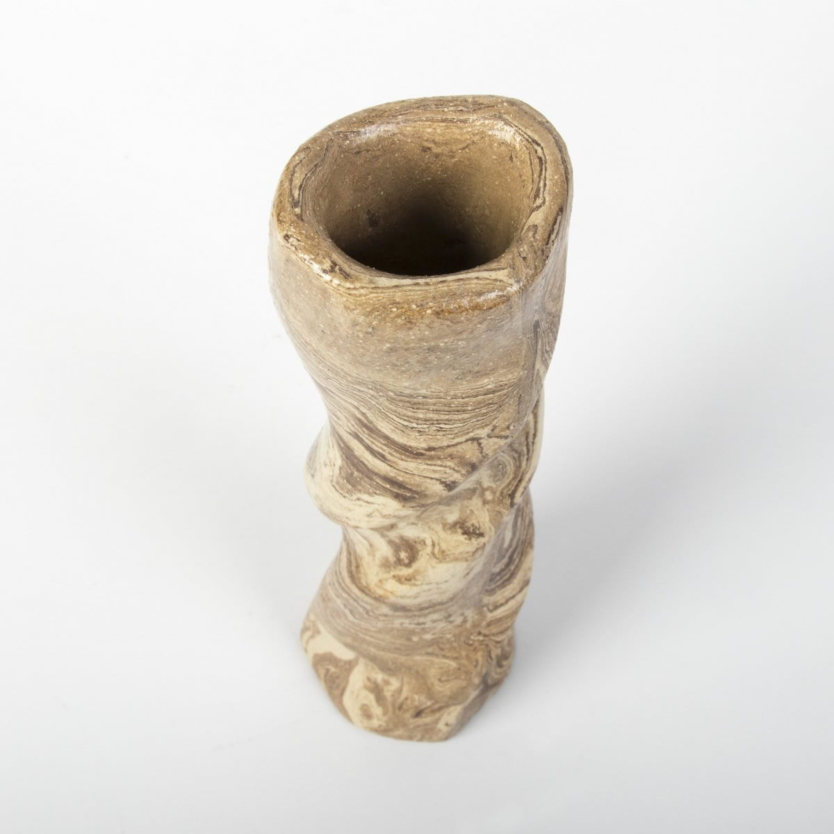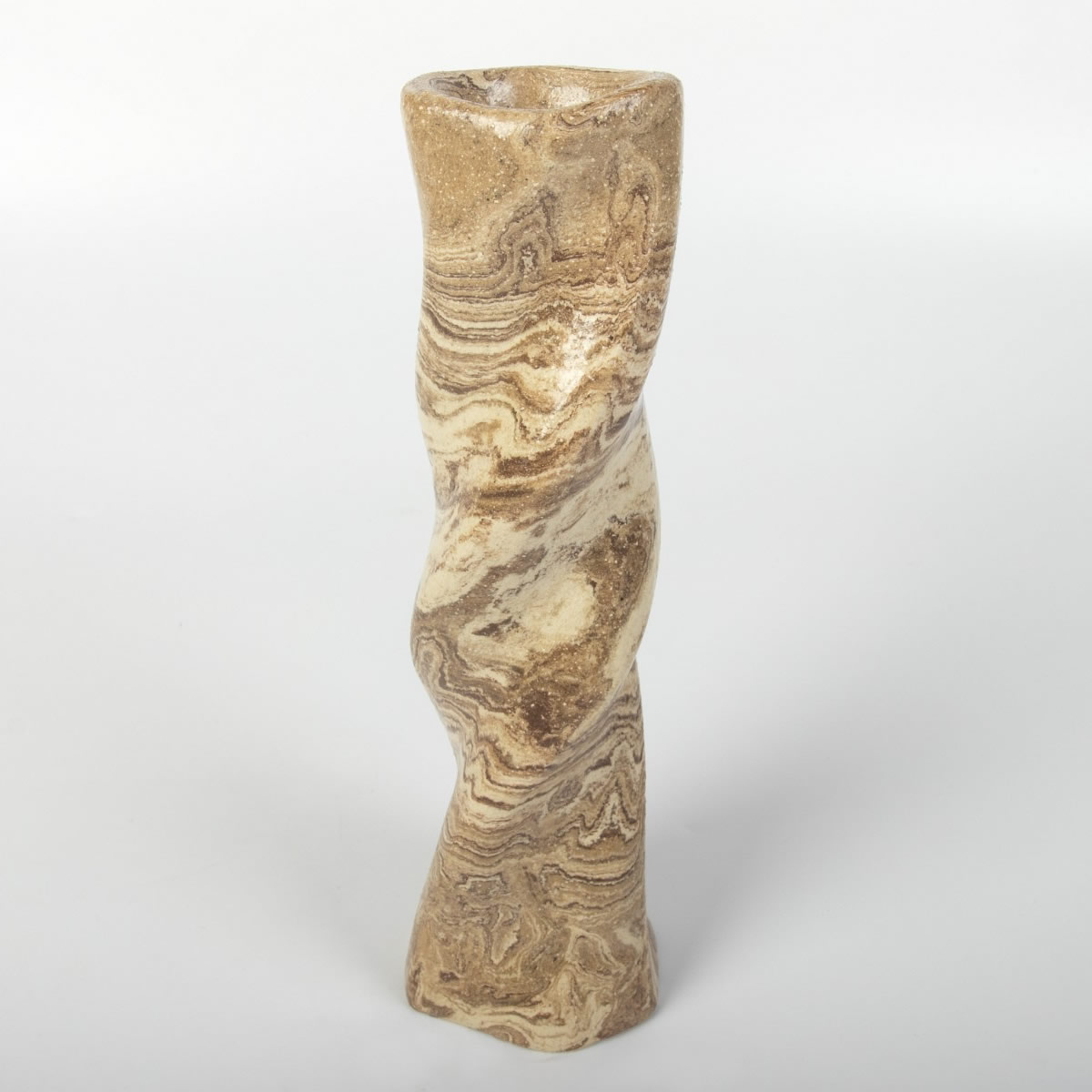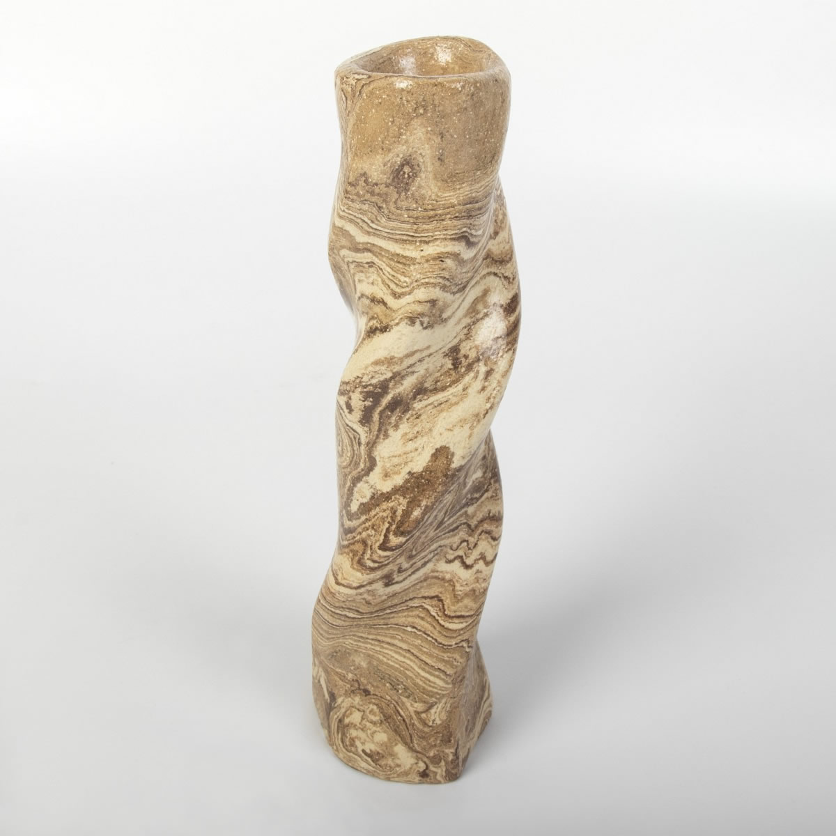 Ręcznie wykonany wazon ceramiczny o "pokręconym" kształcie. Dzięki zmieszaniu różnokololorowych glin uzyskaliśmy drewnopodobny wzór ze słojami. Kształt wazonu przypomina poskręcany naturalnie konar drzewa. Inspiracją w mojej pracy jest otaczająca nas przyroda, jej różne aspekty - piękno, niepowtarzalność, naturalność.