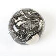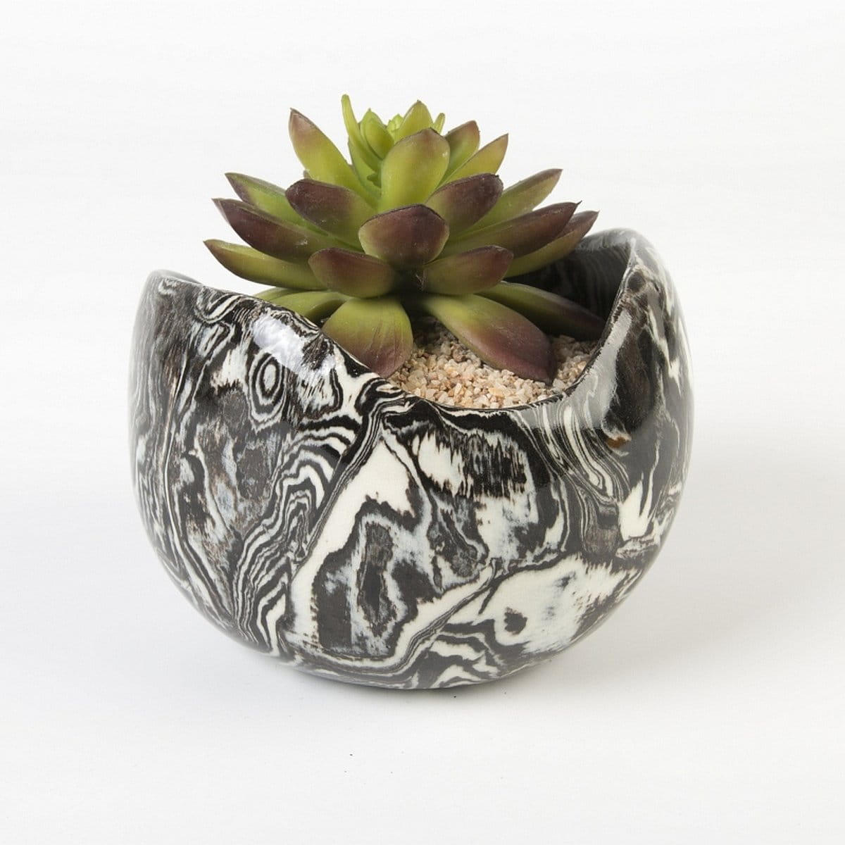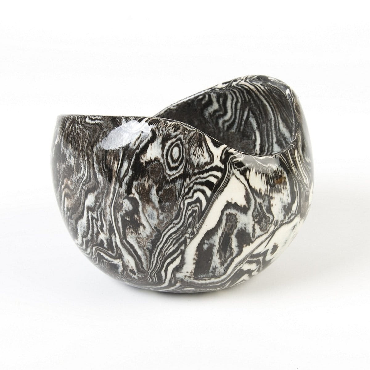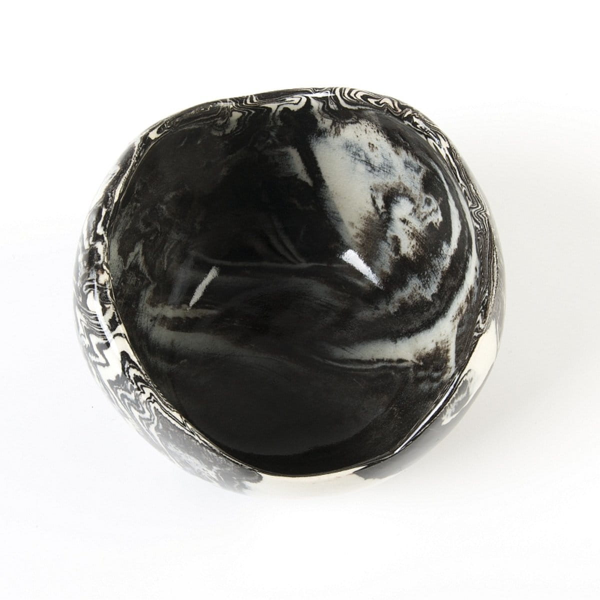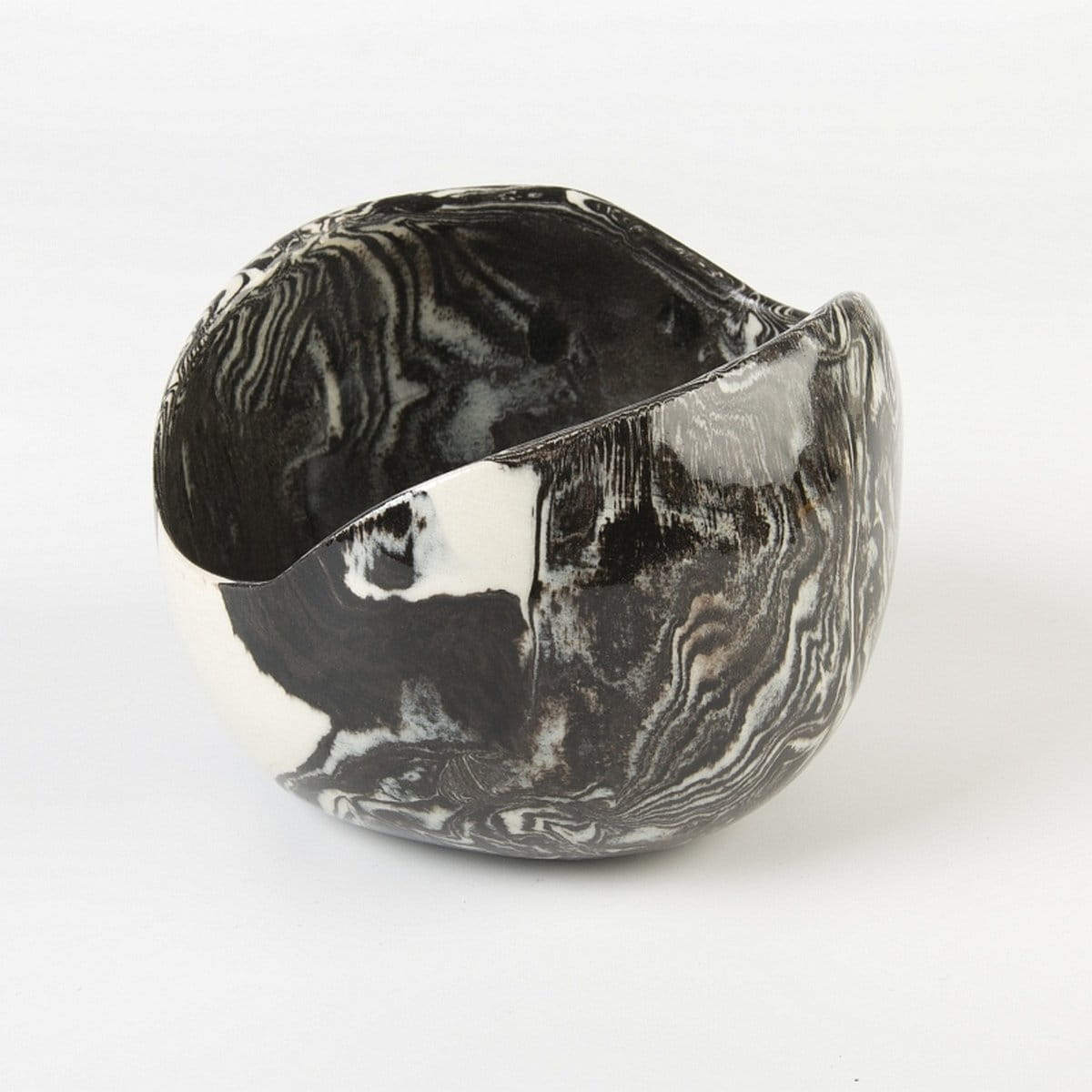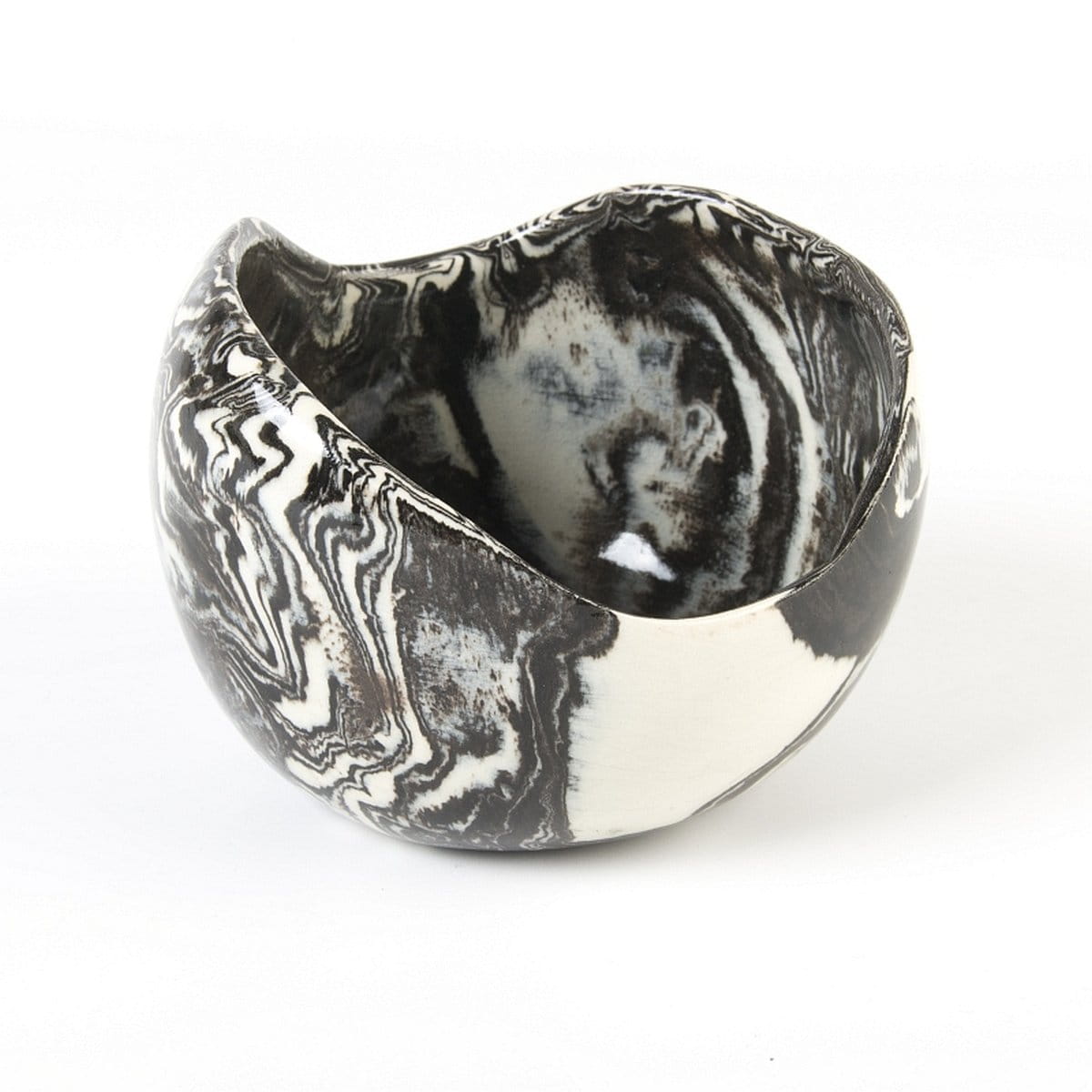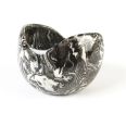 Naczynie ceramiczne, czarno-biała osłonka średniej wielkości (średnica ok. 11 cm, wysokość: 8 cm). Rękodzieło. Wykonana techniką ceramiki agatowej (ceramika marmurkowa, nerikomi, neriage) - technika ta jest rzadko stosowana z uwagi na jej czasochłonność oraz konieczność wykonywania pracy w sposób ręczny.
