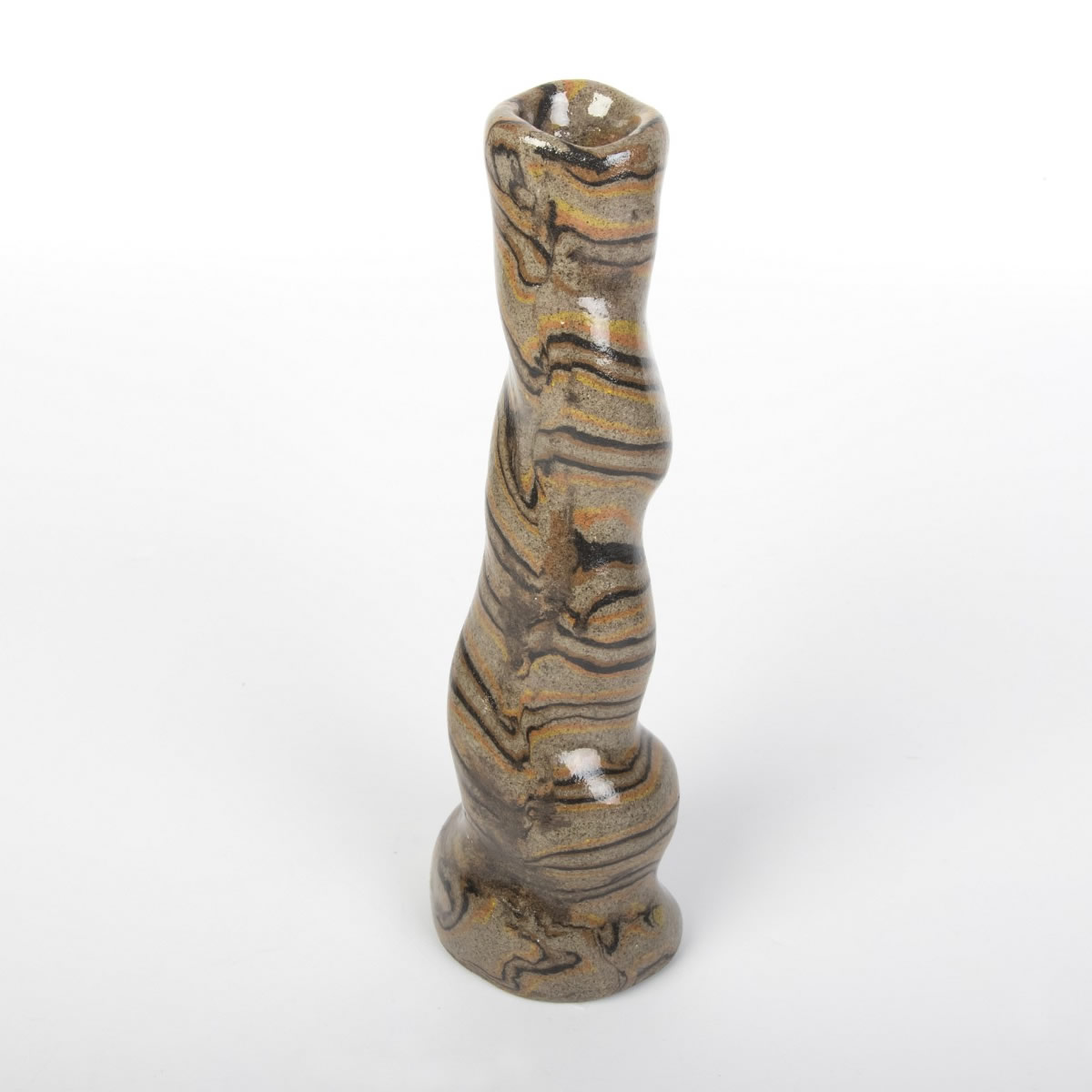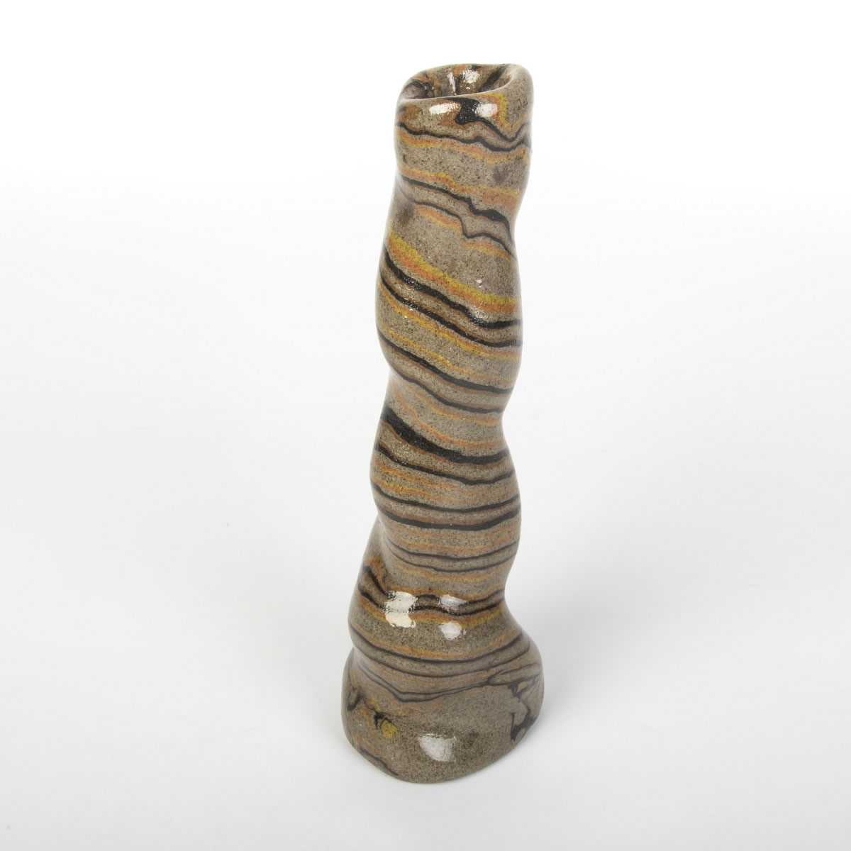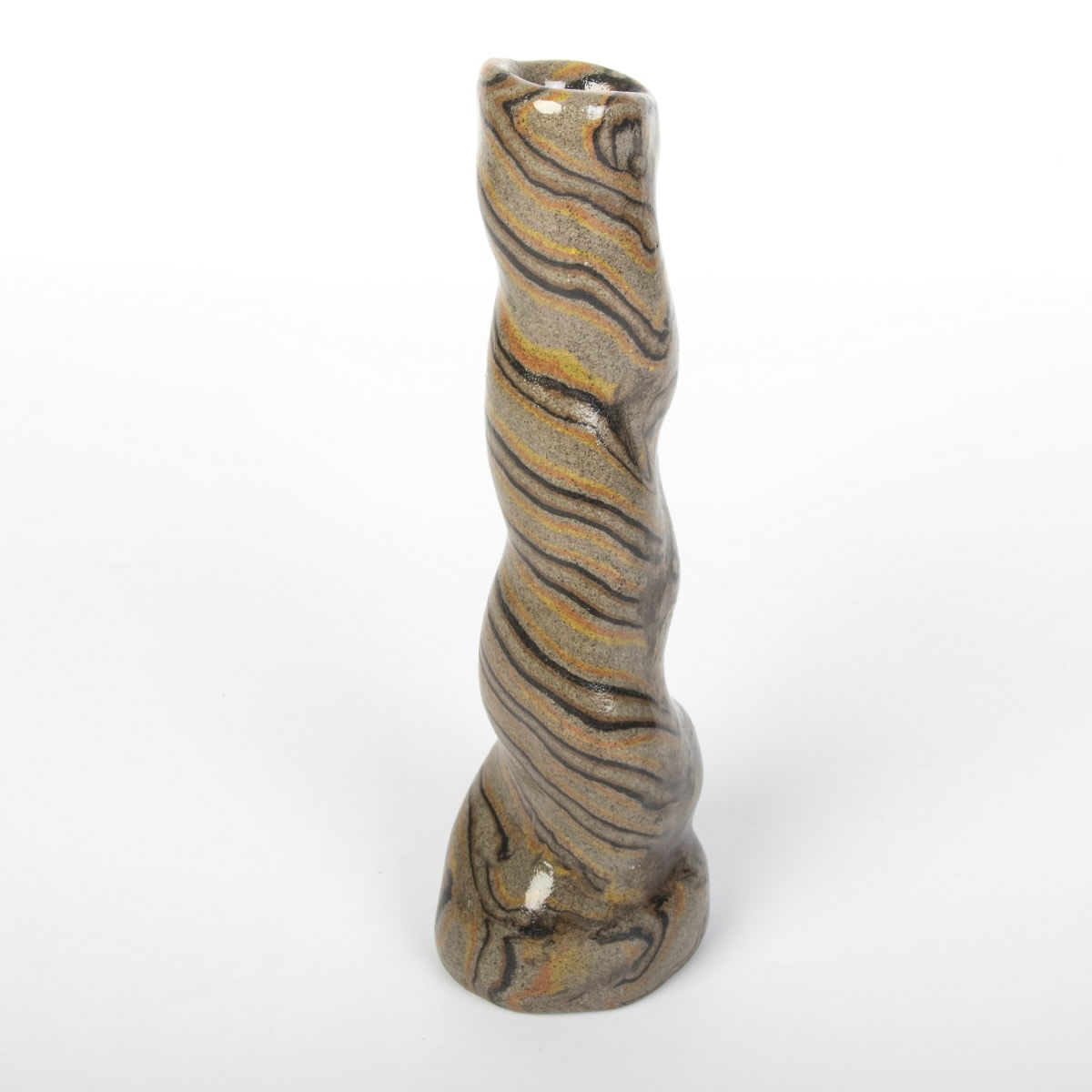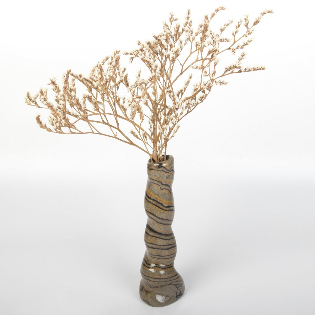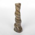 Wazon o nietypowej, spiralnej formie został precyzyjnie ukształtowany ręcznie, wykorzystując technikę agatową (marmurkową, Nerikomi). Proces ten obejmował staranne łączenie kolorowych glin, a całość została pokryta lśniącym, przezroczystym szkliwem. Wynikiem tego starannego procesu jest nie tylko estetyczny, lecz również praktyczny przedmiot, idealny do eksponowania ciętych kwiatów lub suchych kompozycji. Wazon reprezentuje udane zestawienie elegancji z funkcjonalnością.